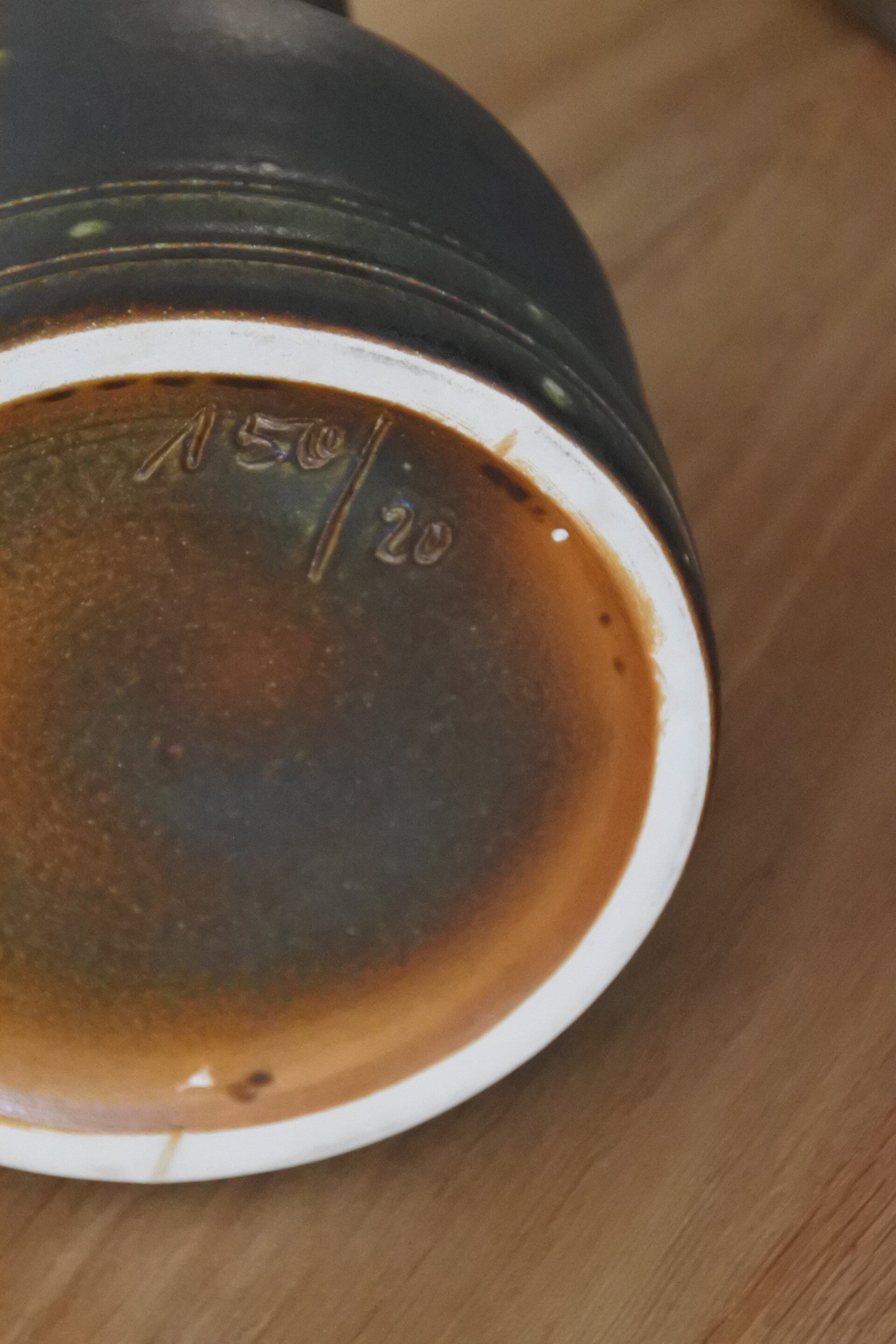 Mooie vintage olijfkleurige vaas van keramiek met prachtige groene en goudkleurige nuances op een matte ondergrond en een verfijnde streepjes rondom.