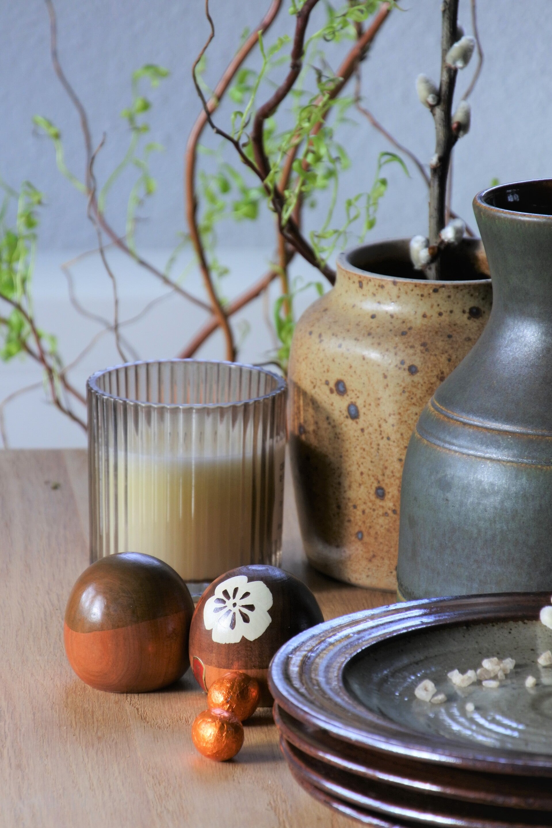 Mooie vintage bloempot van groen aardewerk met kleine natuurlijke spikkeldetails in donkerbruin.