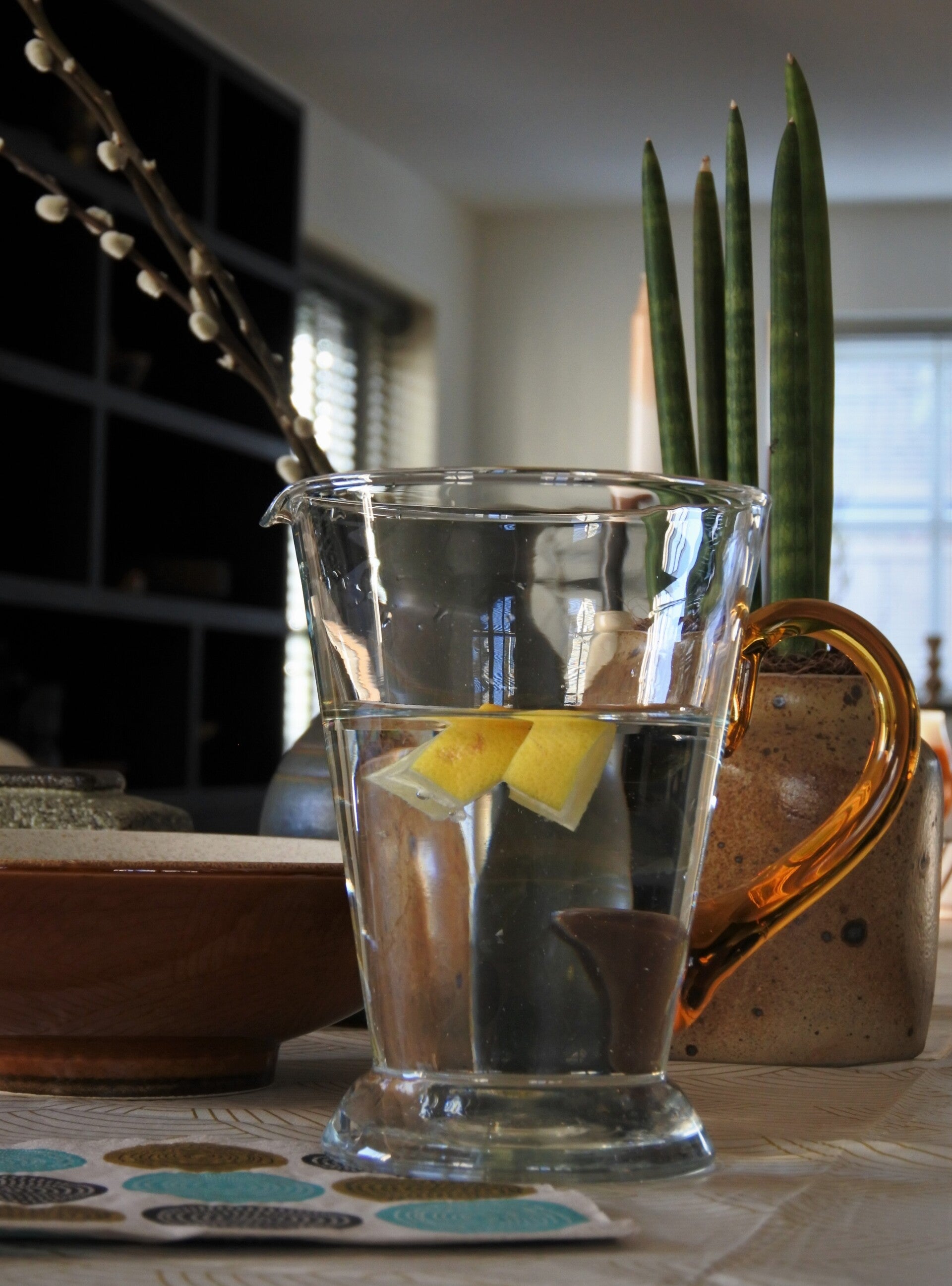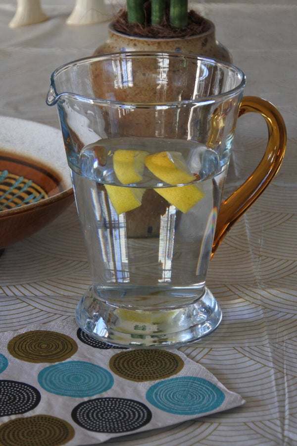 Mooie vintage waterkaraf van doorzichtig glas met een dik voetje en een handvat in caramelkleur glas.