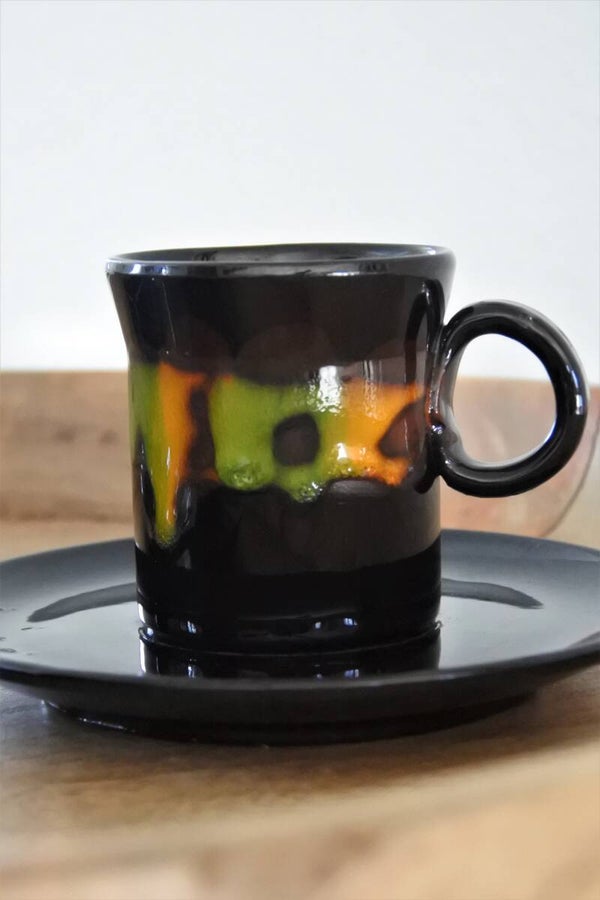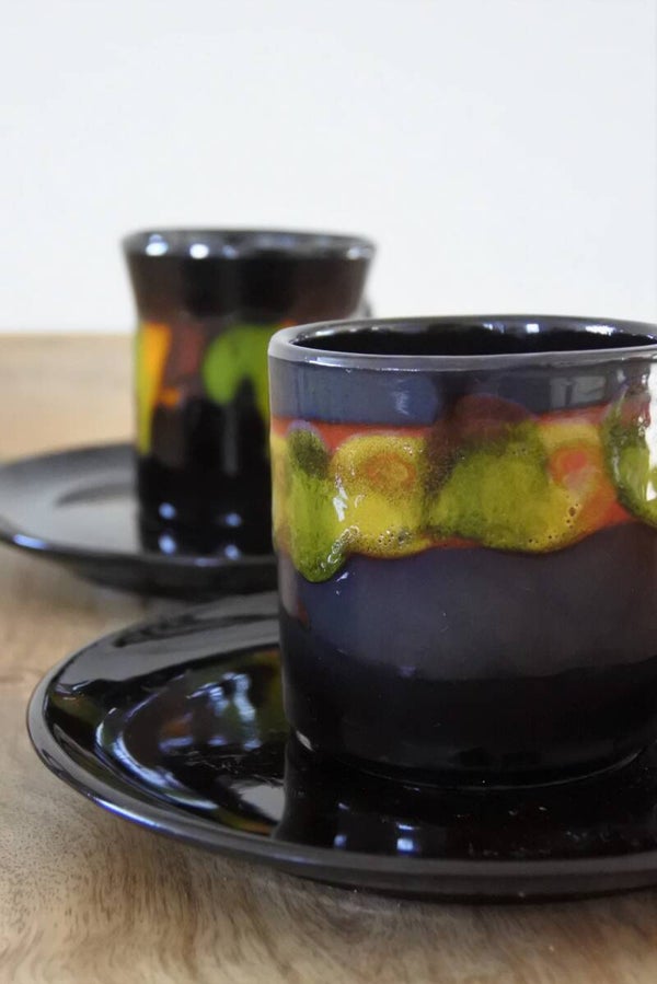 Deze te gekke koffiekop en schotel set van 3 kop en schotels schreeuwt toch gewoon vintage? We hebben 2 sets beschikbaar waarvan 1 in zwart-rood 2 stuks en 1x groen-zwart of zwart met fat lava in geel-groen.
