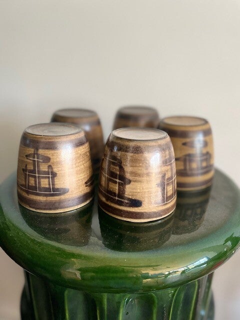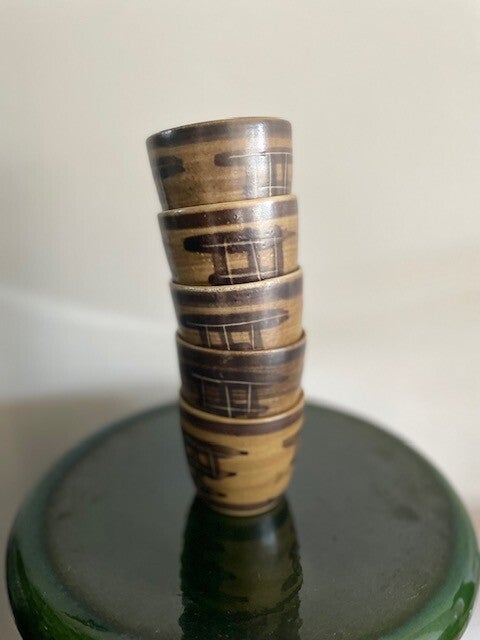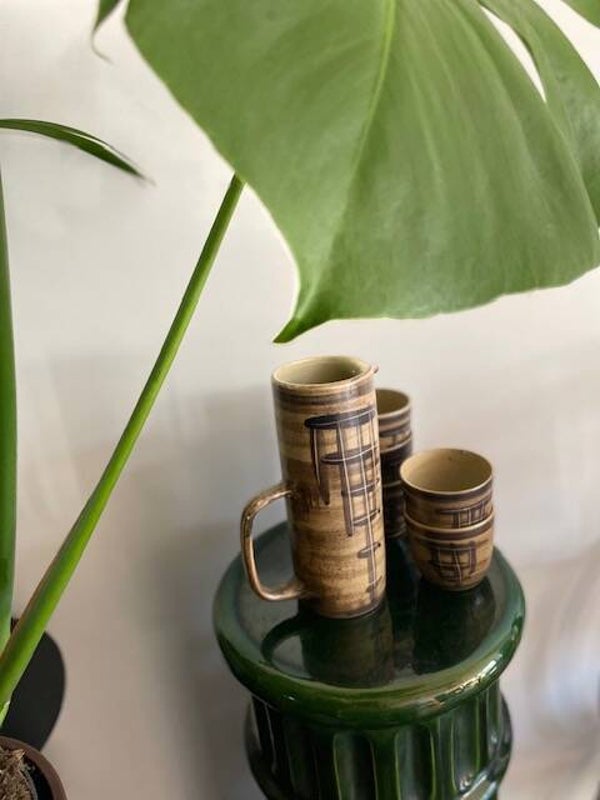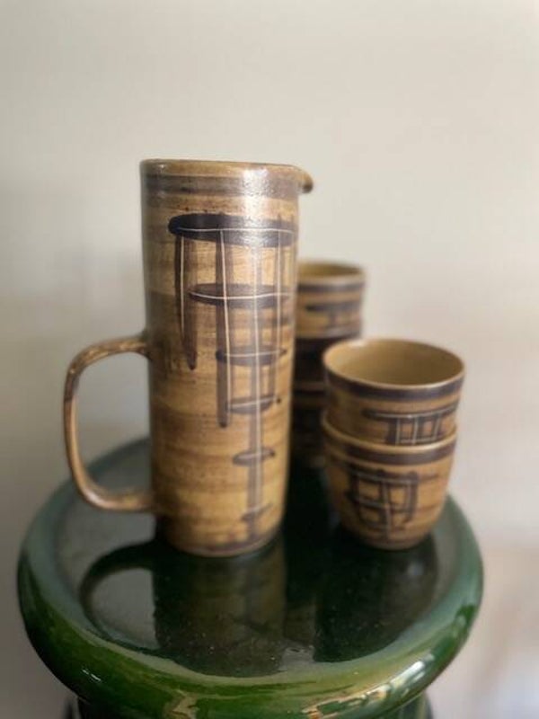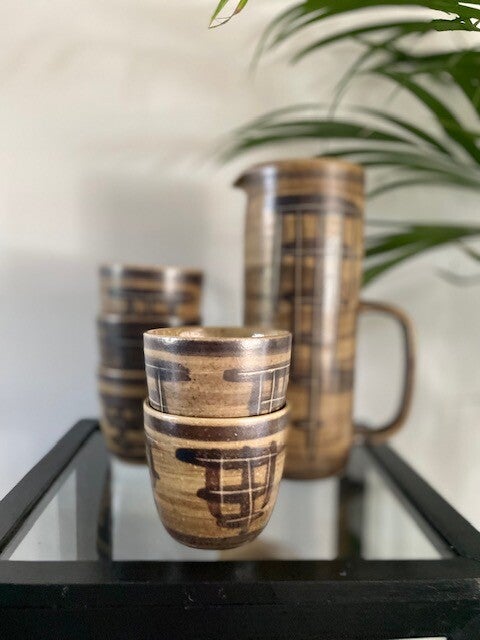 Vintage set van 5 prachtige bekers en een karaf van NL design Bodem Ambacht Volendam. En het woordje ambacht voor Volendam is als je het ons vraagt helemaal terecht! aan deze set zie je nog dat het met liefde en vakmanschap is gemaakt, je zou er bijna niets uit durven te drinken.. maar wel doen hoor! want je drankje smaakt extra lekker uit zo'n mooie set.