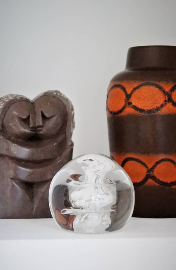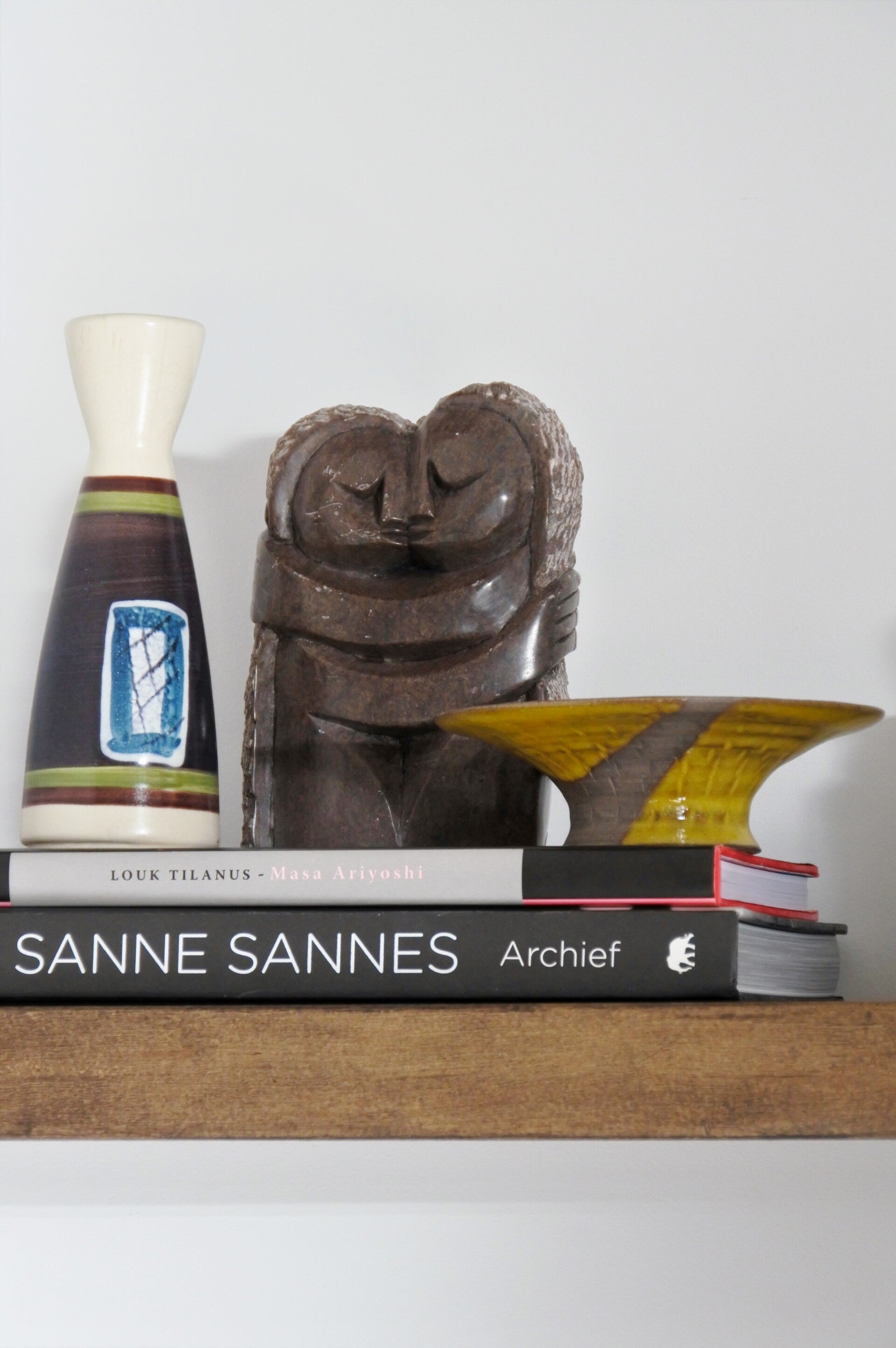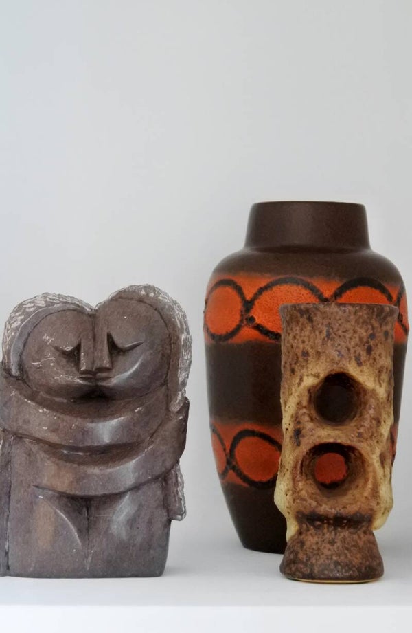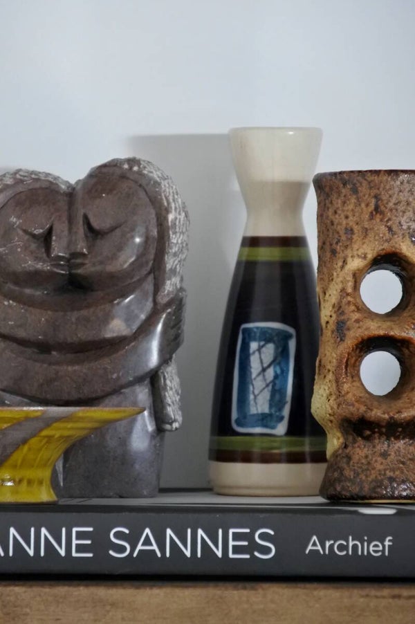 Prachtig beeld vervaardigd uit 1 stuk natuursteen in taupe-grijze kleur en wit. Wij hebben dit beeldje liefkozend kusje genoemd omdat het gewoon een moppie van een beeld is, ze elkaar een kusje geven en omdat we zelf zin krijgen in een kusje als we hier te lang naar kijken. Als dat geen liefde voor een vintage item is..