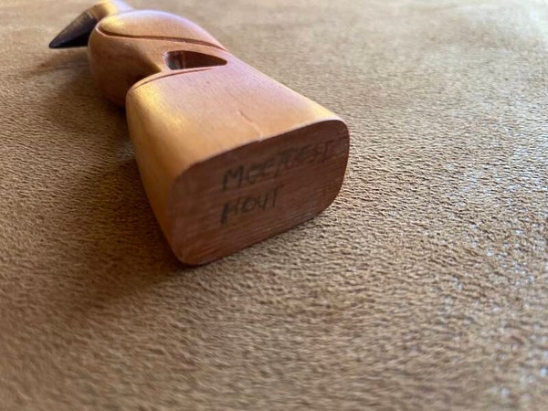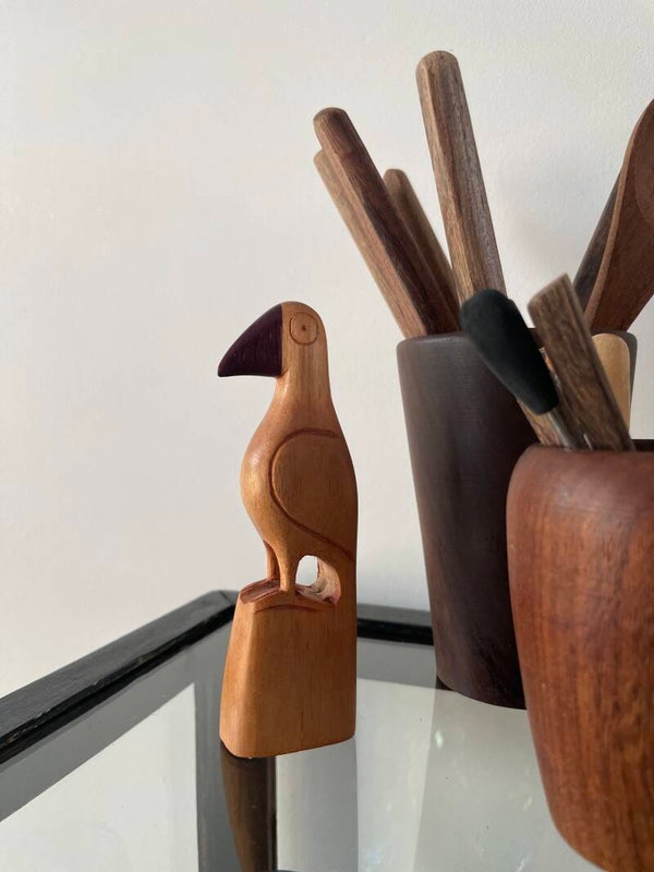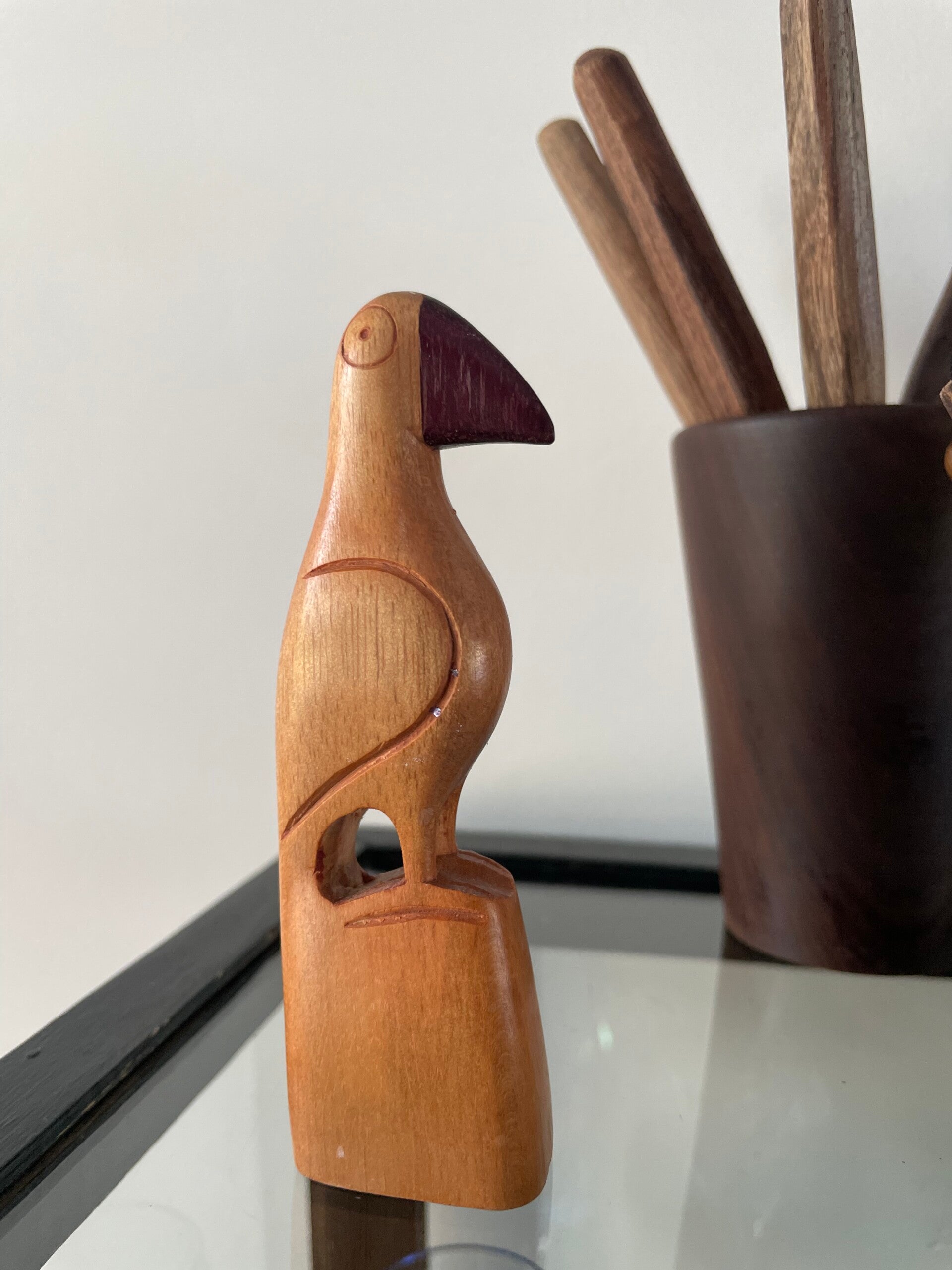 Leuk parmantig toekan beeldje op klein voetje uit 1 stuk moetoesi hout gesneden. Hoe weten jullie dat dan horen we je denken? Nou, dat stond op de onderkant ;)