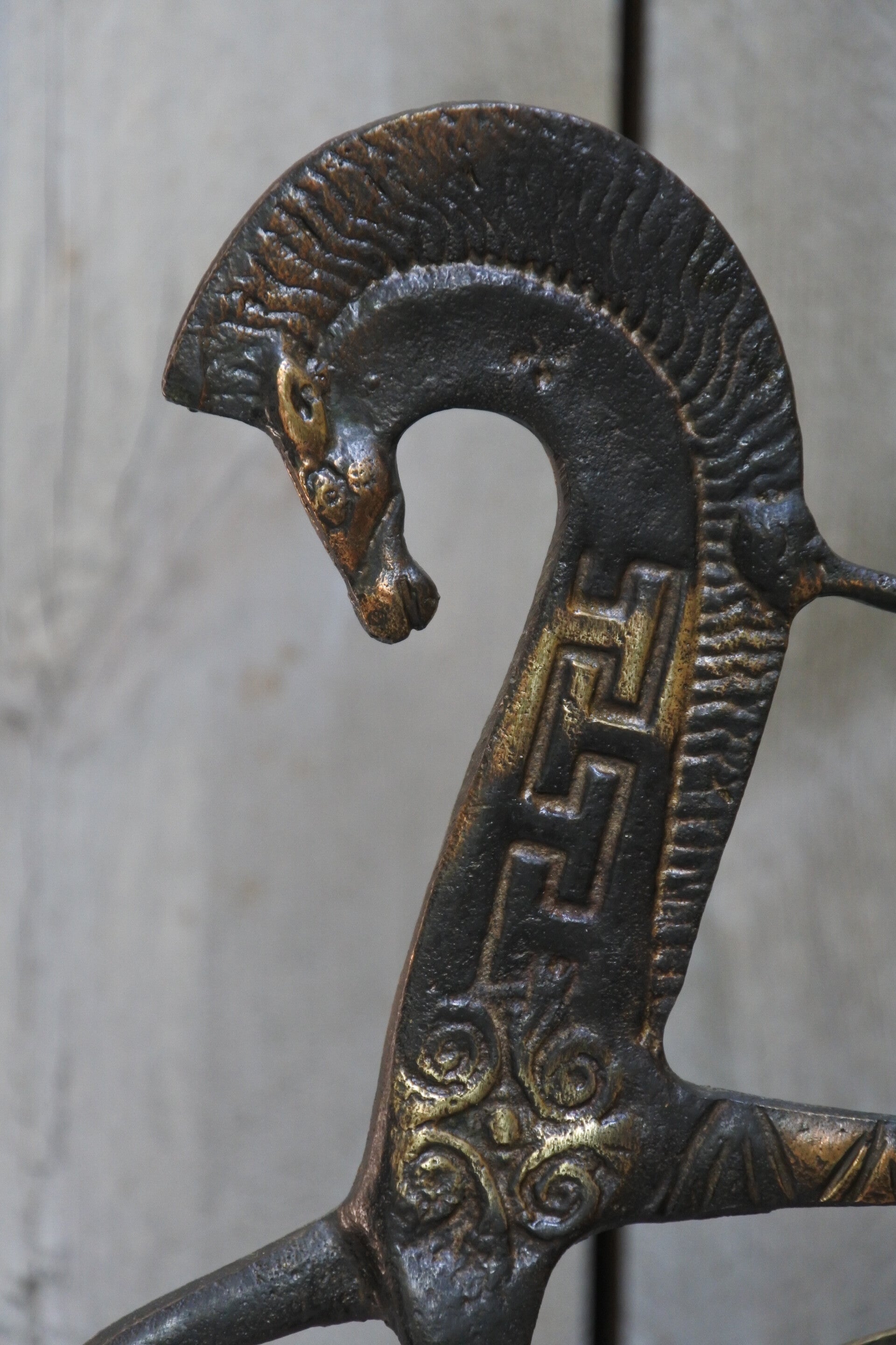 Prachtig vintage Etruskisch paard van brons en is gepatineerd met goudkleurige details. Dit gave item komt uit de jaren 60 en is gemaakt in de stijl van Amerikaanse ontwerper Frederick Weinburg die zijn versie van het etruskisch paard ontwierp en hiermee grote faam vergaarde.