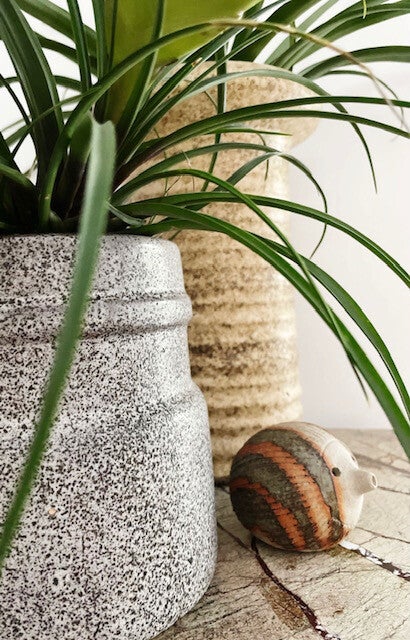 Mooie licht grijze vintage bloem-plantenpot met mooie sierrand en een kleine spikkel allover.