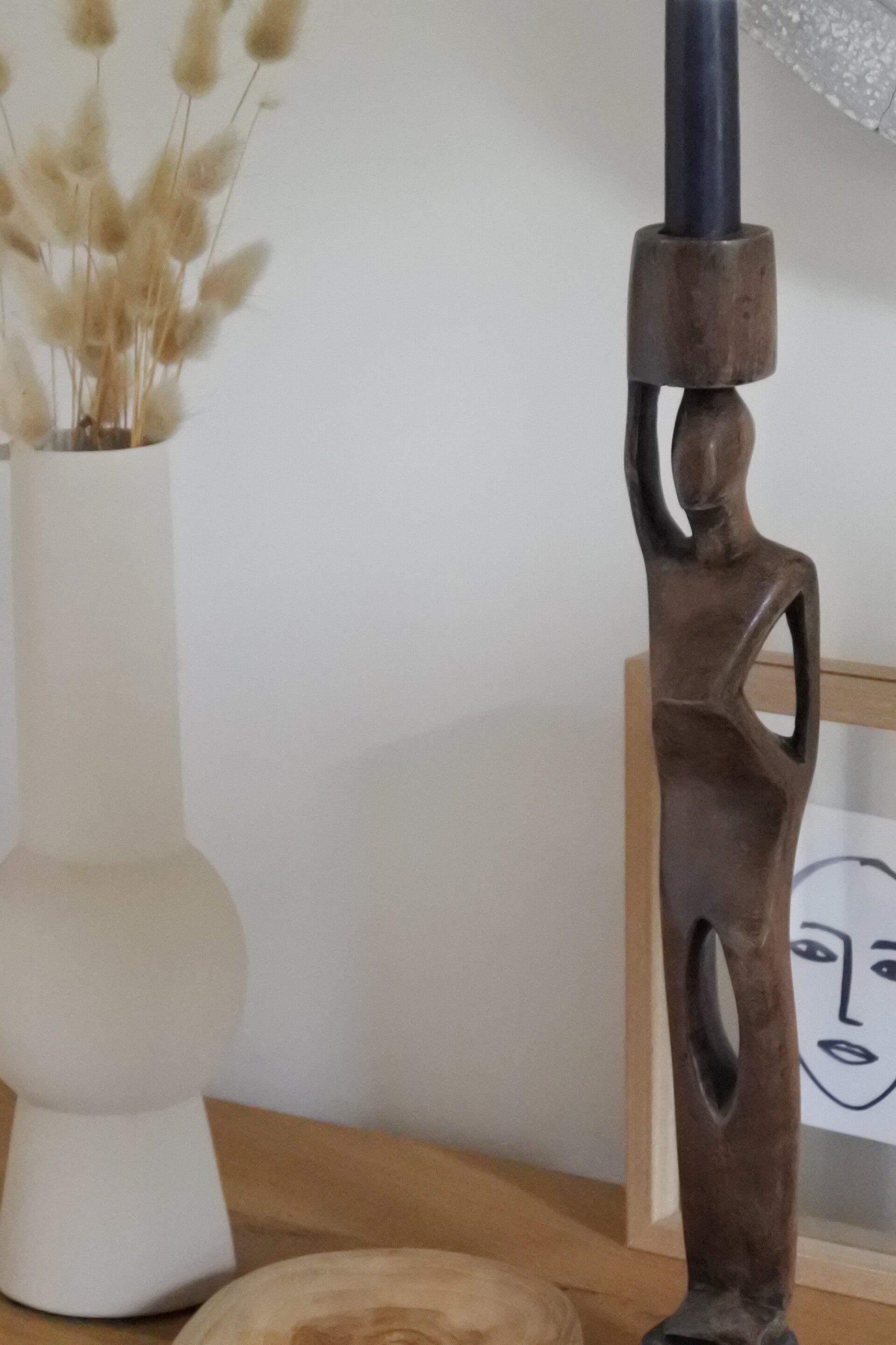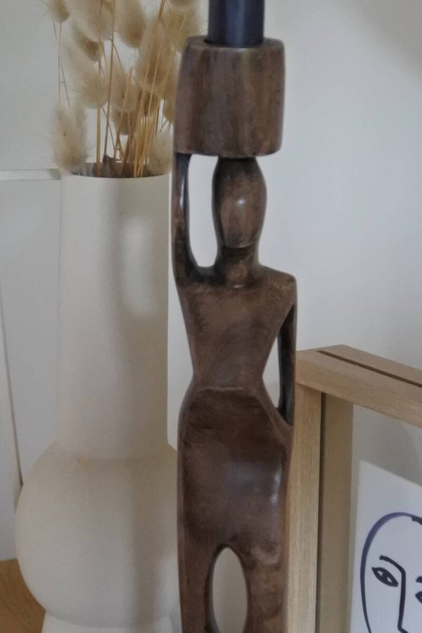 Mooie vintage houten kandelaar van een beeldige dame met vrouwelijke vormen.