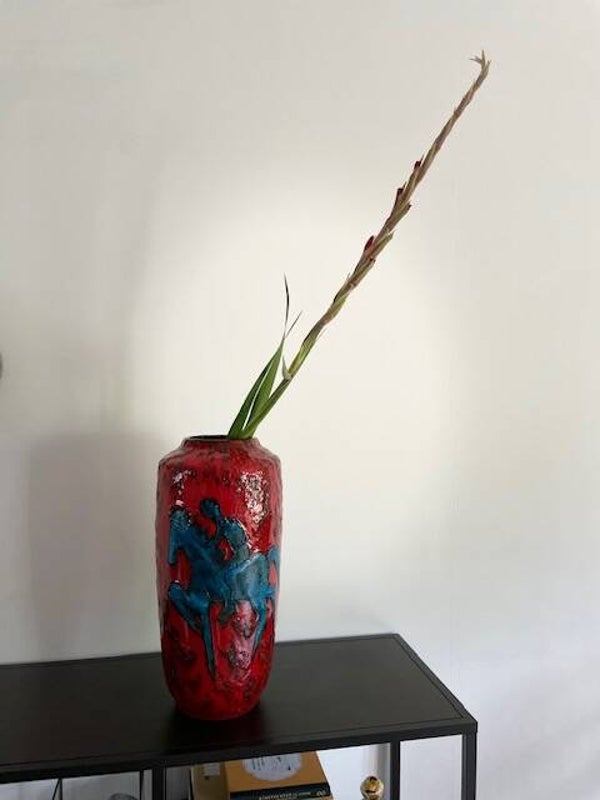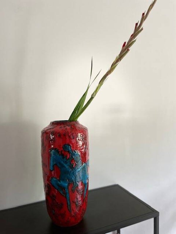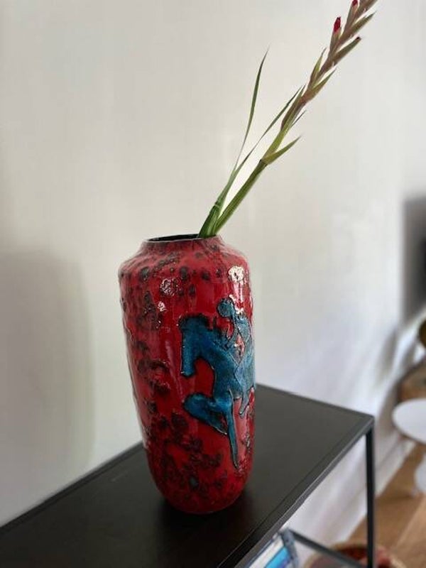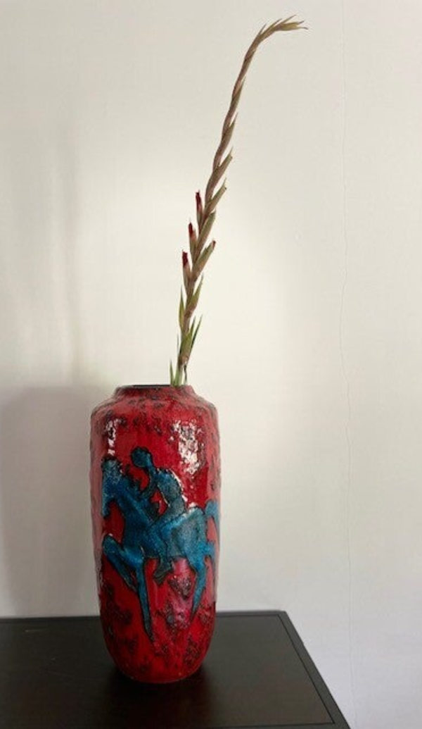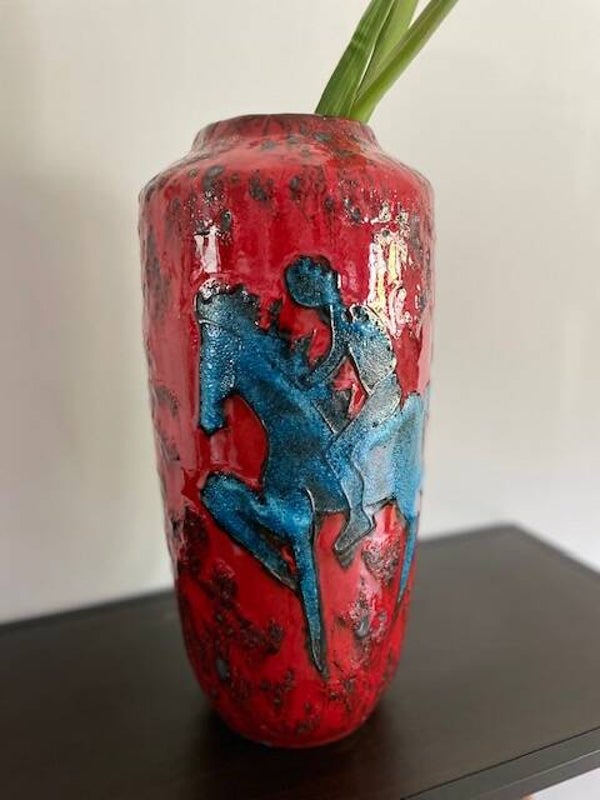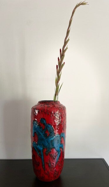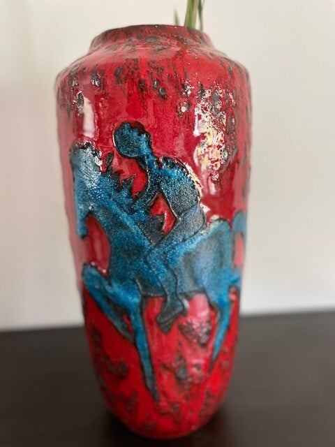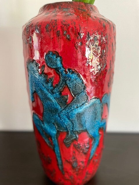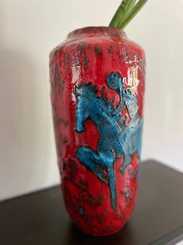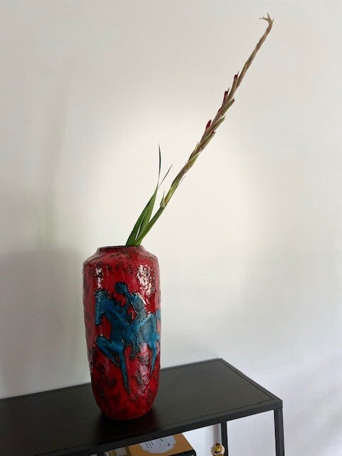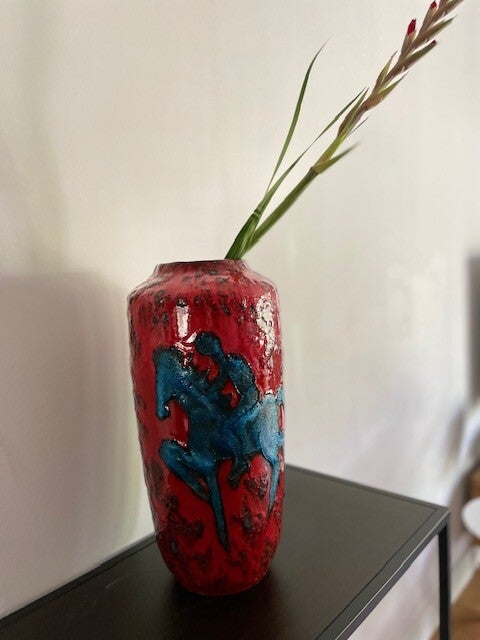 Prachtige vintage West Germany vaas van Scheurich in rood met zwart en een blauwe ruiter. We begrijpen.. dit decor is niet voorbestemd voor een muurbloempje maar eerder voor een funky nelly (beide niets mis mee natuurlijk). De vaas heeft een dik bruisglazuur en gave glans.. zucht.. waarom verkopen we deze ook alweer?