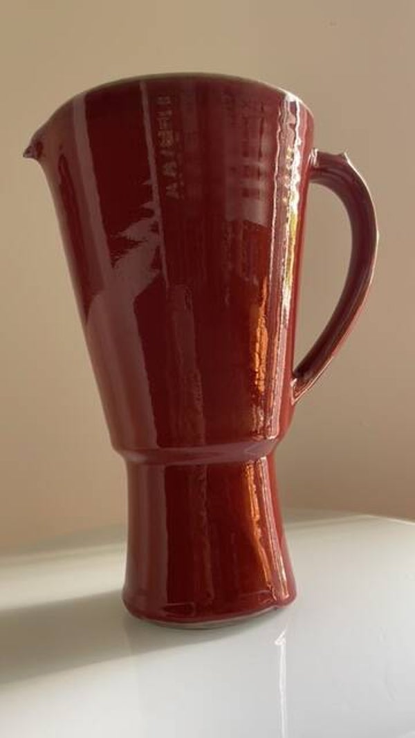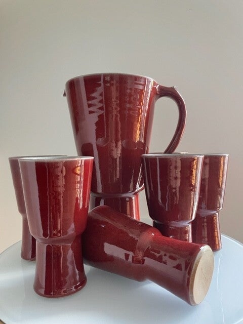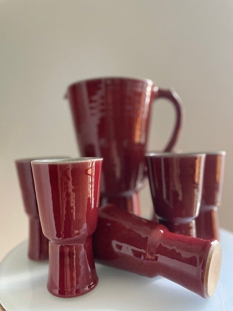 Deze vintage karaf met (6) bekers set heeft een mooie dieprode tegen het bordeaux aan kleur met een lichtgrijs glazuur aan de binnenzijde. De set heeft een tijdloos strak design en is een feestje op welke tafel. De bekers zijn een soort roemers maar ook heel geschikt om te gebruiken als water of melk bekers.