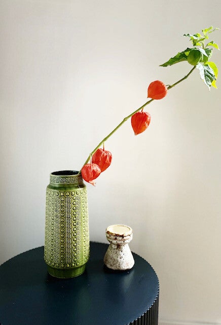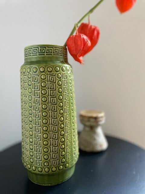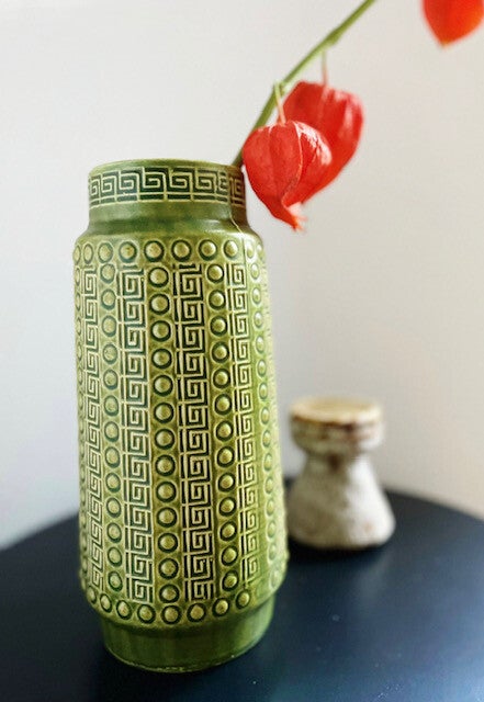 Prachtige vintage West Germany vaas van AK Keramik (Alfred Klein) is een speciaal design want.. niet vaak kom je deze mooie relief vaas tegen. Het design lijkt lichtjes geinspireerd op de griekse stijl maar de vaas heeft toch weer die typische 70's kleur in olijfgroen. Een echte mooierd deze vaas!