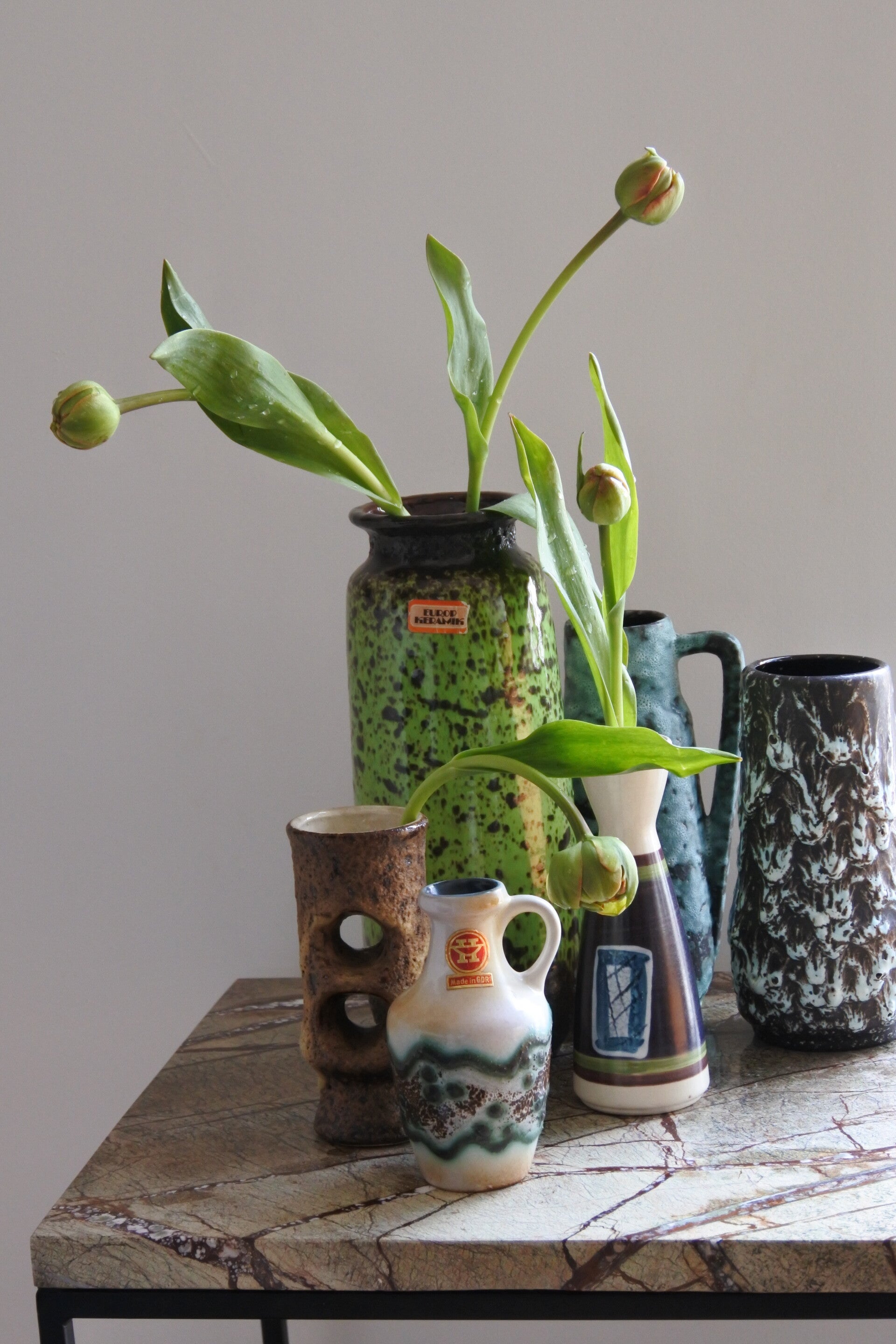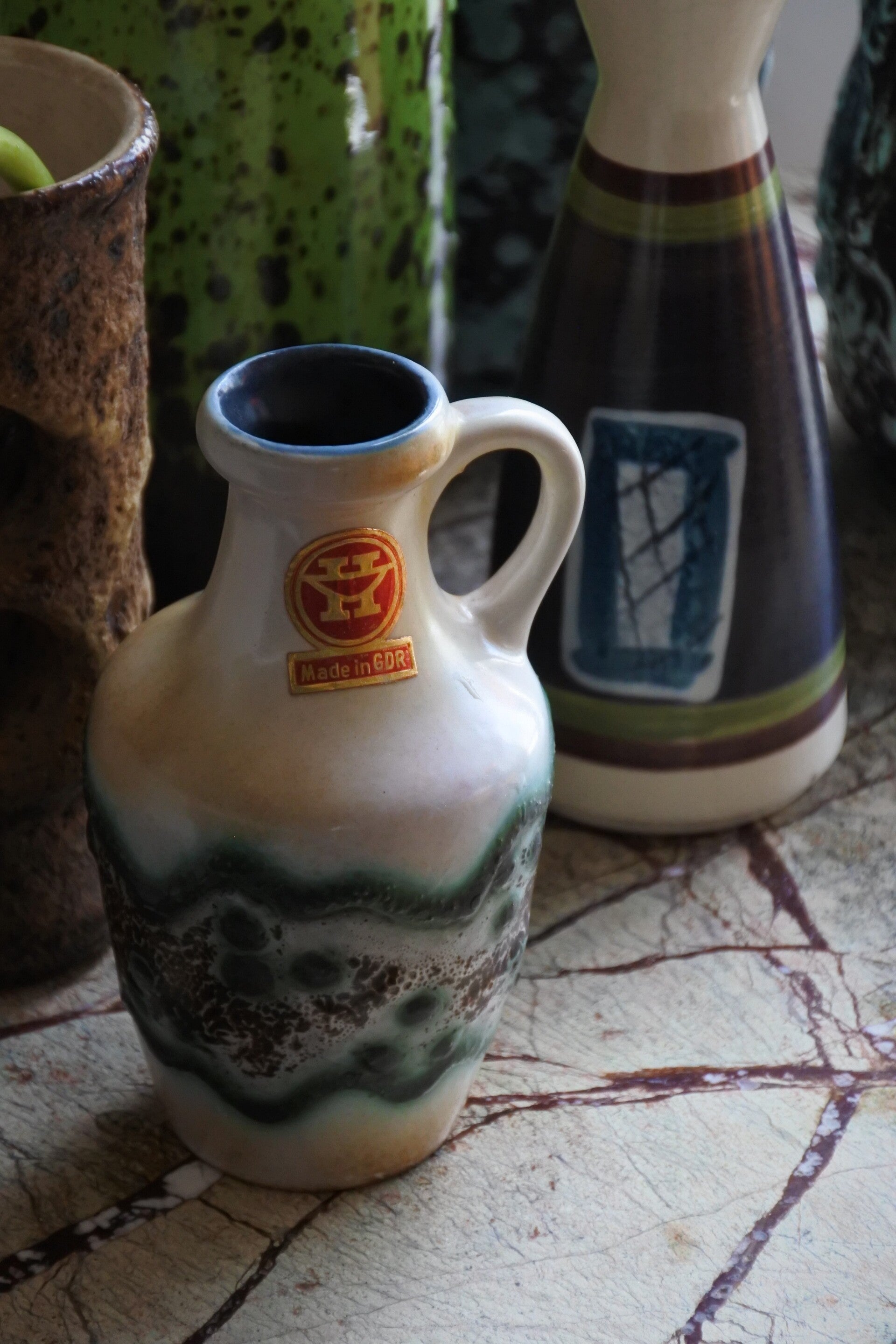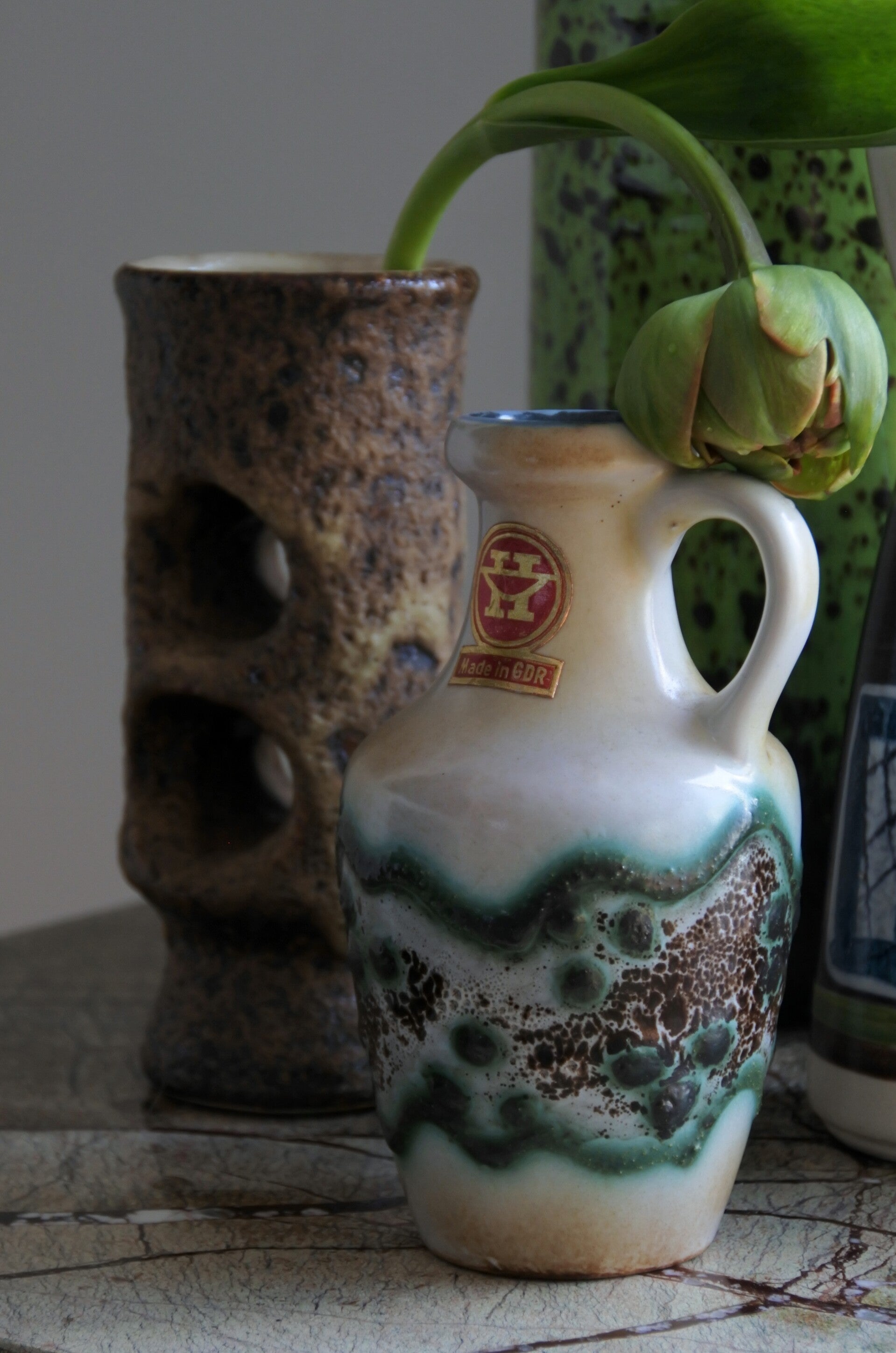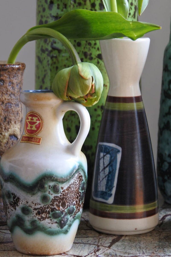 Prachtig vintage vaasje van Dümler & Breiden, West Germany. Deze vaas heeft een frisse grasgroene kleur, een roomwit kleurende onderkant en donkerbruine accenten.