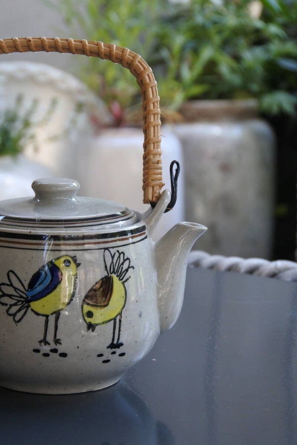 Leuintage theepot van aardewerk met grijs glazuur en schildering van 2 vogeltjes. De pot heeft een leuk rotan handvat en een beetje die scandi look. Naast praktisch is deze toffe theepot ook helemaal leuk als decoratie op een tafel of in de servieskast-plank natuurlijk!