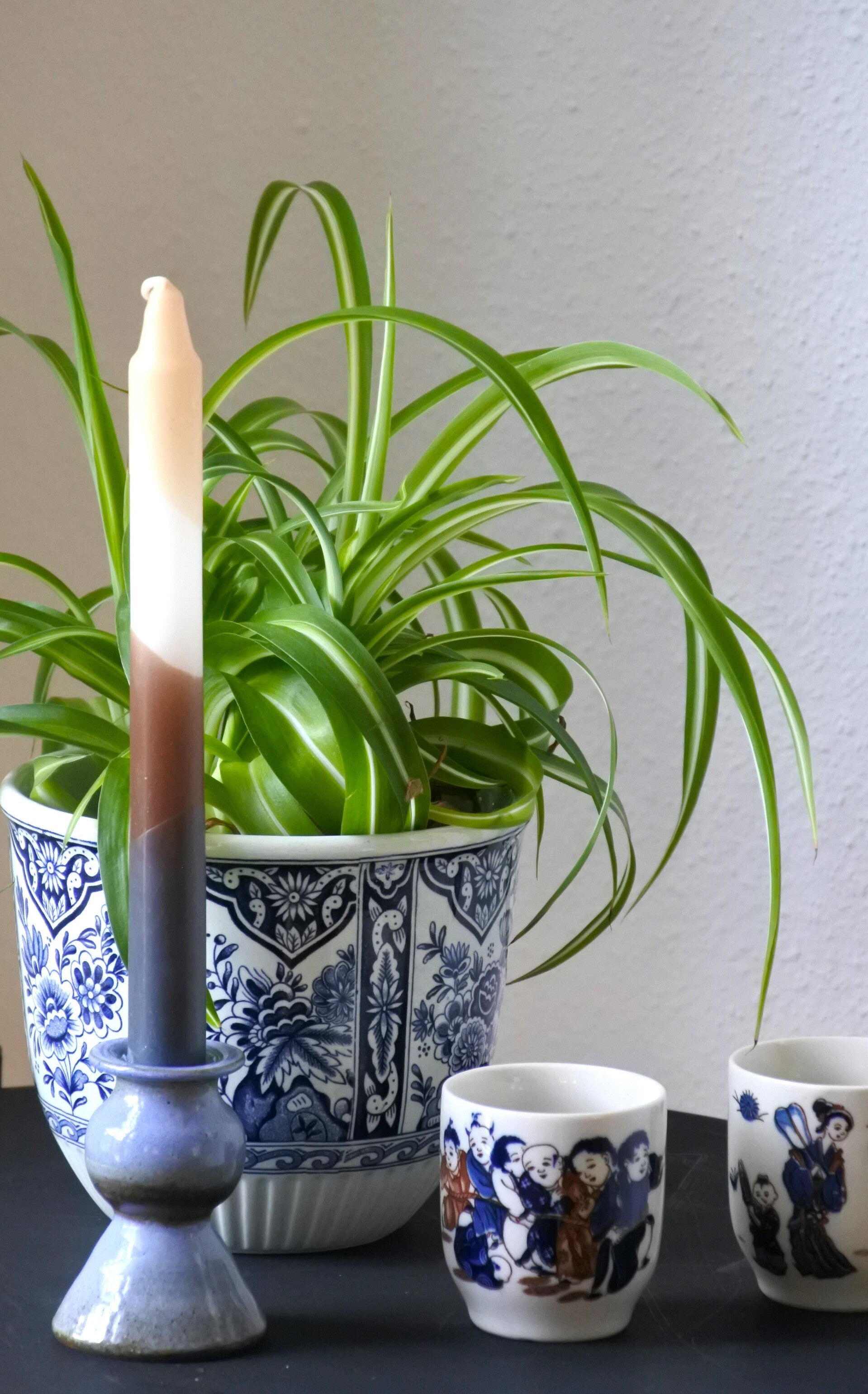 Leuke vintage kandelaar van blauw geglazuurd keramiek met mooie kleurnuances.
