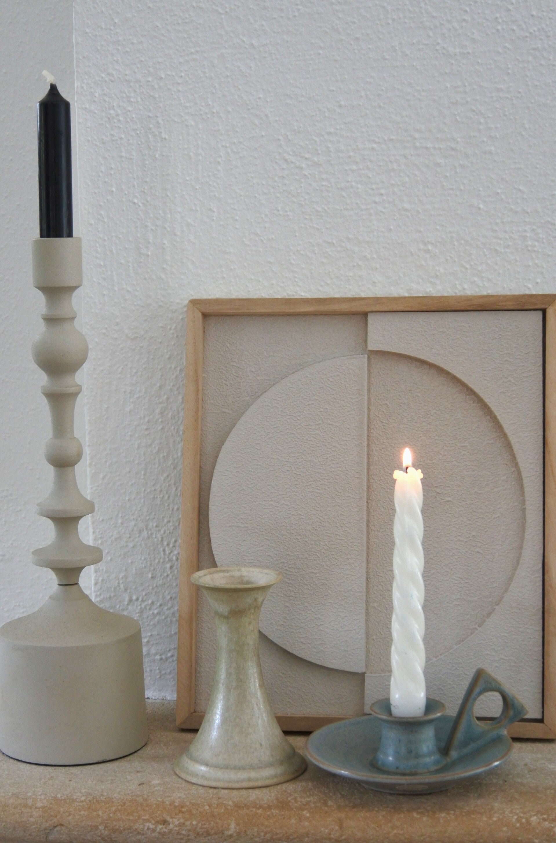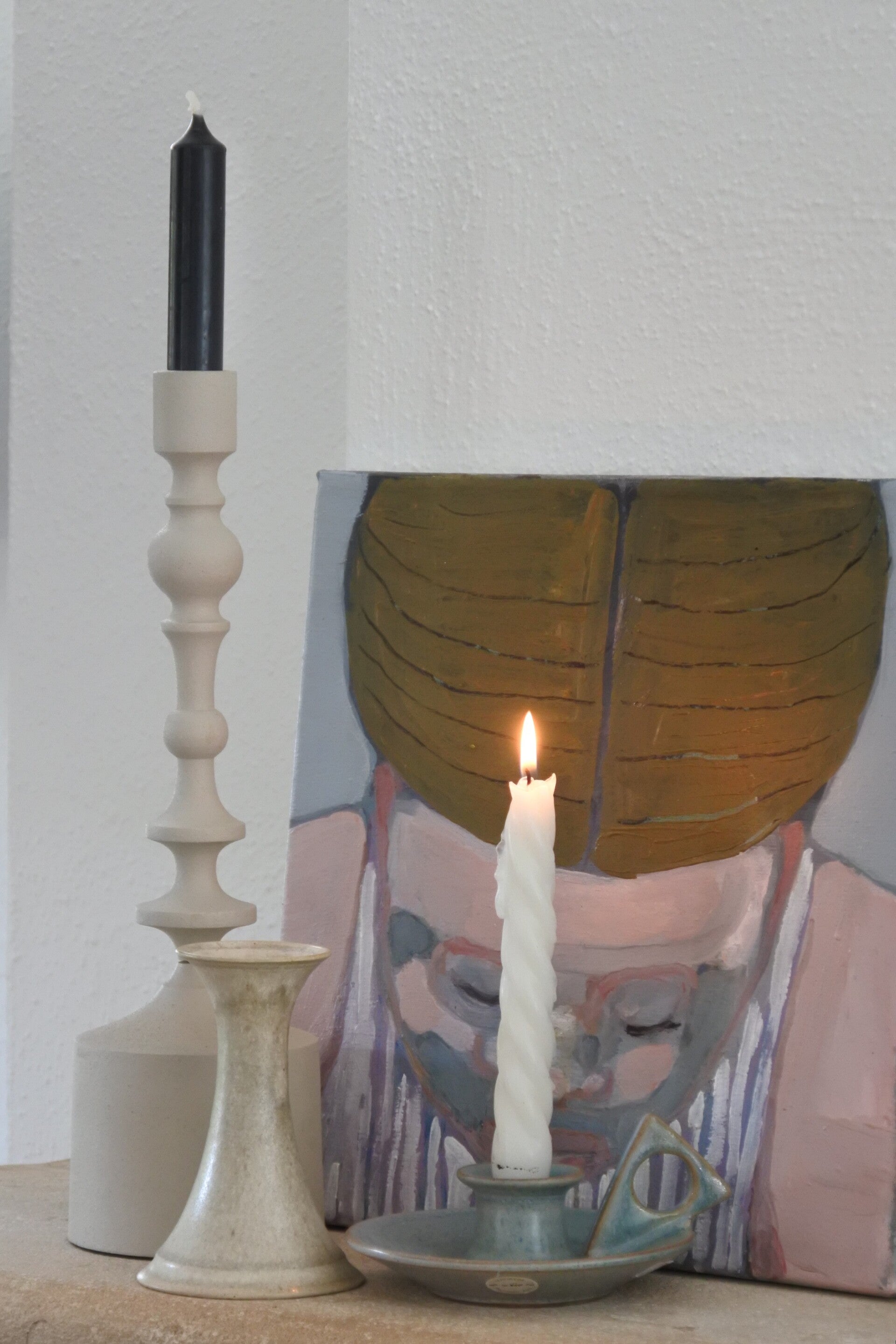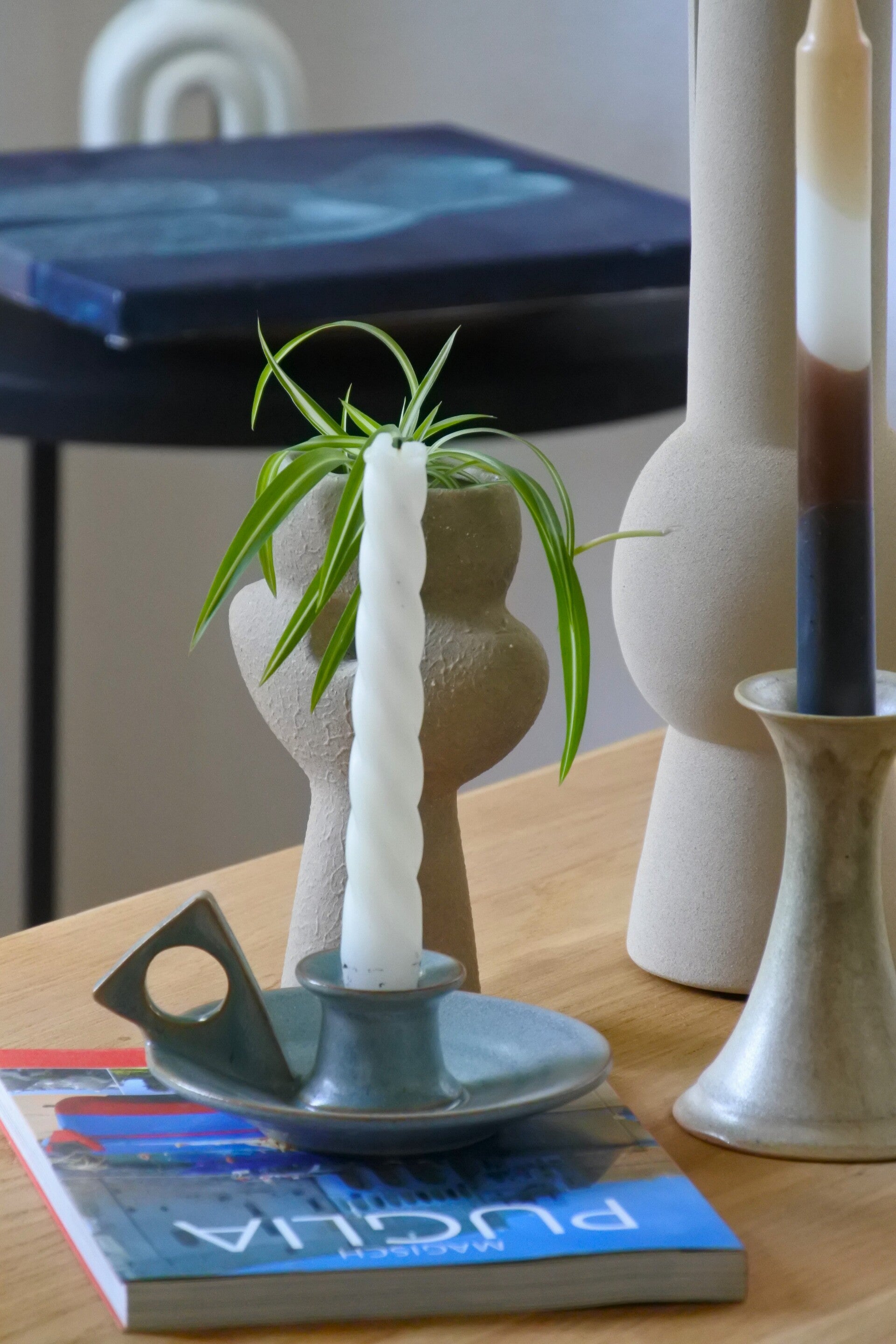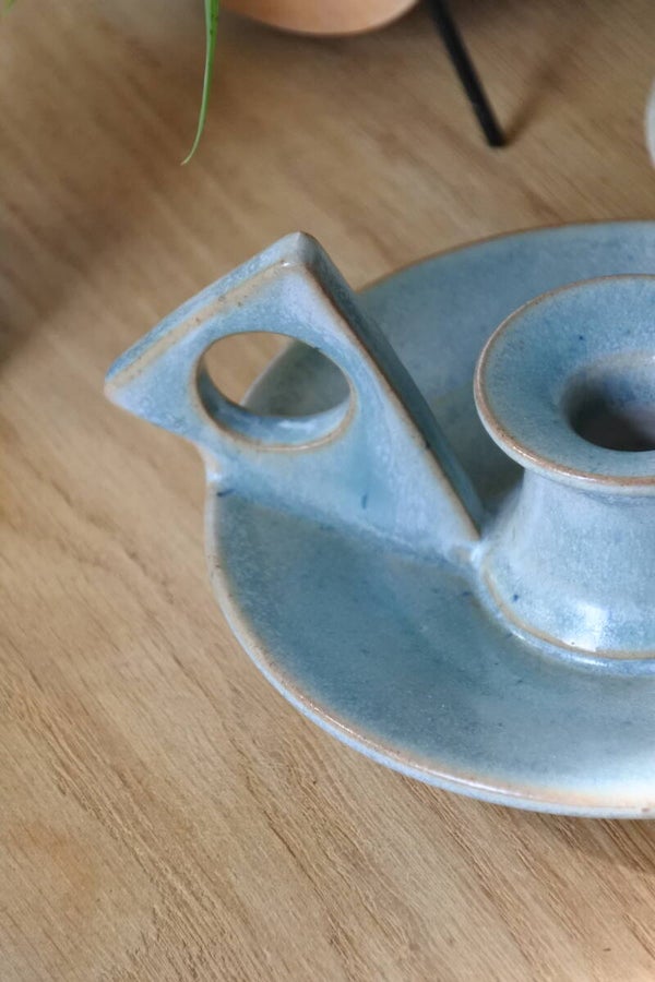 Leuke vintage kandelaar van lichtblauw geglazuurd keramiek met mooie kleurnuances en leuk modern oortje.