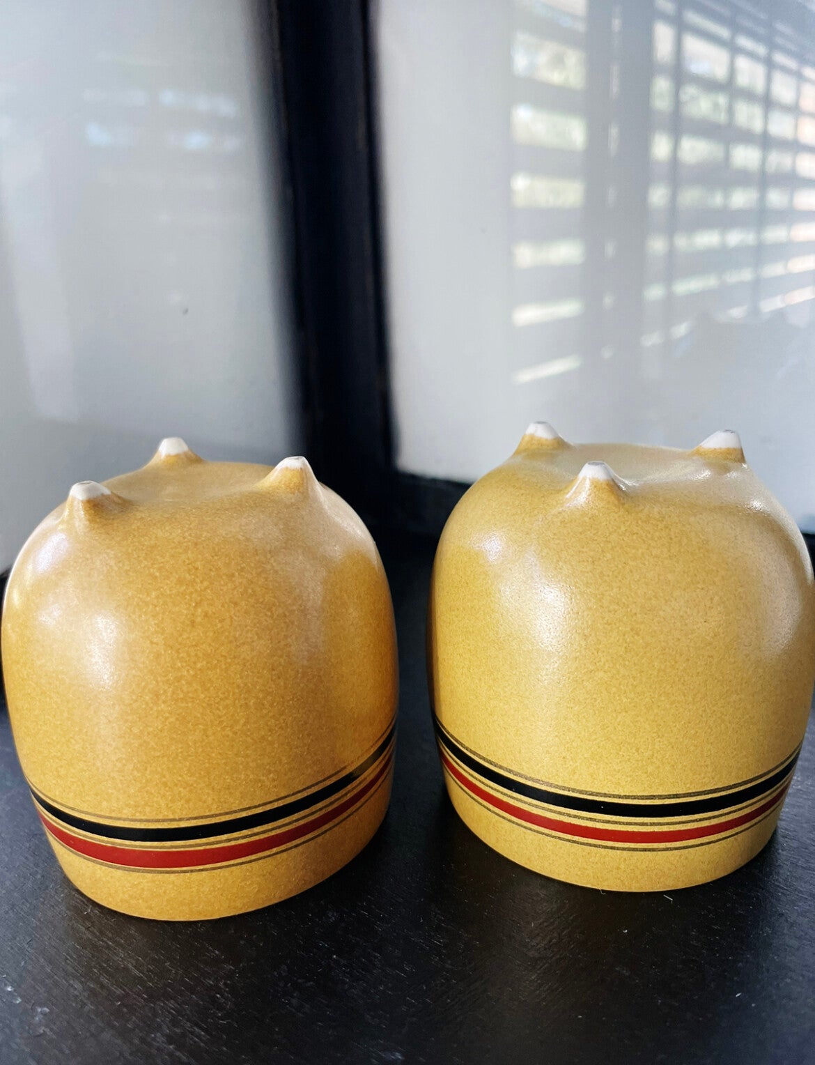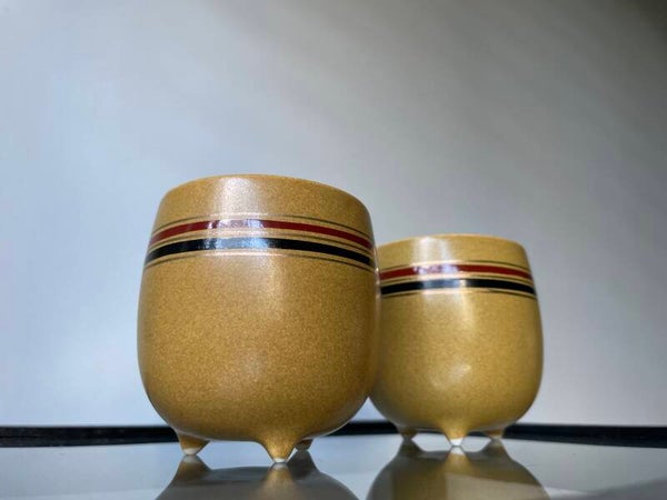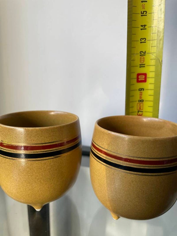 De kopjes hebben een mooi goudkleurig, rood en zwarte streep rondom. Leuk voor een espresso-tje, een lekker smeerseltje bij het stokbroodje offff.. leuk met een klein plantje erin!