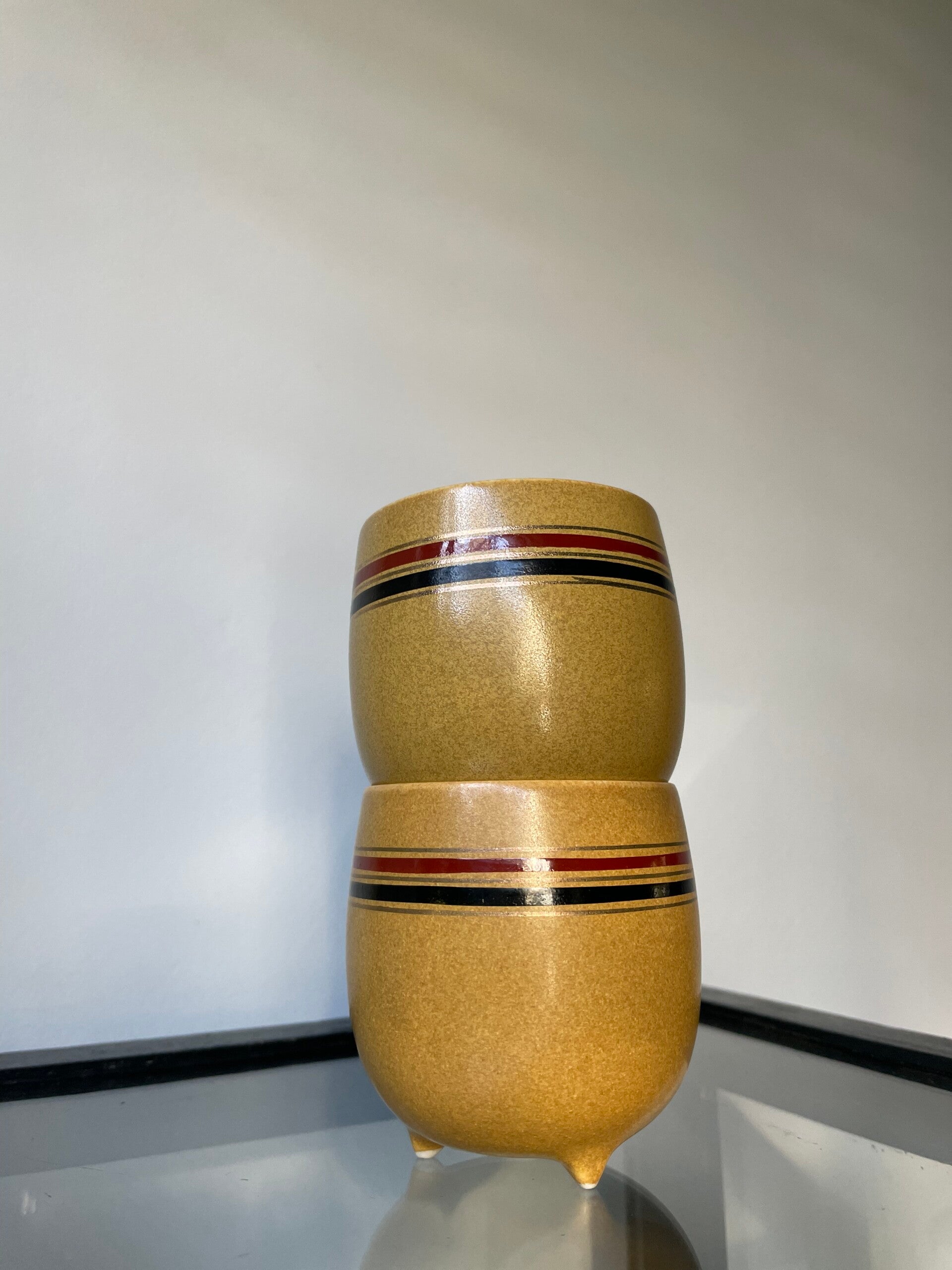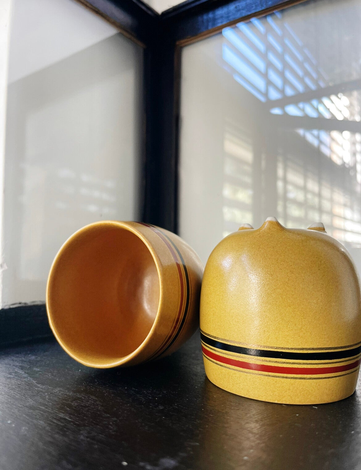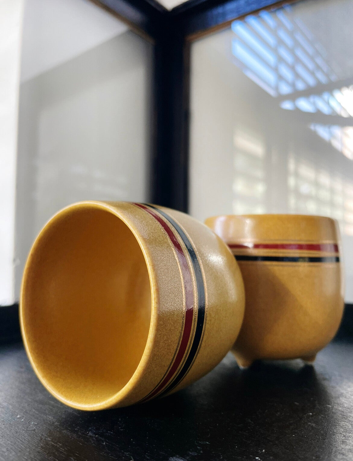 Super leuke vintage set van 2 mosterdgele kopjes op voetje. De kopjes vinden we enkel terug op een site die Chinees, Japans of misschien wel Koreaans is (we weten even niet wat het is want we kunnen het niet lezen helaas!) dus wel speciaal.