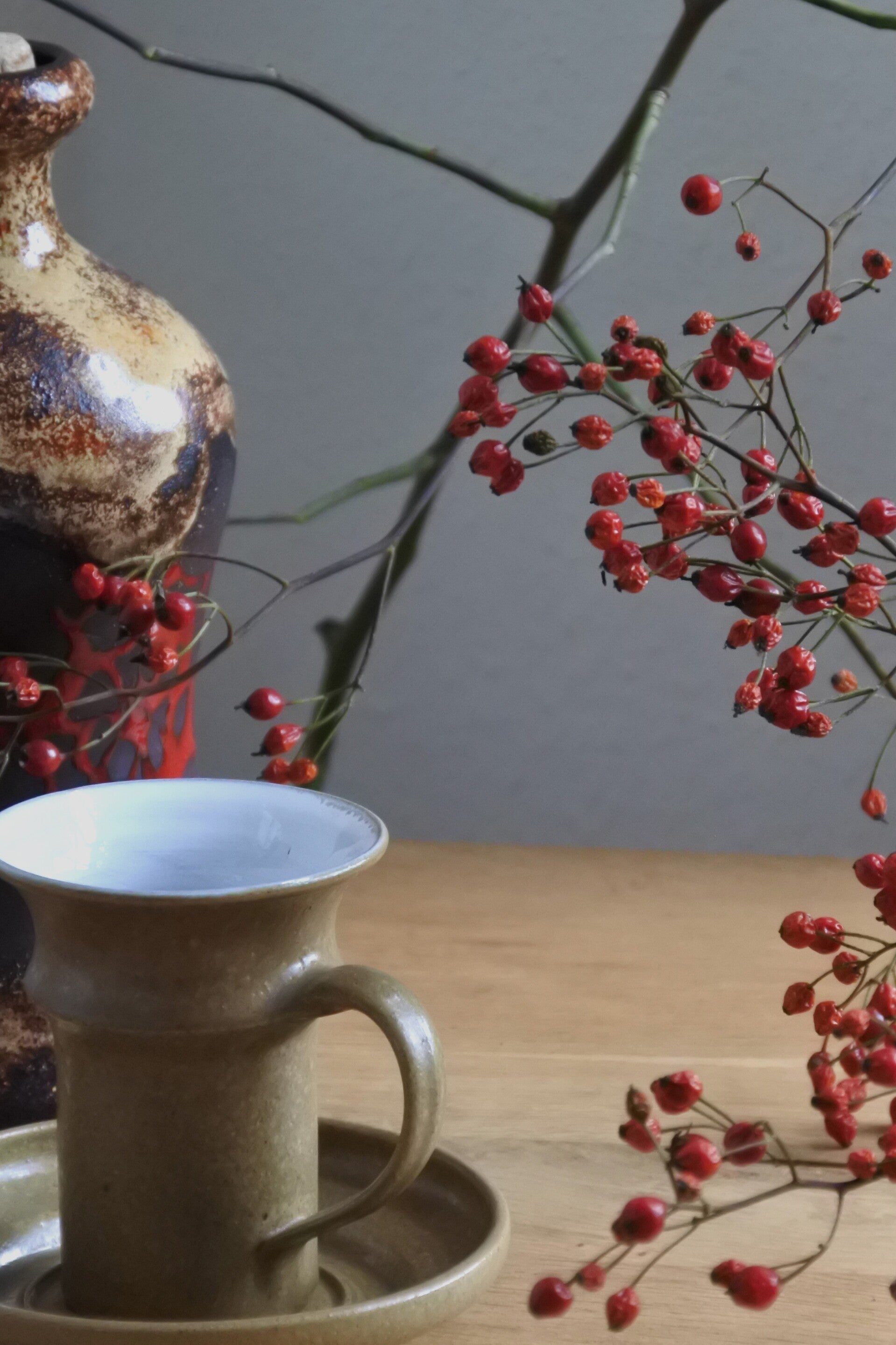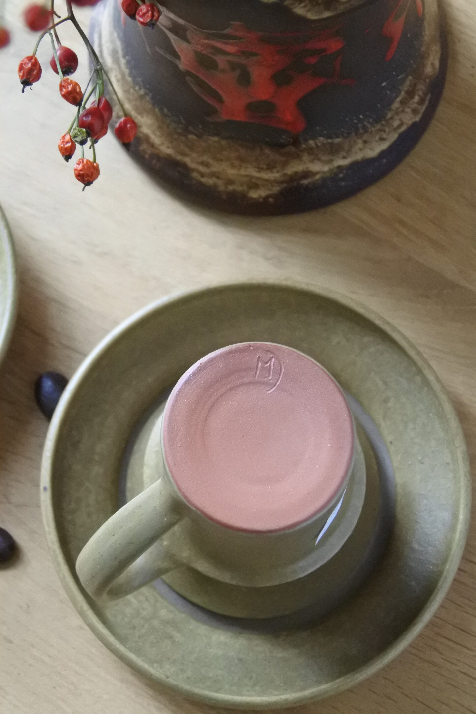 Set van 2 kunstig ontworpen kop en schotels. De set heeft een mooie zachte camelkleur en is gesigneerd aan de onderzijde met een kleine M.