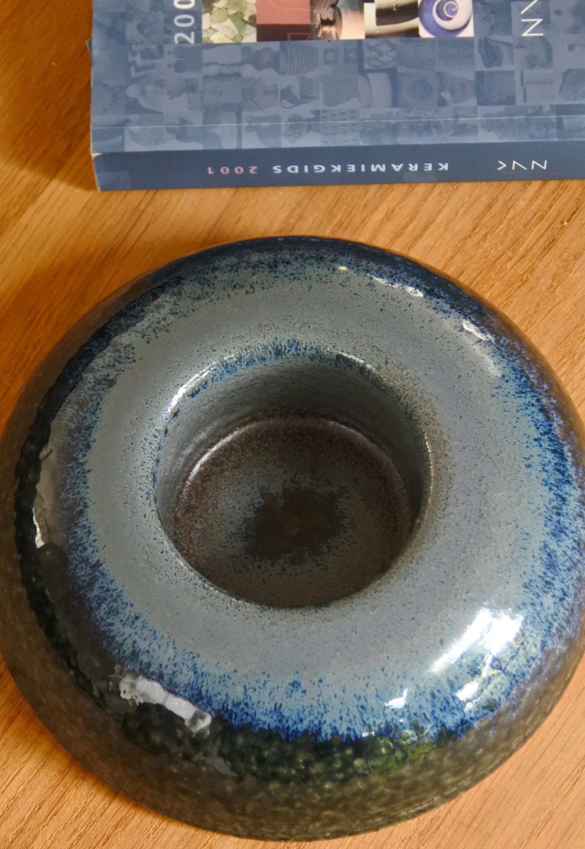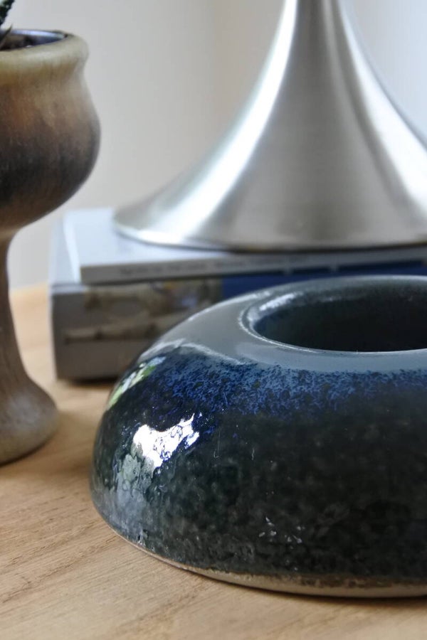 Vintage mid century modern zwaar waxinelicht/kandelaar van prachtig blauw aardewerk met kleurverloop van licht- en donkerblauw naar groen. geschikt voor zowel het branden van een waxinelicht als een stompkaarsje.