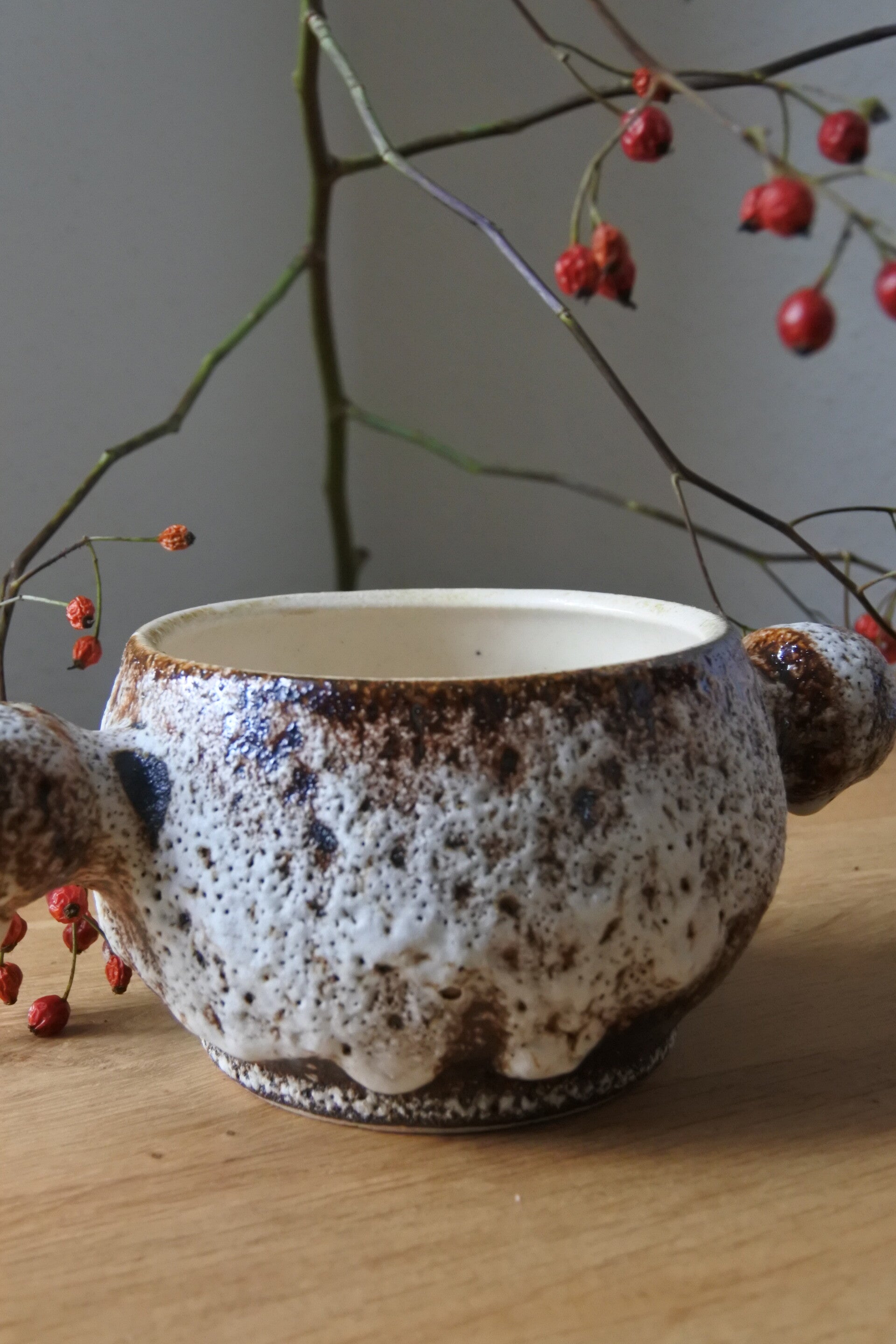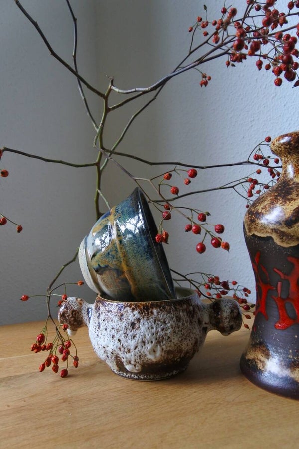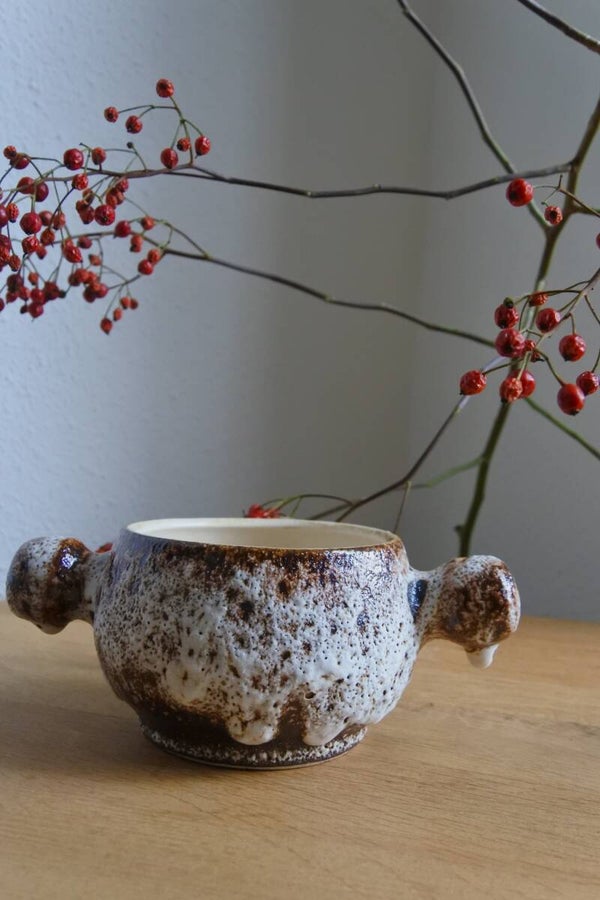 Mooi mid century modern vintage potje met handvaten maar ook tof om te gebruiken als.. schaaltje of kommetje (wat jij maar wilt!) uit de 70's ontworpen door Marius van Woerden voor Vest Keramiek te Gouda. Het vaasje is gemaakt van witte klei en is bedekt met het zo kenmerkende dikke en fat lava glazuur in bruin- en wittinten. De binnenzijde is geglazuurd in beige tint.