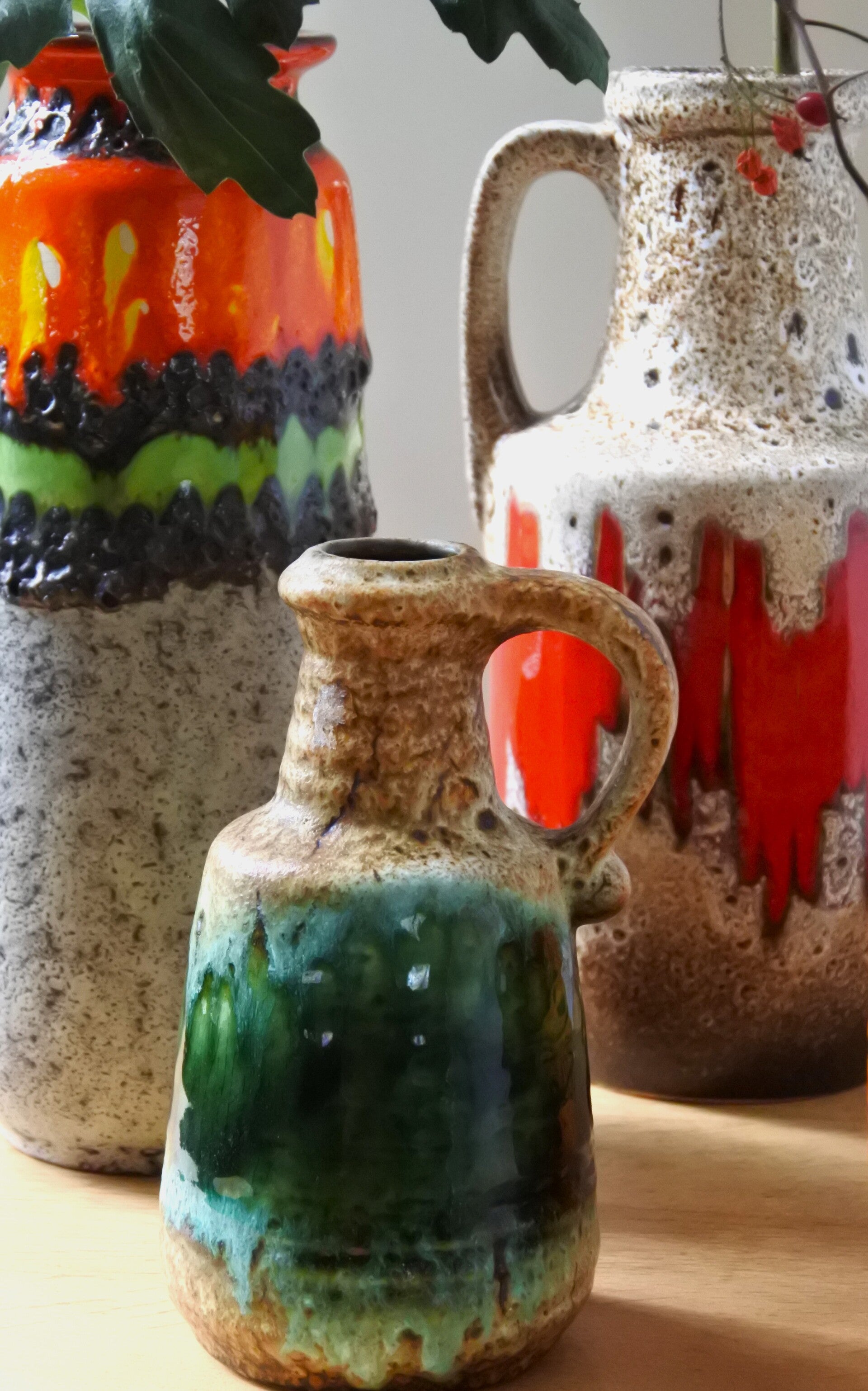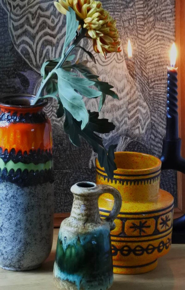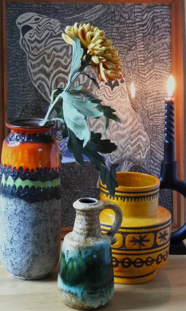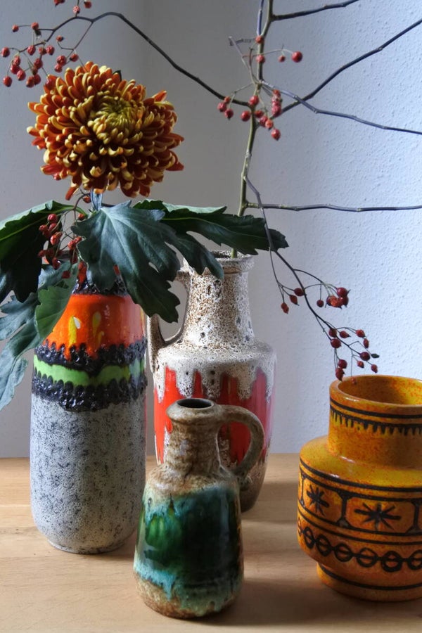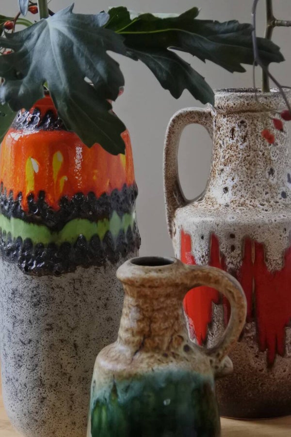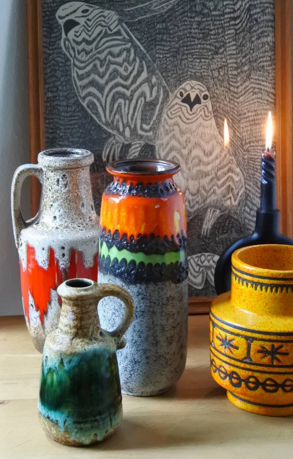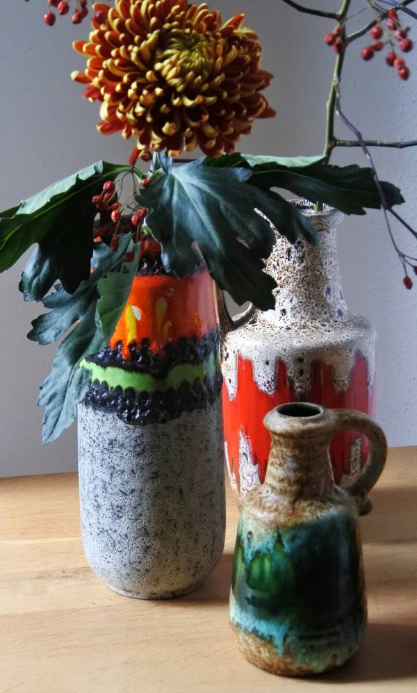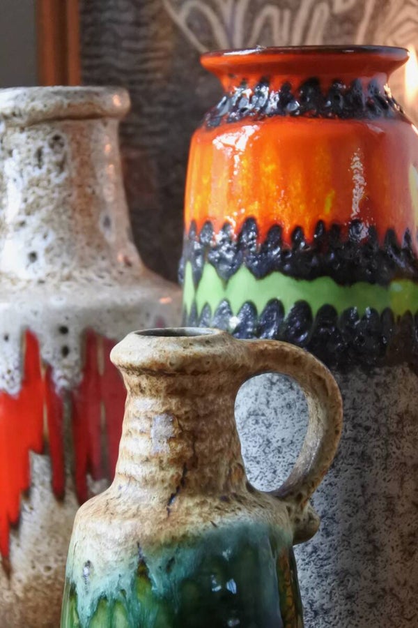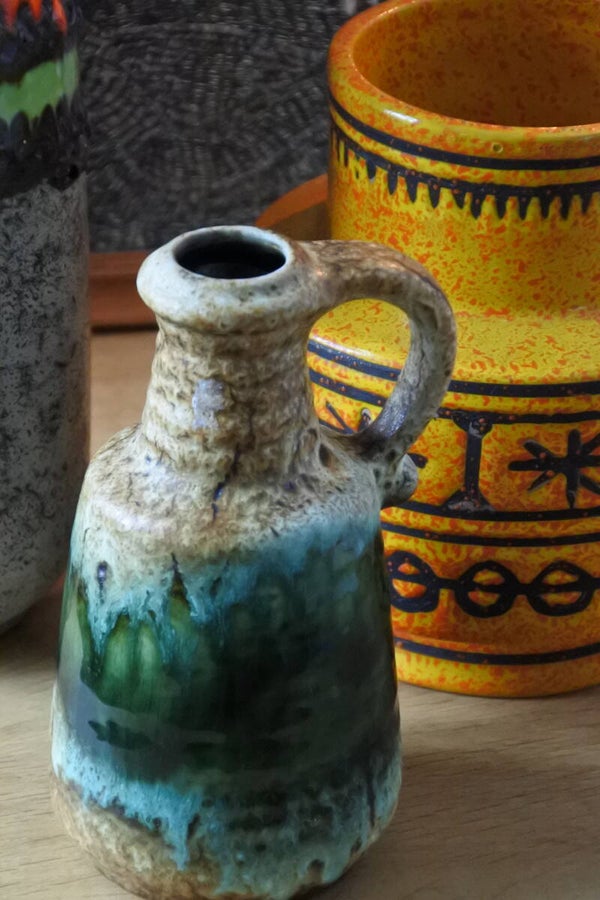 Prachtige vintage West Germany vaas van Bay in beige met een prachtige band in groen.