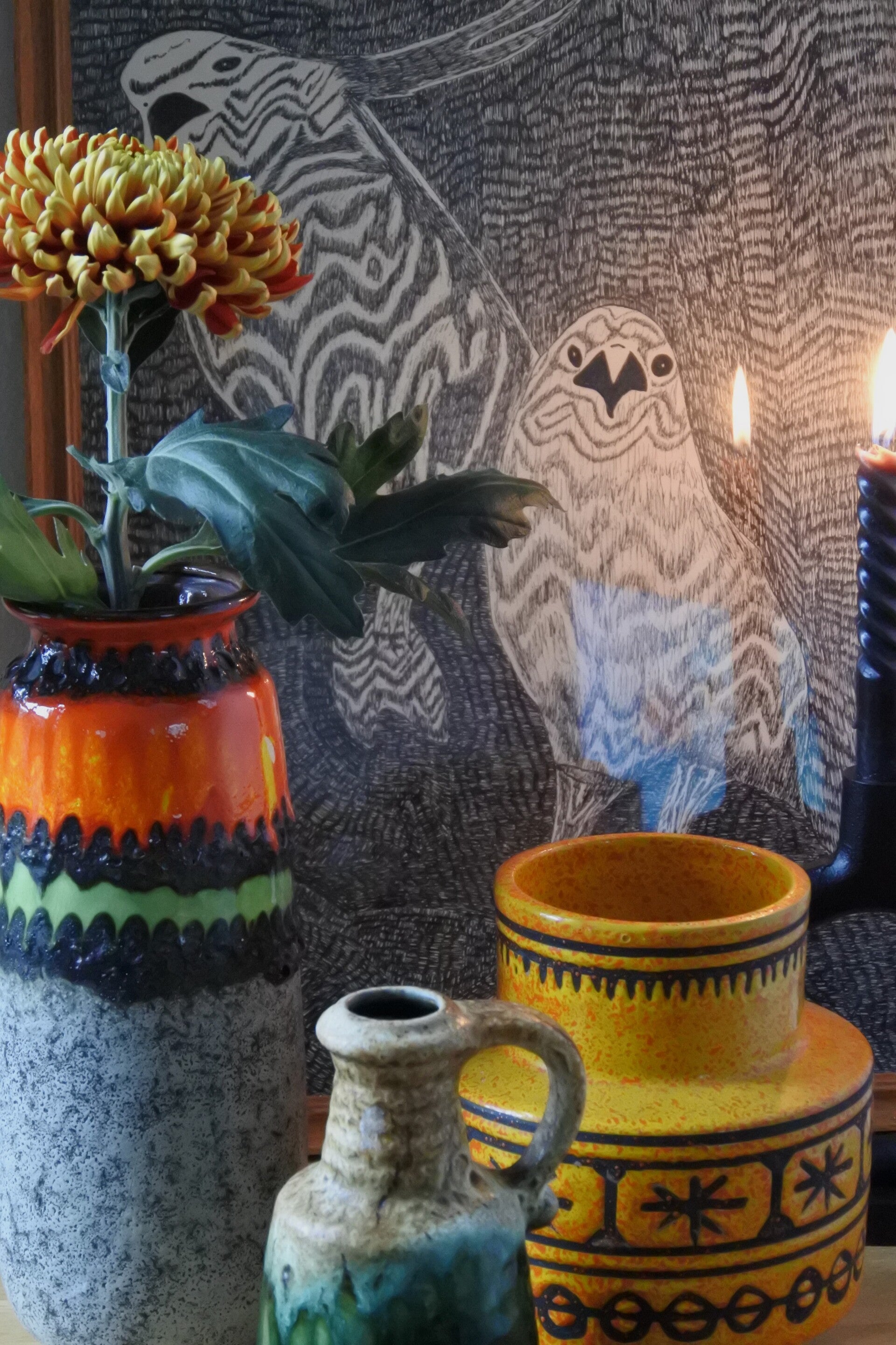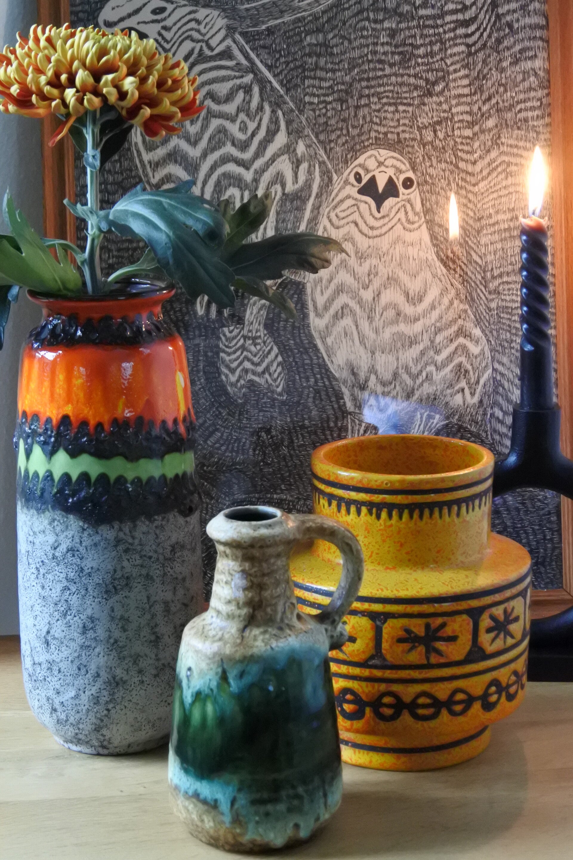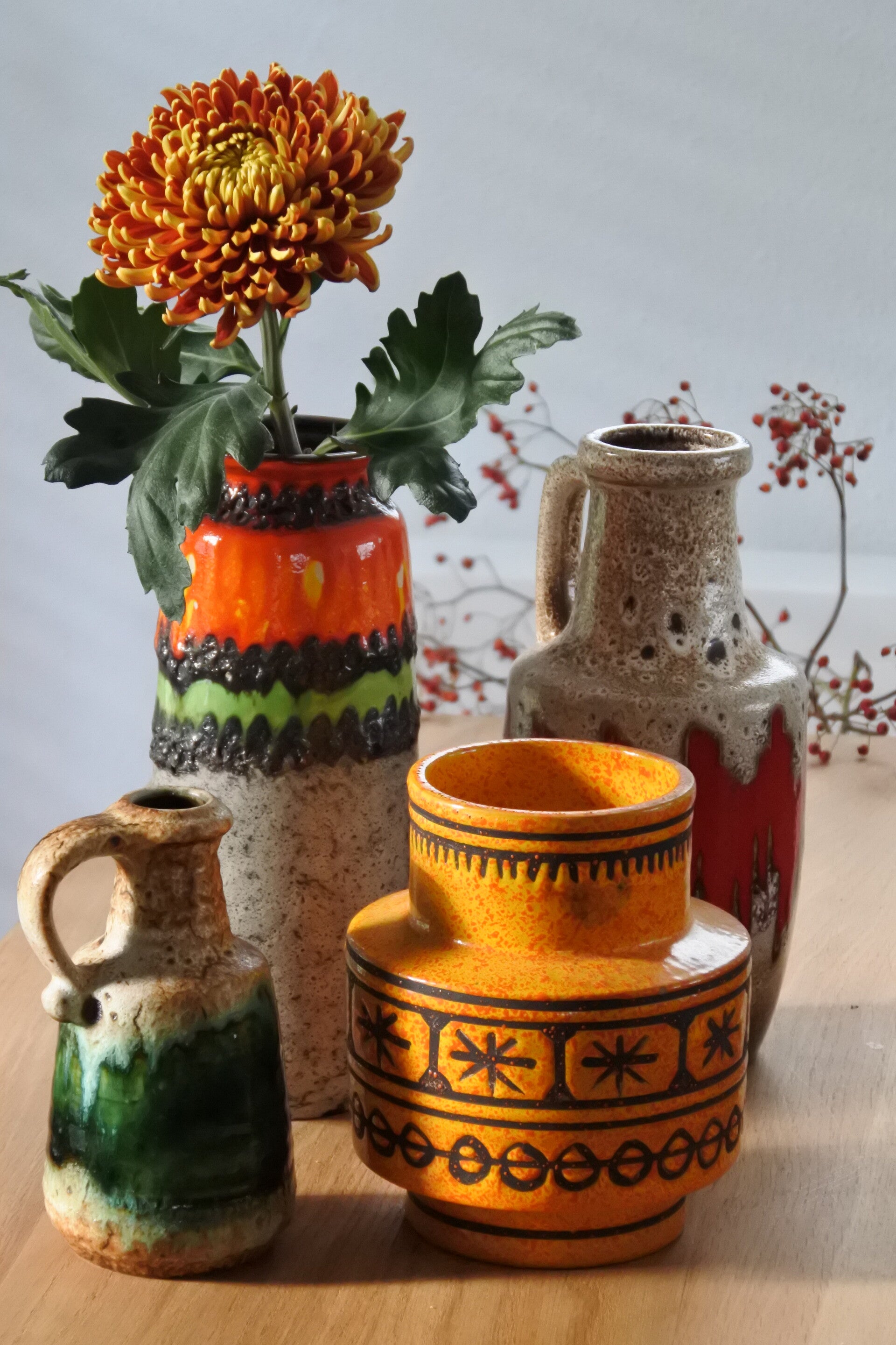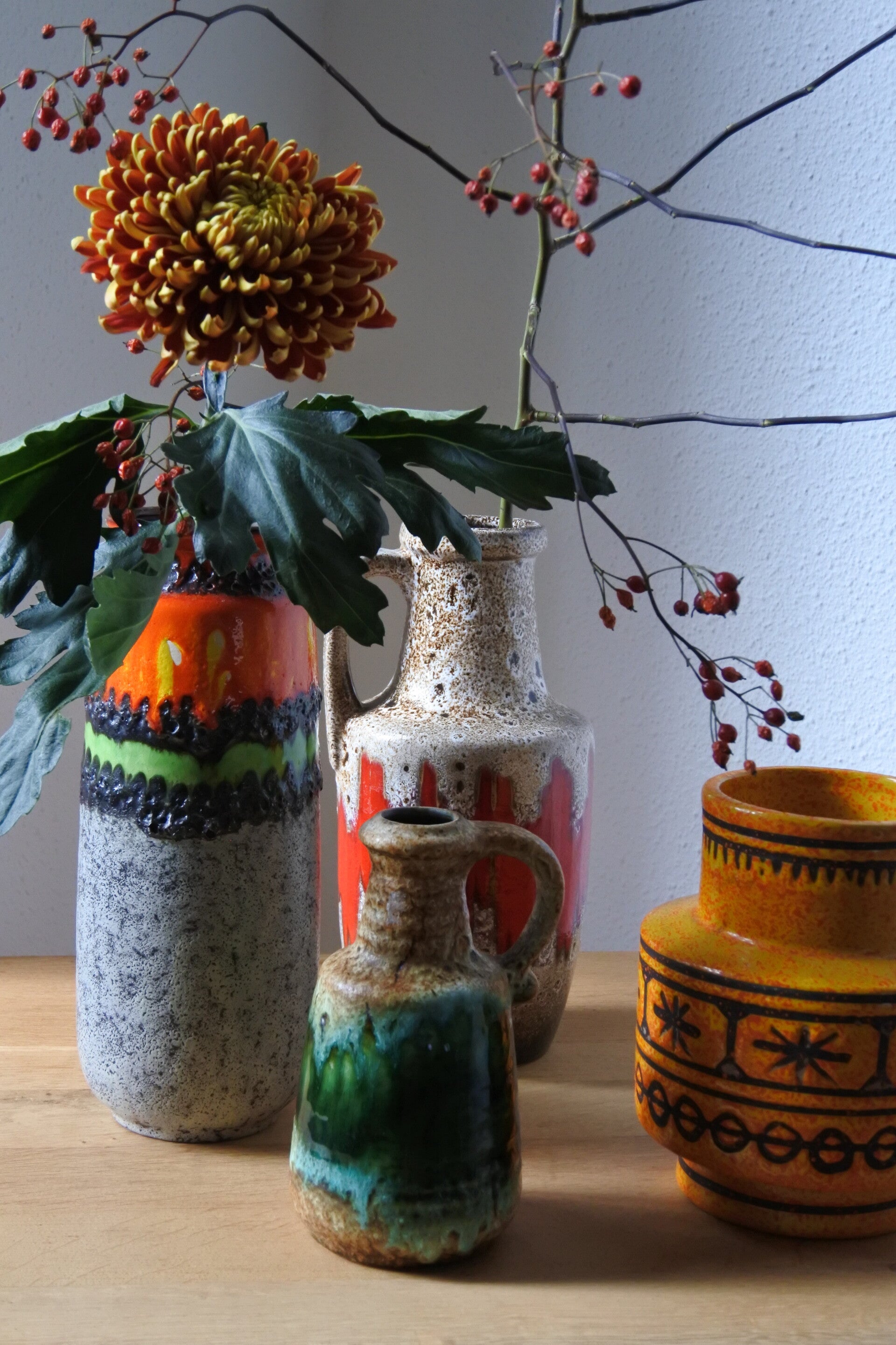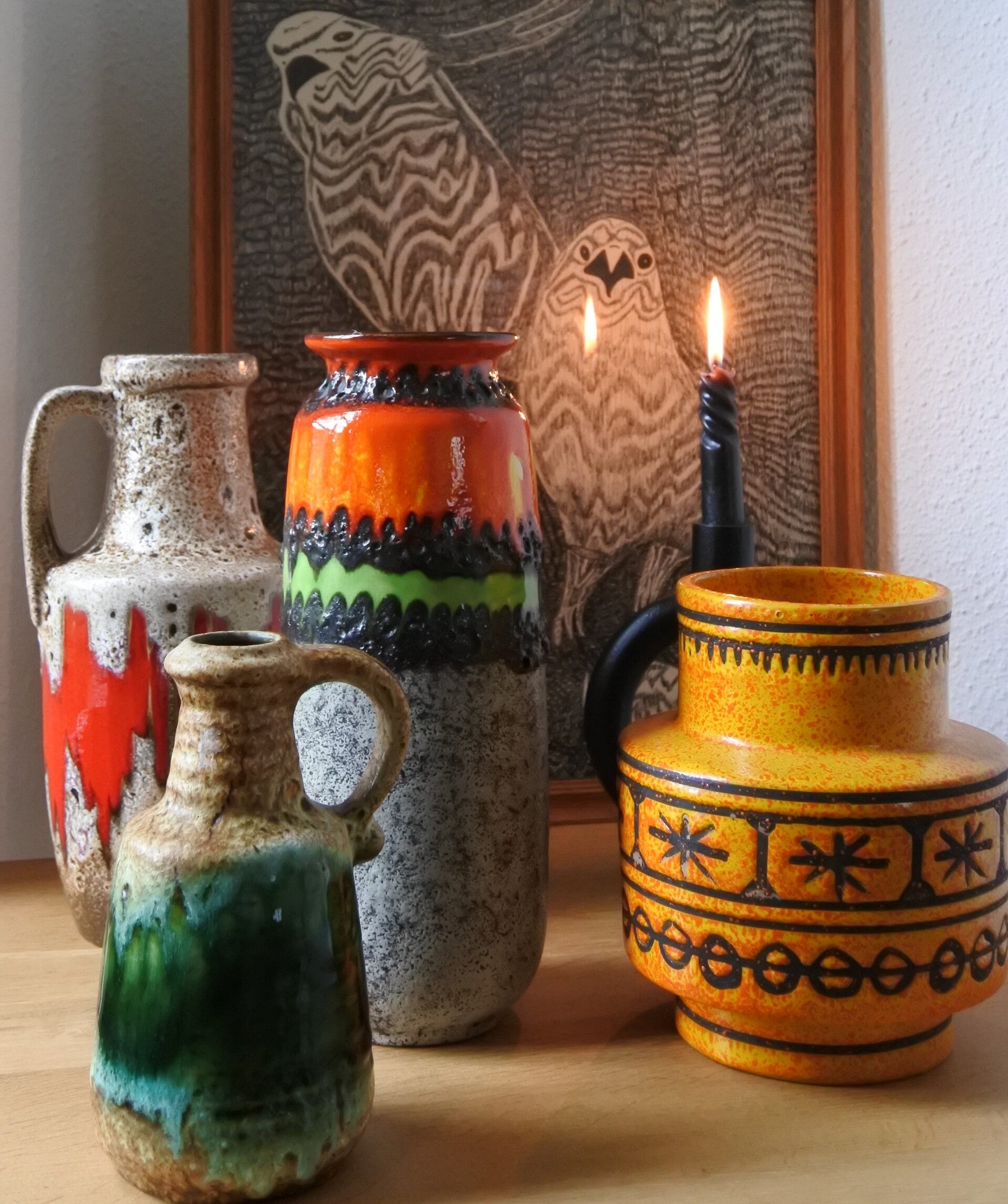 Prachtige vintage West Germany vaas van Bay in beige met een prachtige band in groen.