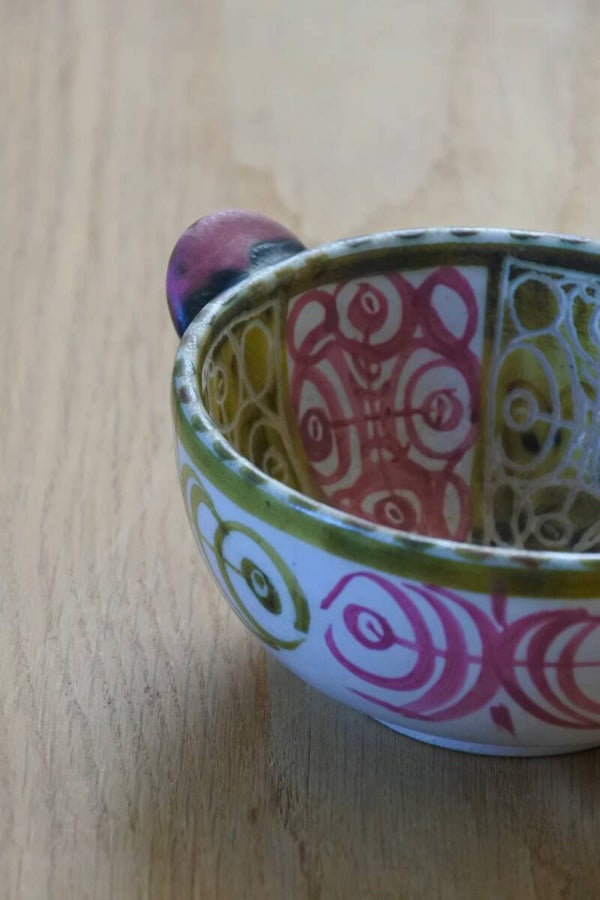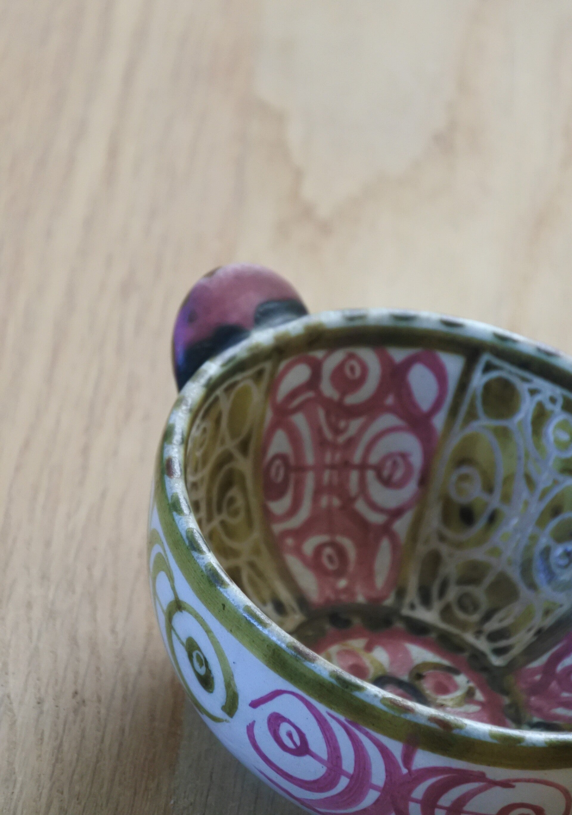 Het schaaltje is gemaakt van keramiek met een.. en dit menen we echt: prach-ti-ge tekening aan zowel de binnen- als buitenzijde zijde welke vakkundig is aangebracht. Het schaaltje heeft ook 2 mooi versierde oortjes aan weerszijden.