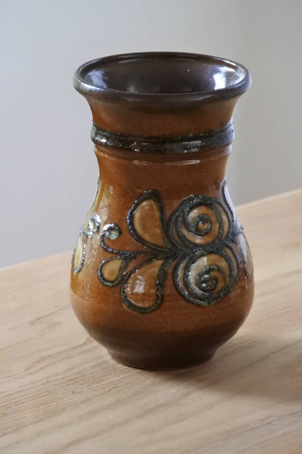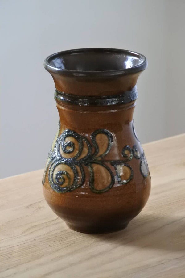 Deze leuke vaas is van Strehla met kunstig decor van prachtige geel en groene bloemen in bruisglazuur op een karamelkleurige ondergrond.