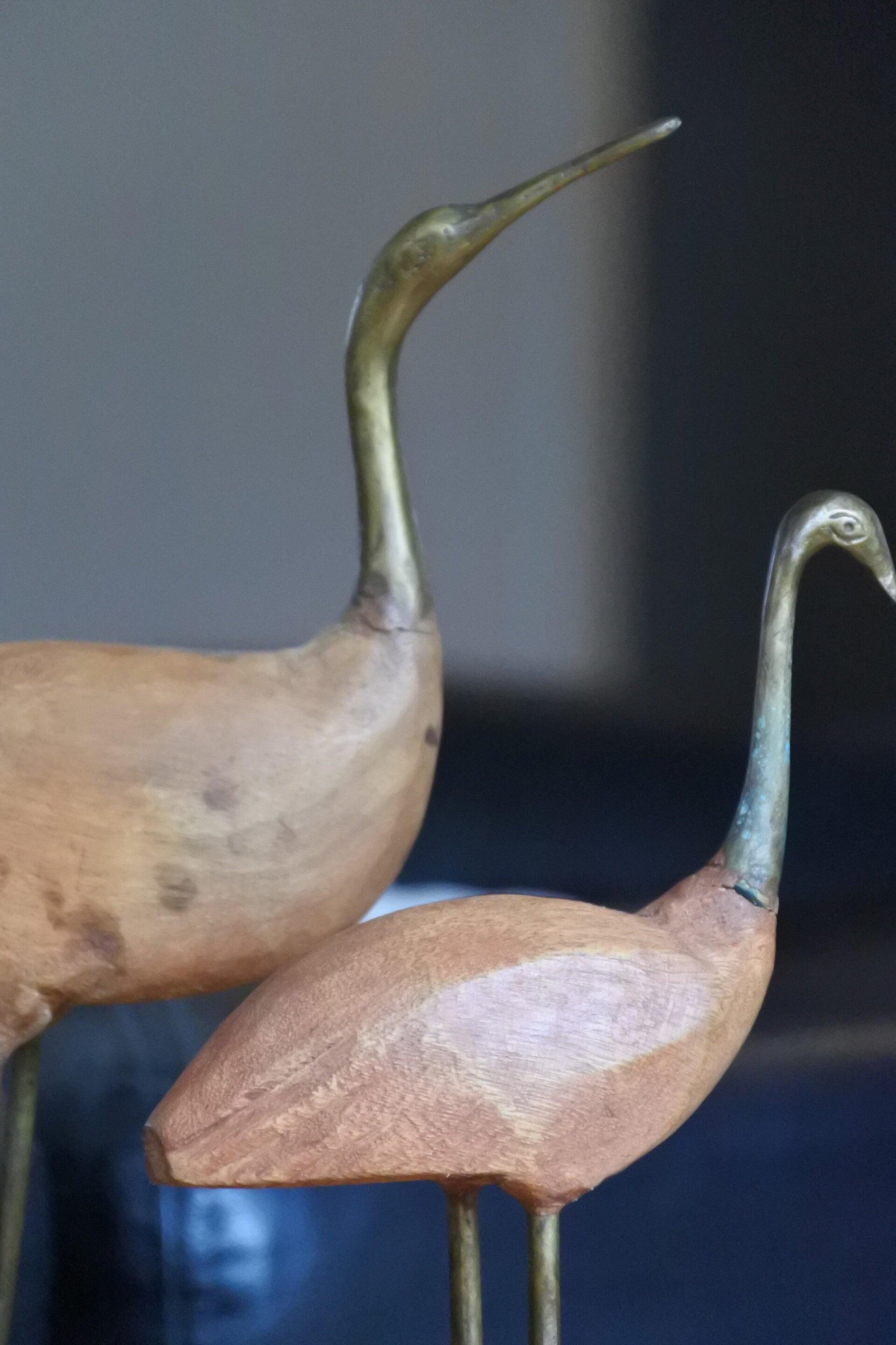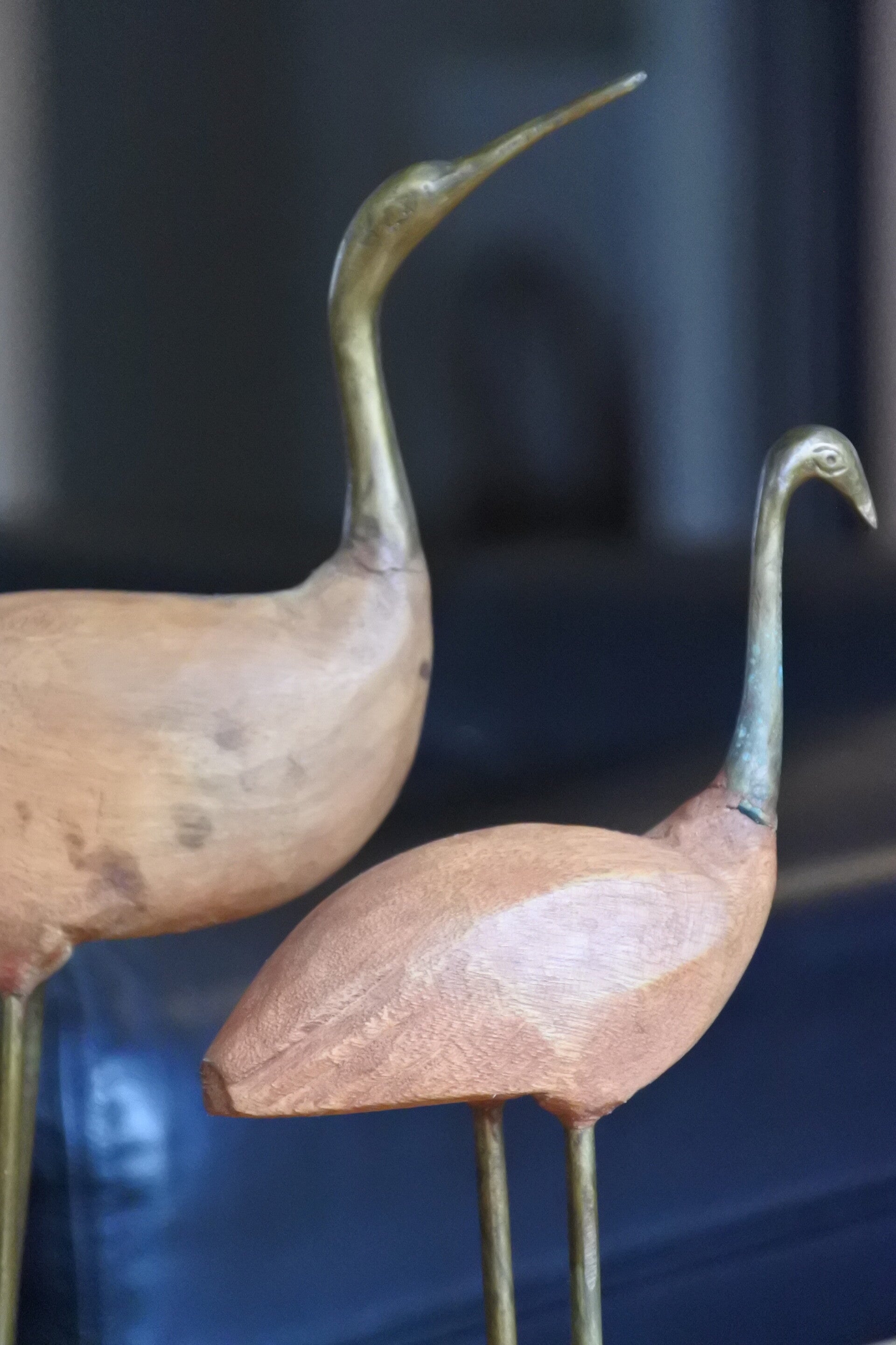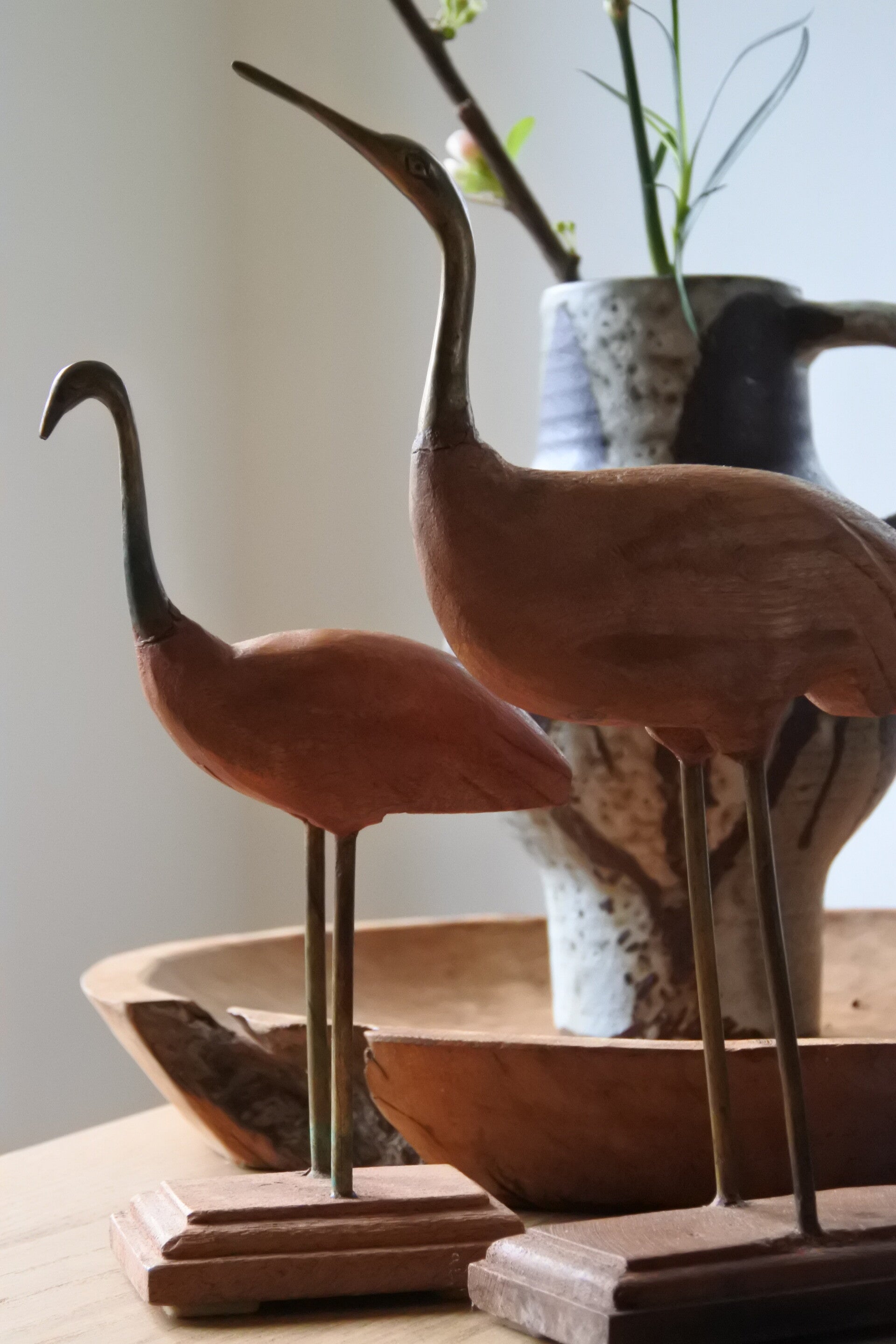 Een zeldzaam mooi setje antieke kraanvogels gemaakt van hout en messing. Prachtig stuk voor de art deco liefhebber!
