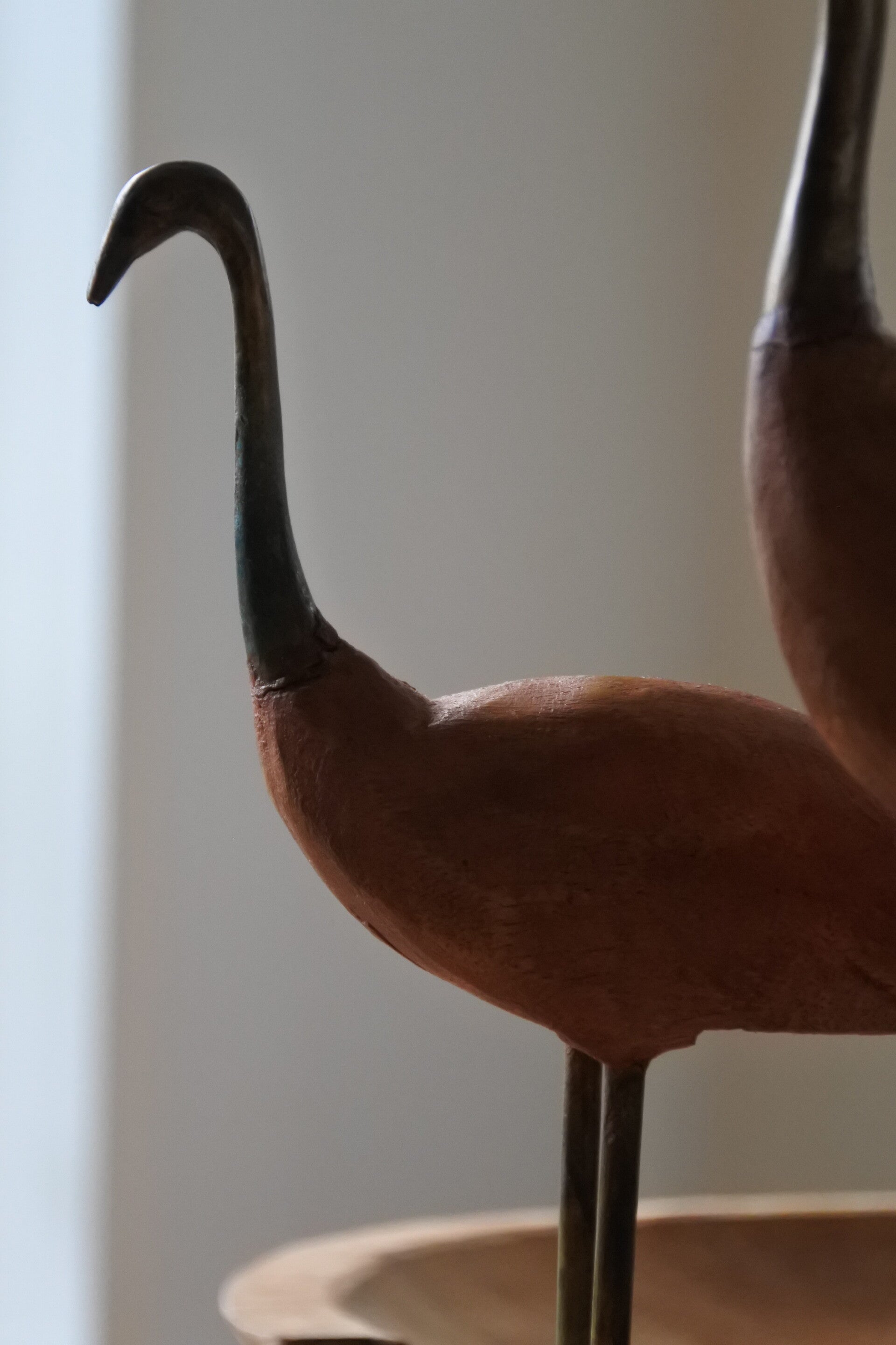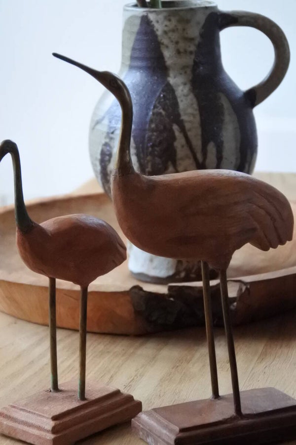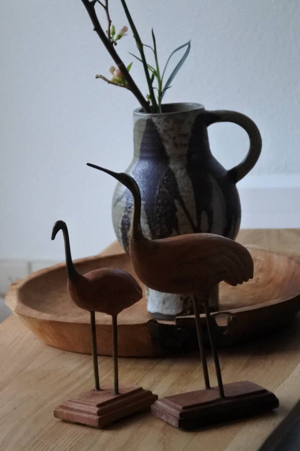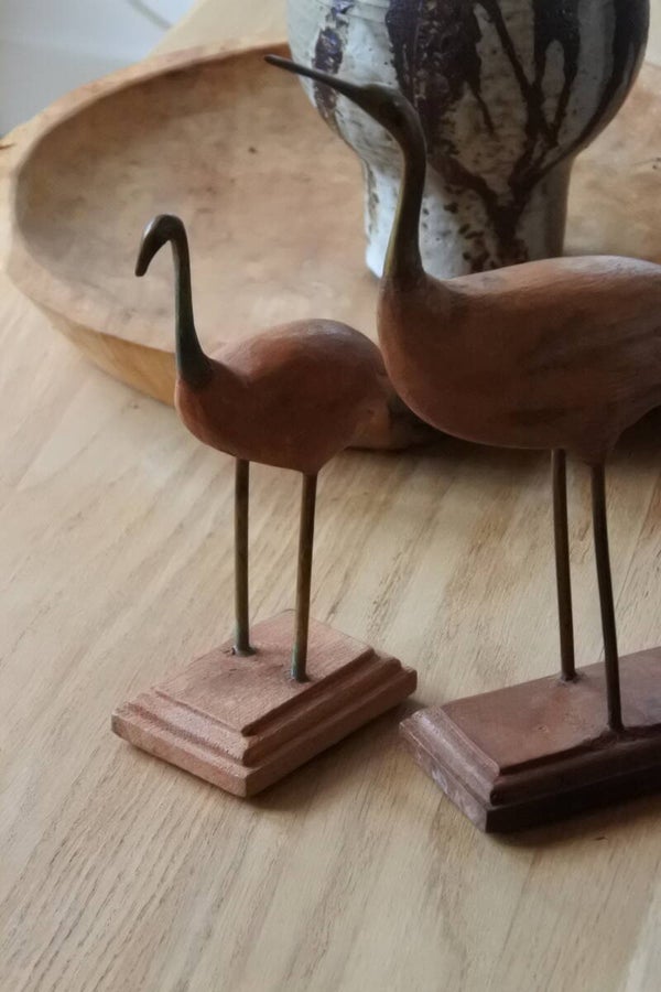 Een zeldzaam mooi setje antieke kraanvogels gemaakt van hout en messing. Prachtig stuk voor de art deco liefhebber!