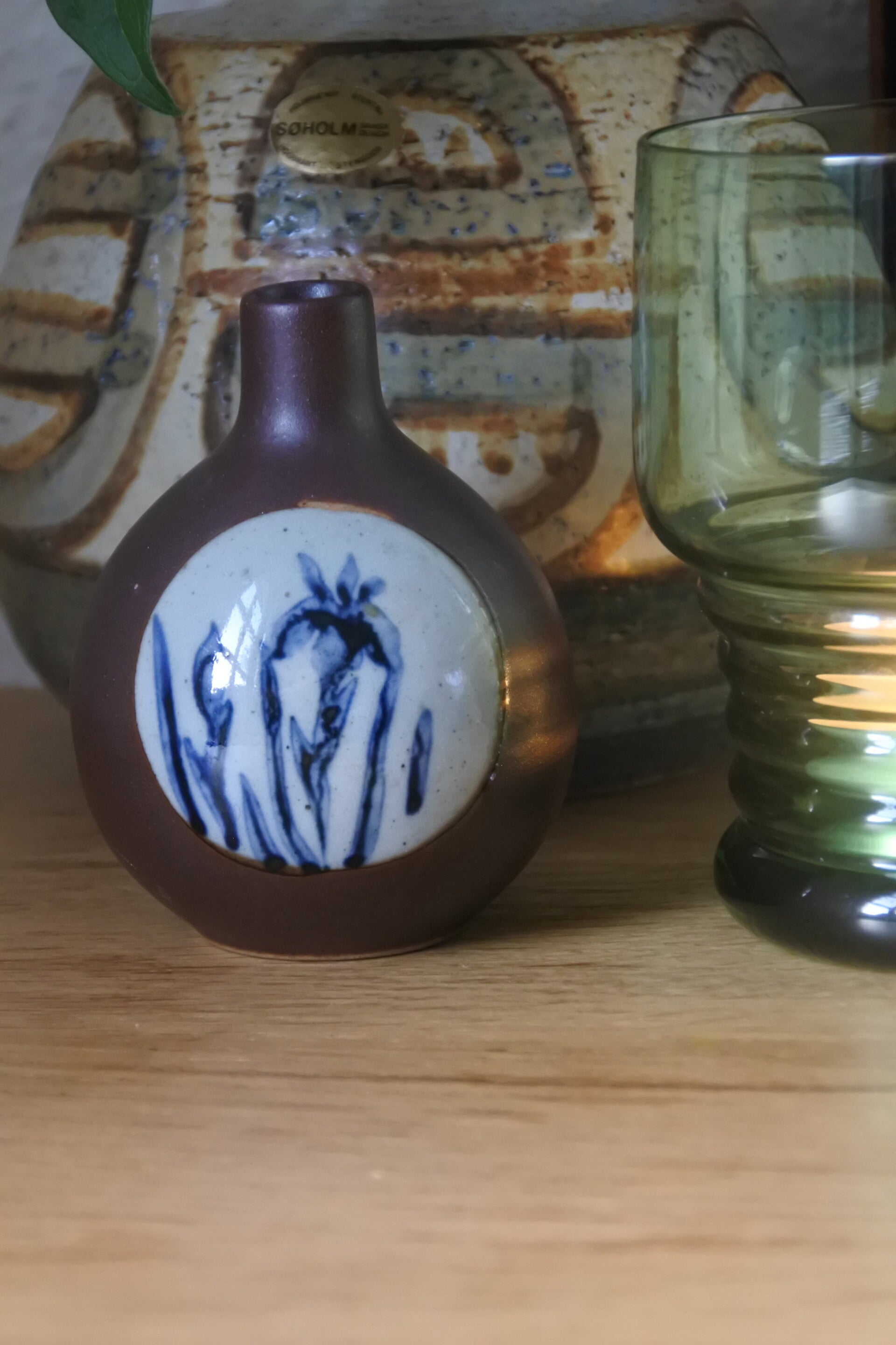 Vintage Yakimono vaasje met charmante decoratie in blauw op een grijs geglazuurde ondergrond en blauwe bloemen.