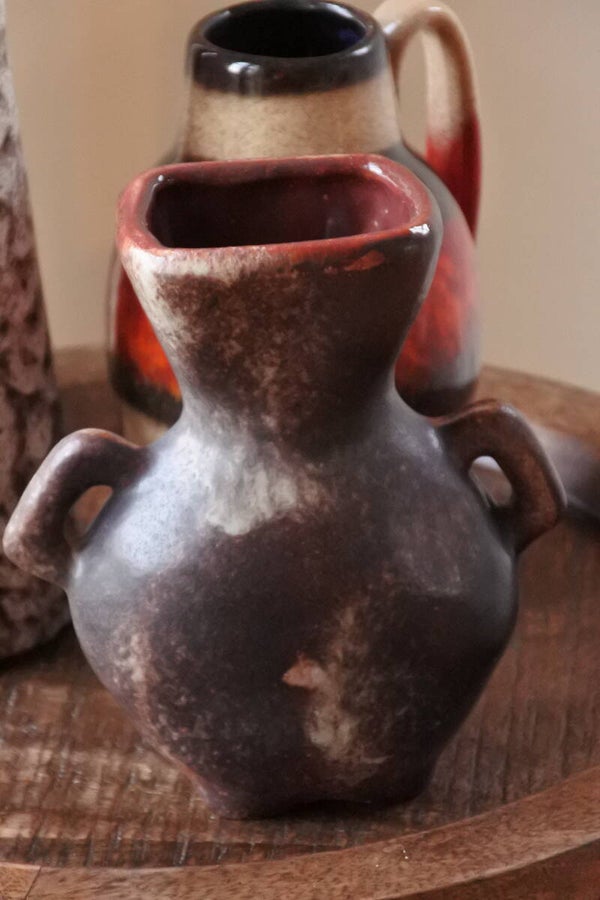 Vintage Vest vaasje met oortjes aan weerszijden. Het vaasje heeft een tijdloos leuk decor en heeft een mooie natuurlijke overloop van diepere kleuren.
