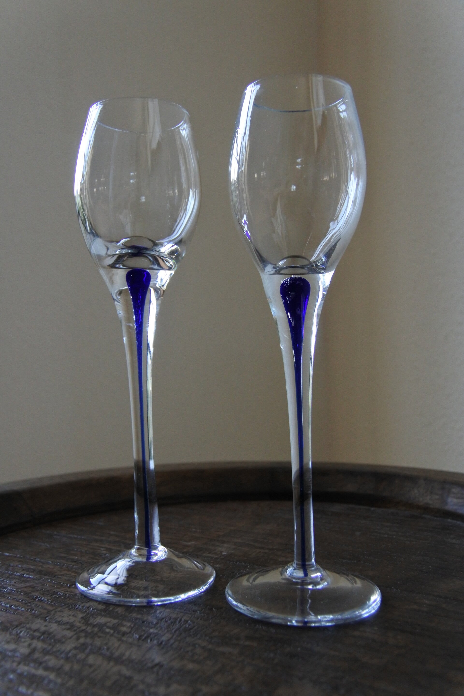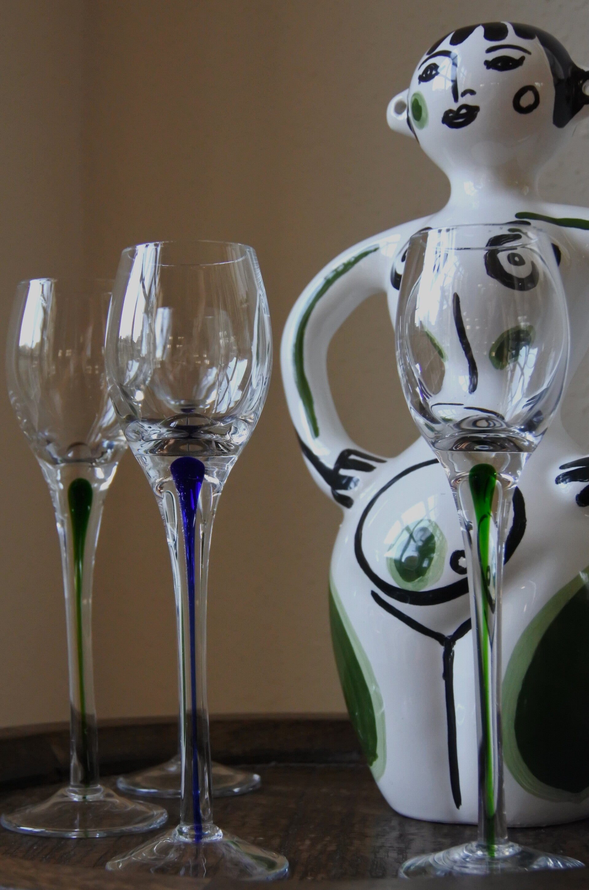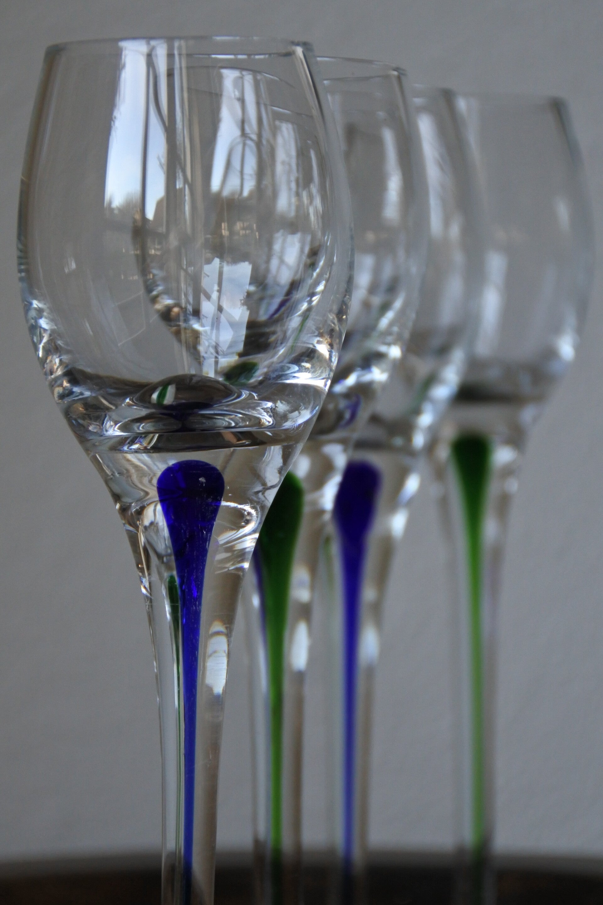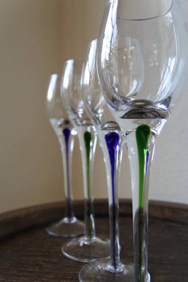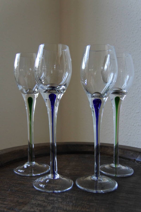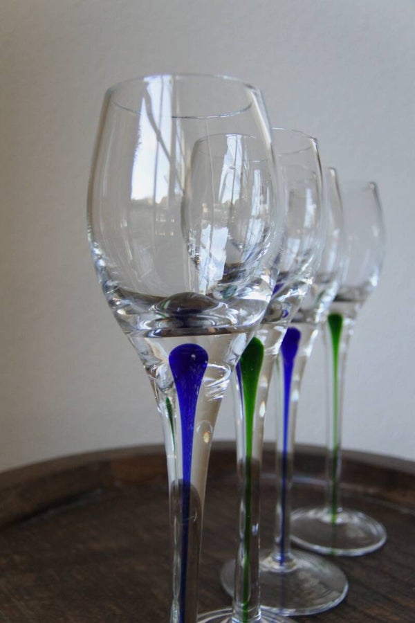 Set prachtige borrelglaasjes uit de Intermezzo serie van Orrefors, gemaakt van mondgeblazen kristalglas, voorzien van een schitterend design, met meegeblazen blauwe en groene druppel. Ontworpen door Erika Lagerbielke.