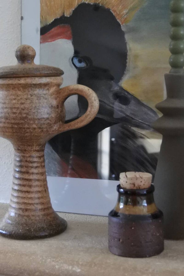 Prachtige vintage plantenpot/vaas uit de 70's van Vest Keramiek Gouda in een mooie naturelkleur en stoere structuur. Het item staat op een gaaf voetje en is ook hartstikke leuk met een cactus(je) erin als bloempot.
