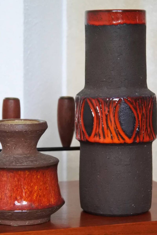 Leuke, nee mooie, nee! Prachtige (dat dekt toch meer de lading) Løvemose Keramik vaas uit de jaren 70 van prachtig donkerbruin aardewerk met rood glazuur en ingekerfd patroon rondom.