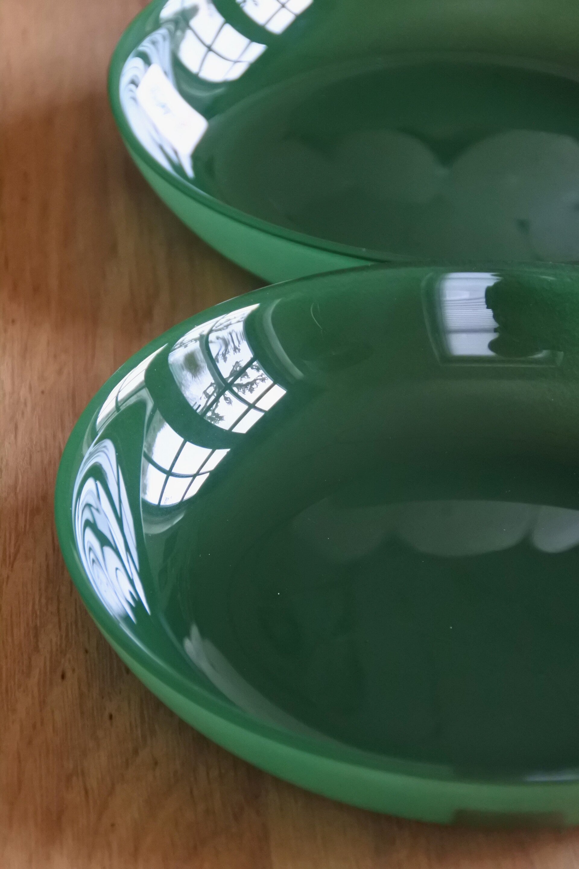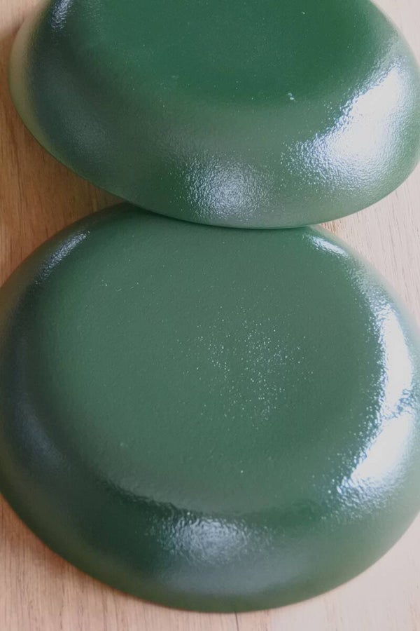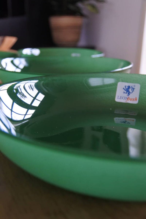 Deze mooie groen glazen schaaltjes of eigenlijk meer bordjes zijn van Leonfresh en zijn misschien vintage maar toch nog als nieuw (zelfs het stickertje zit er nog op). Als je het ons vraagt dan hebben we wel 100 leuke ideeën voor deze top bordjes.. jij ook?