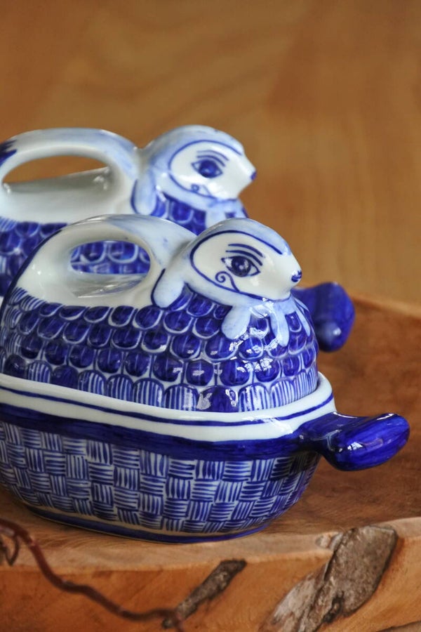 Vintage deksel schaaltje met wit met blauw beschilderd decor