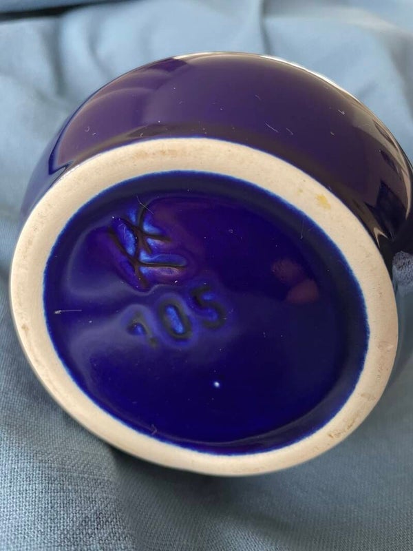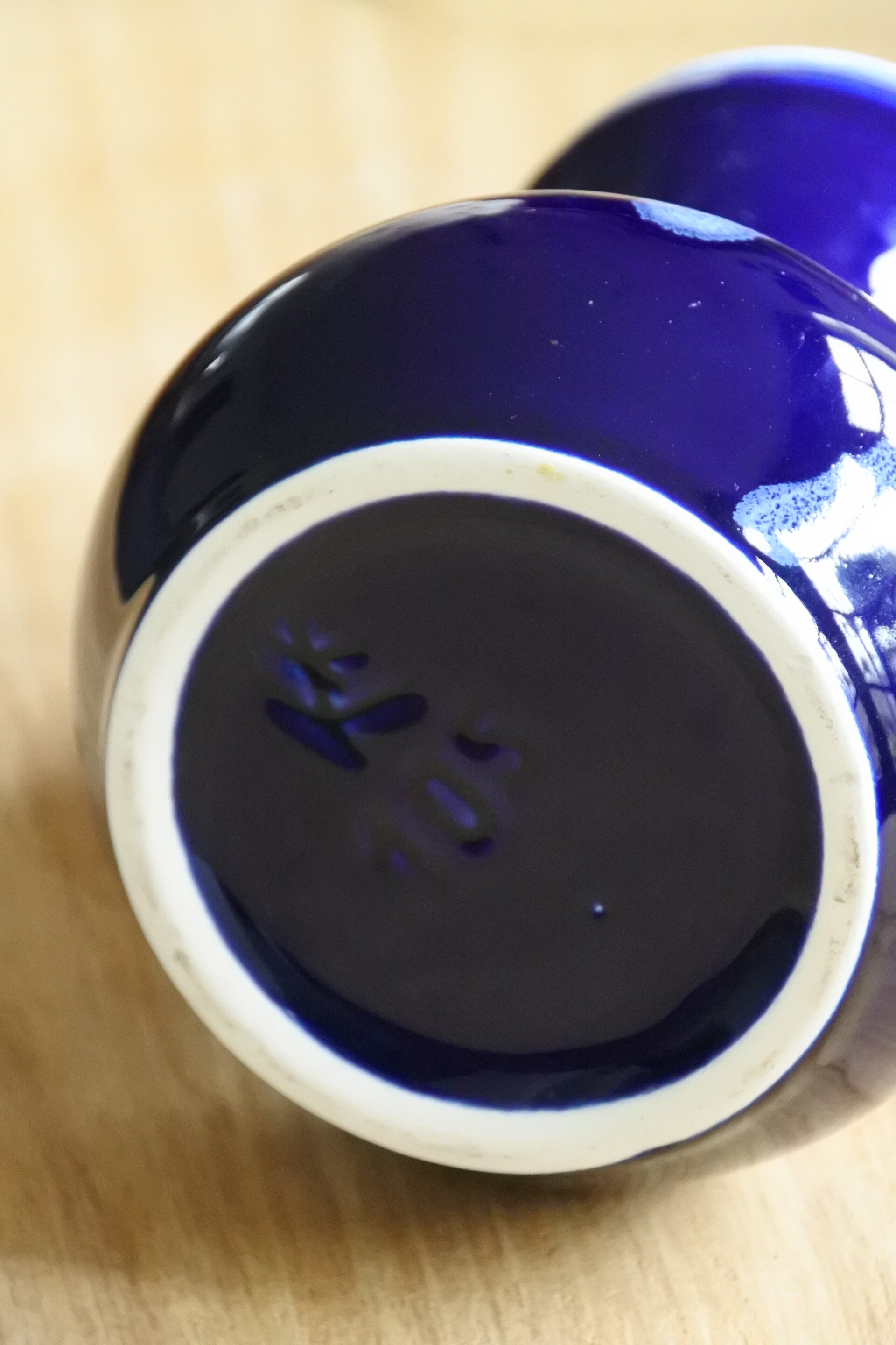 Heel mooi vintage vaasje in frisse blauwe kleur met mooi verfijnde opdruk in wit.