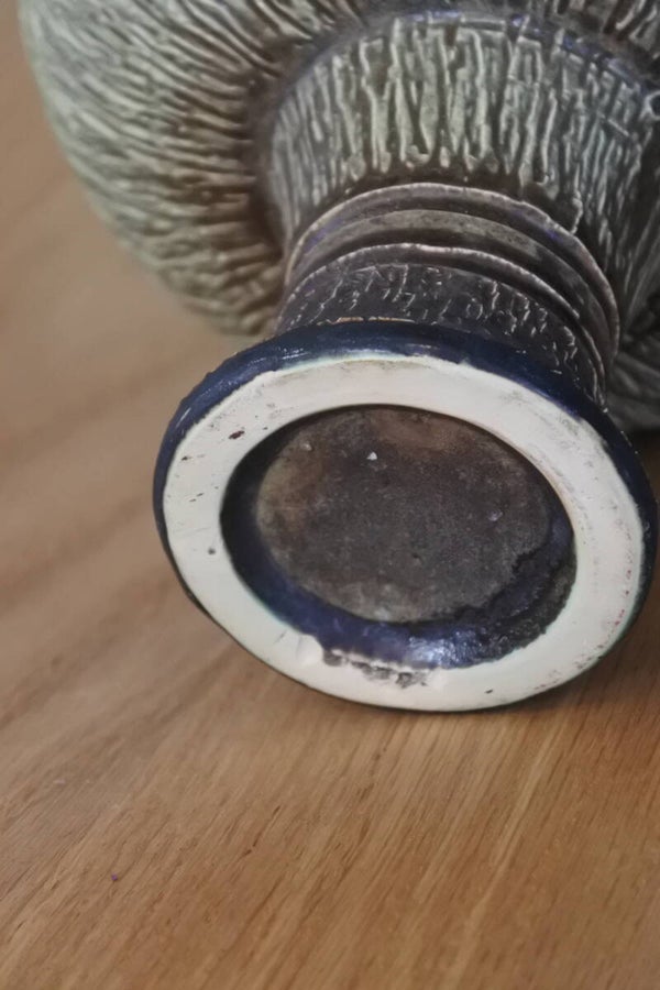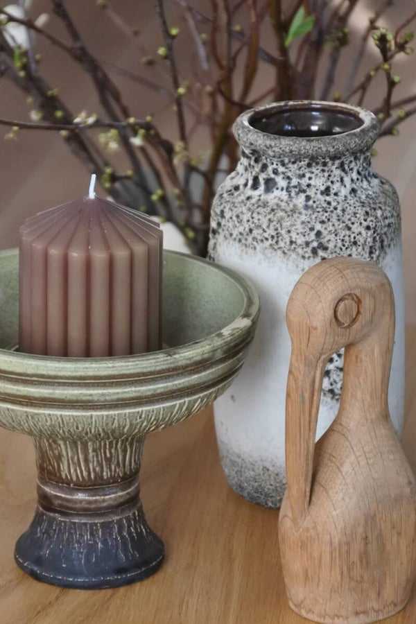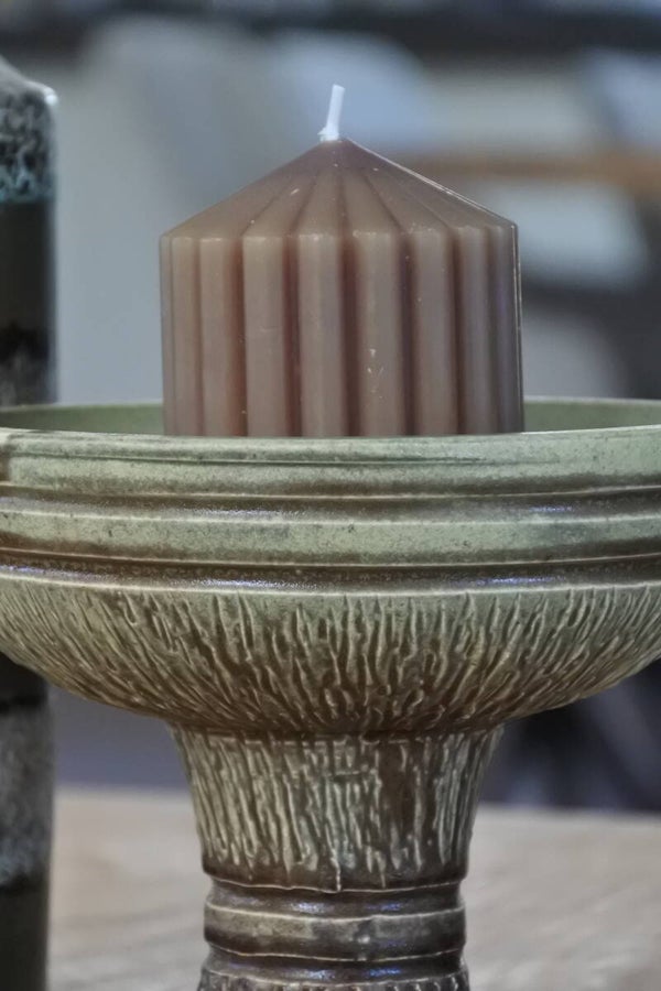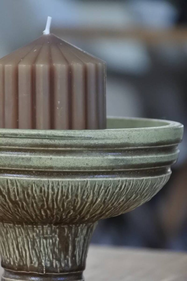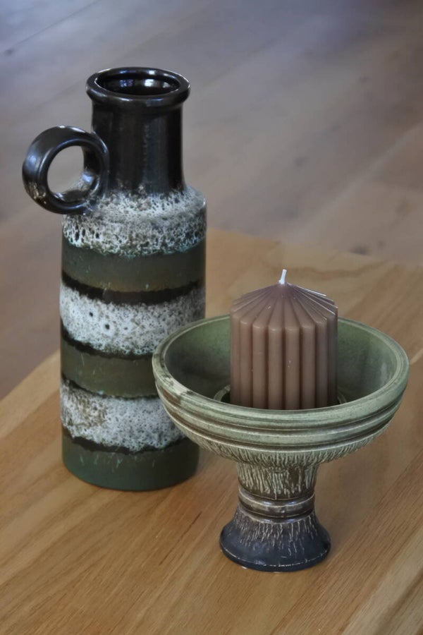 Stoere en robuuste vintage aardewerk kandelaar van groen en bruin aardewerk op een sierlijk voetje.