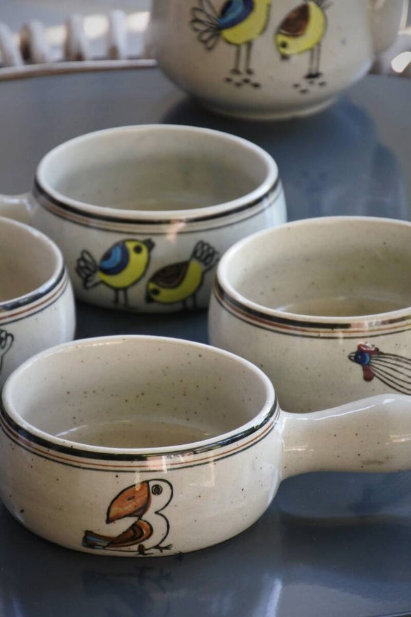 set van 4 vintage soepkommen uit hoogstwaarschijnlijk de jaren 70 (tante beppie denkt ze te herkennen) met handbeschilderde vogel illustraties in Deense look. De soepkommen hebben een handig handvat zo schiet er nooit geen hete soep meer in je schoot ;)