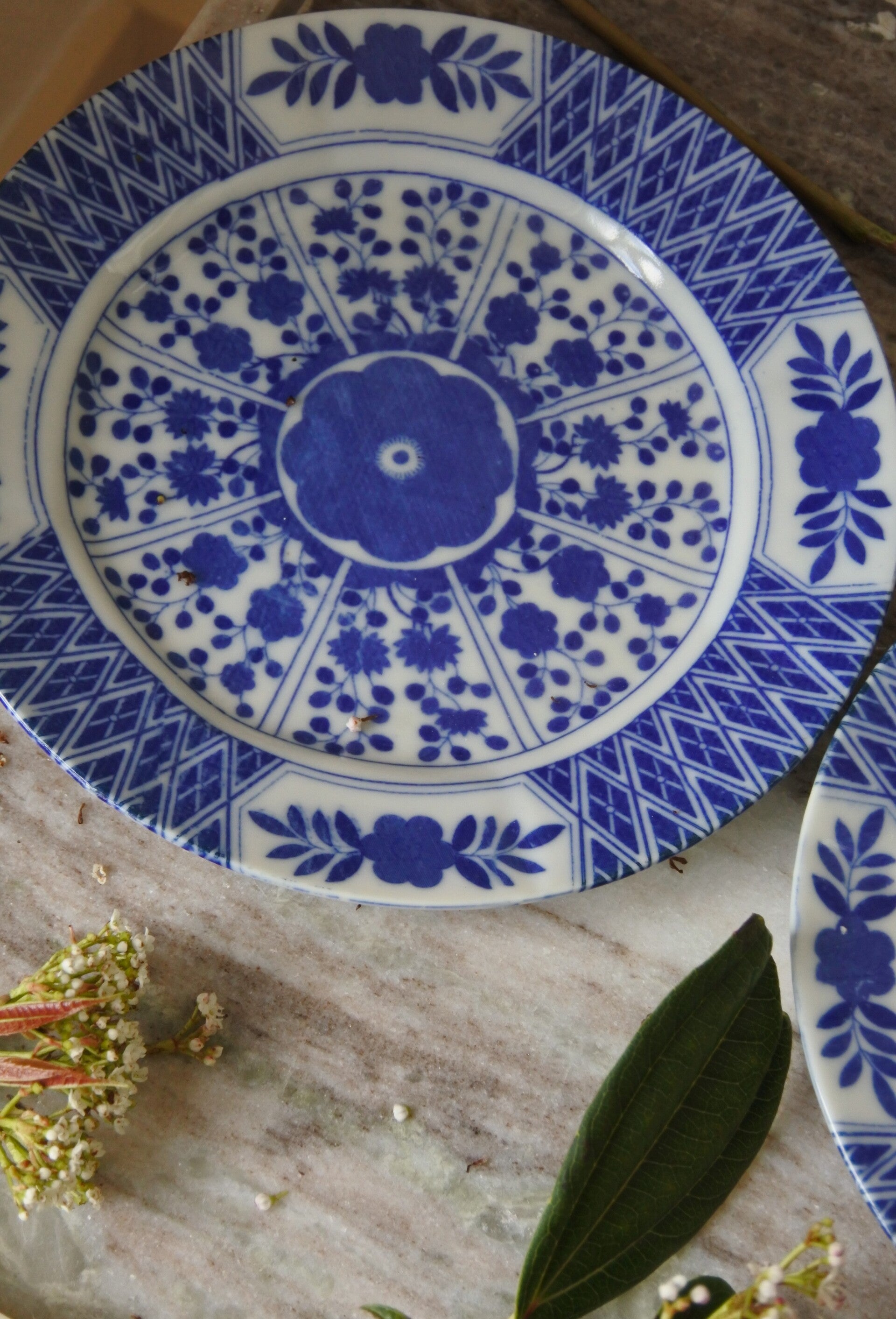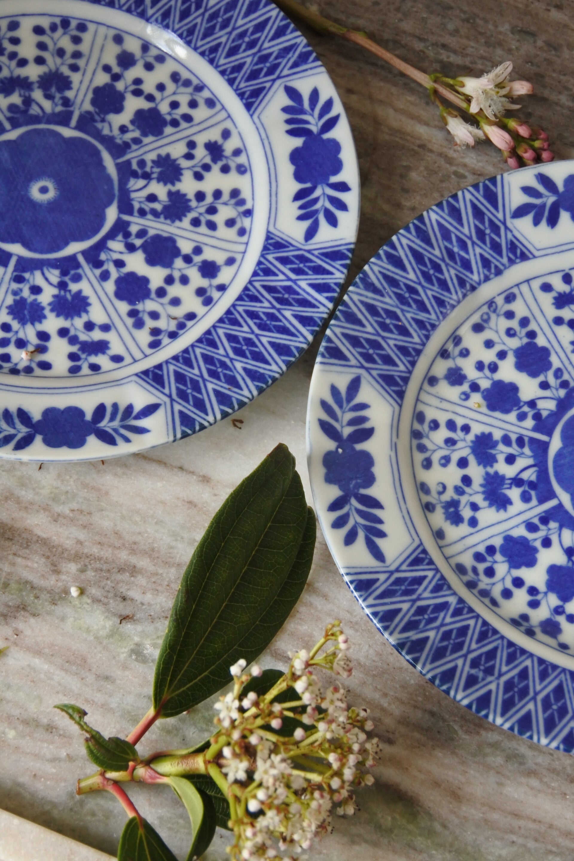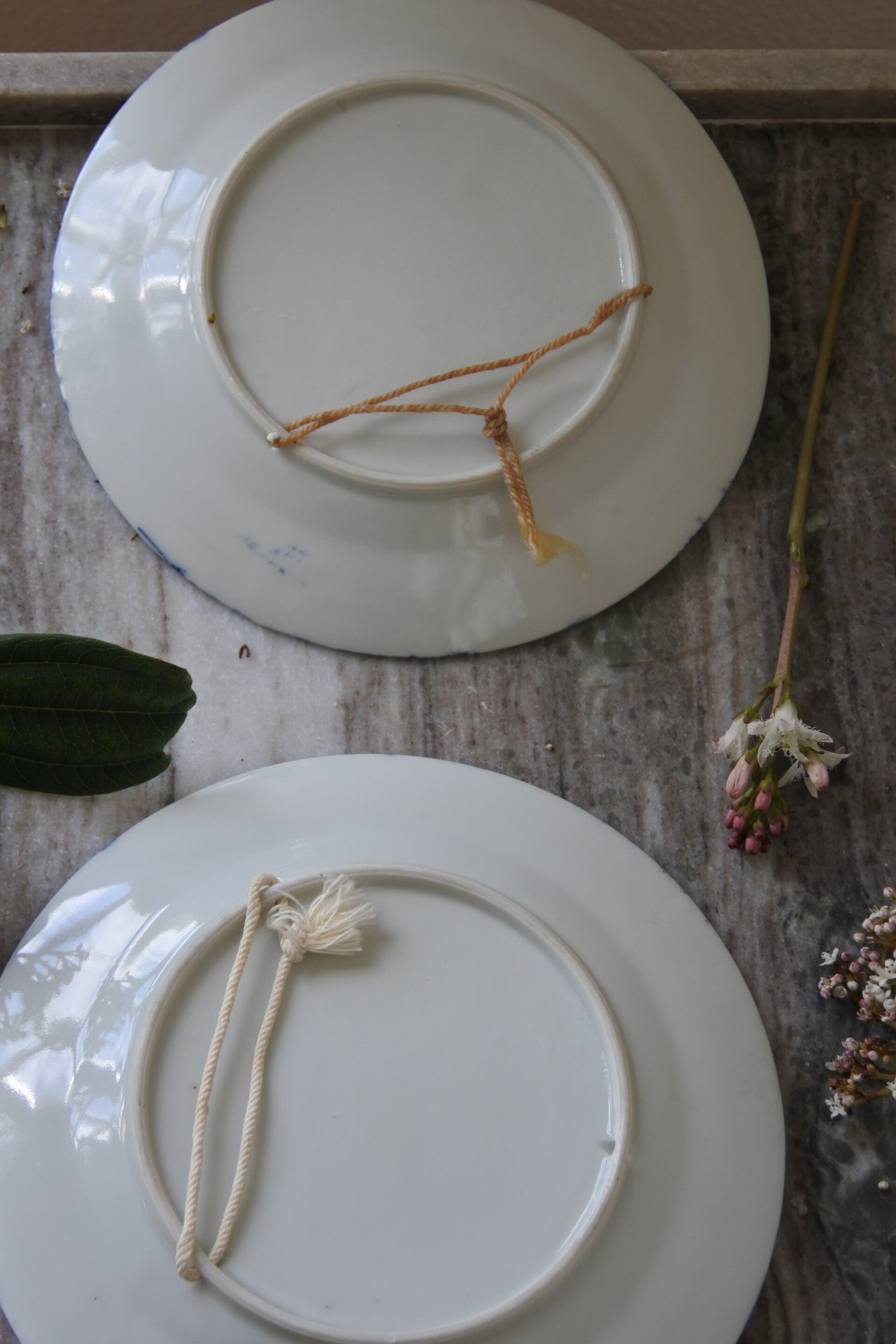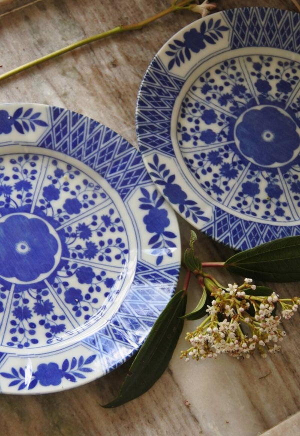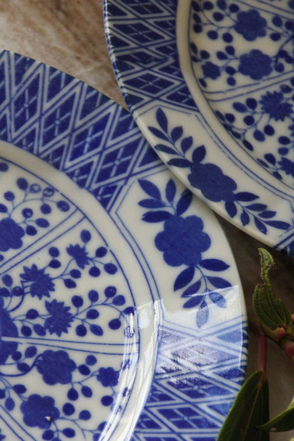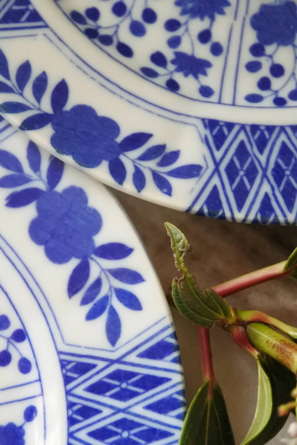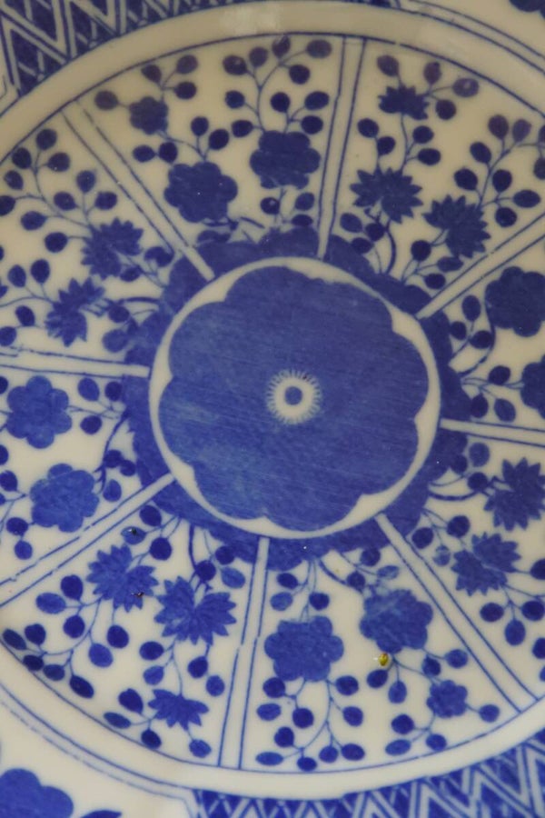 Mooie vintage (vermoeden wij) Chinese wandborden van wit porselein met blauw decor van vrolijke bloemen.
