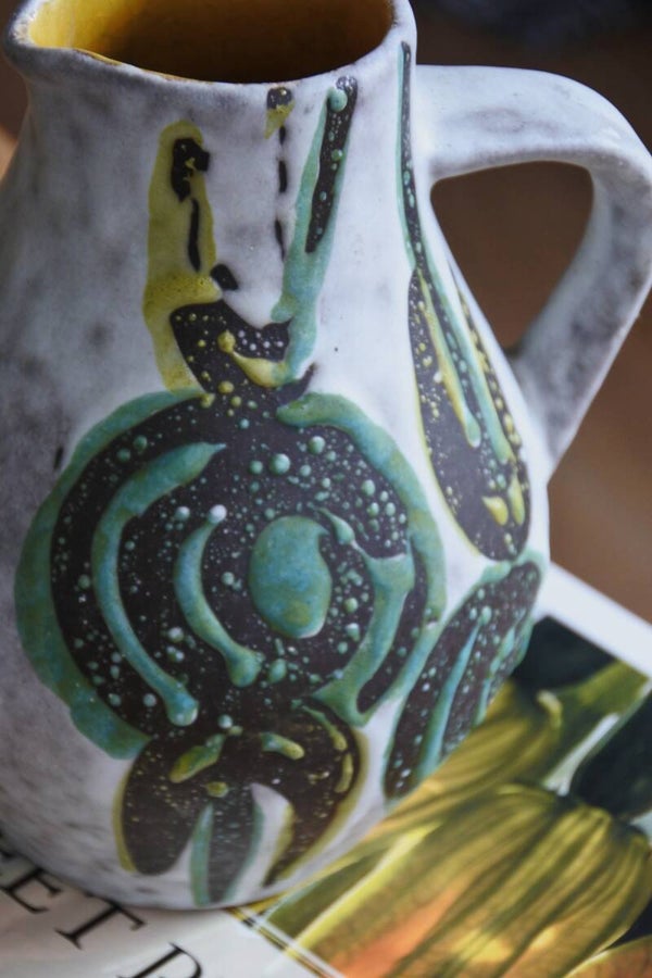 Stunning West Germany vaasje van Scheurich met een prachtig decor in de kleuren groen, geel en zwart op een lichtgrijze ondergrond.