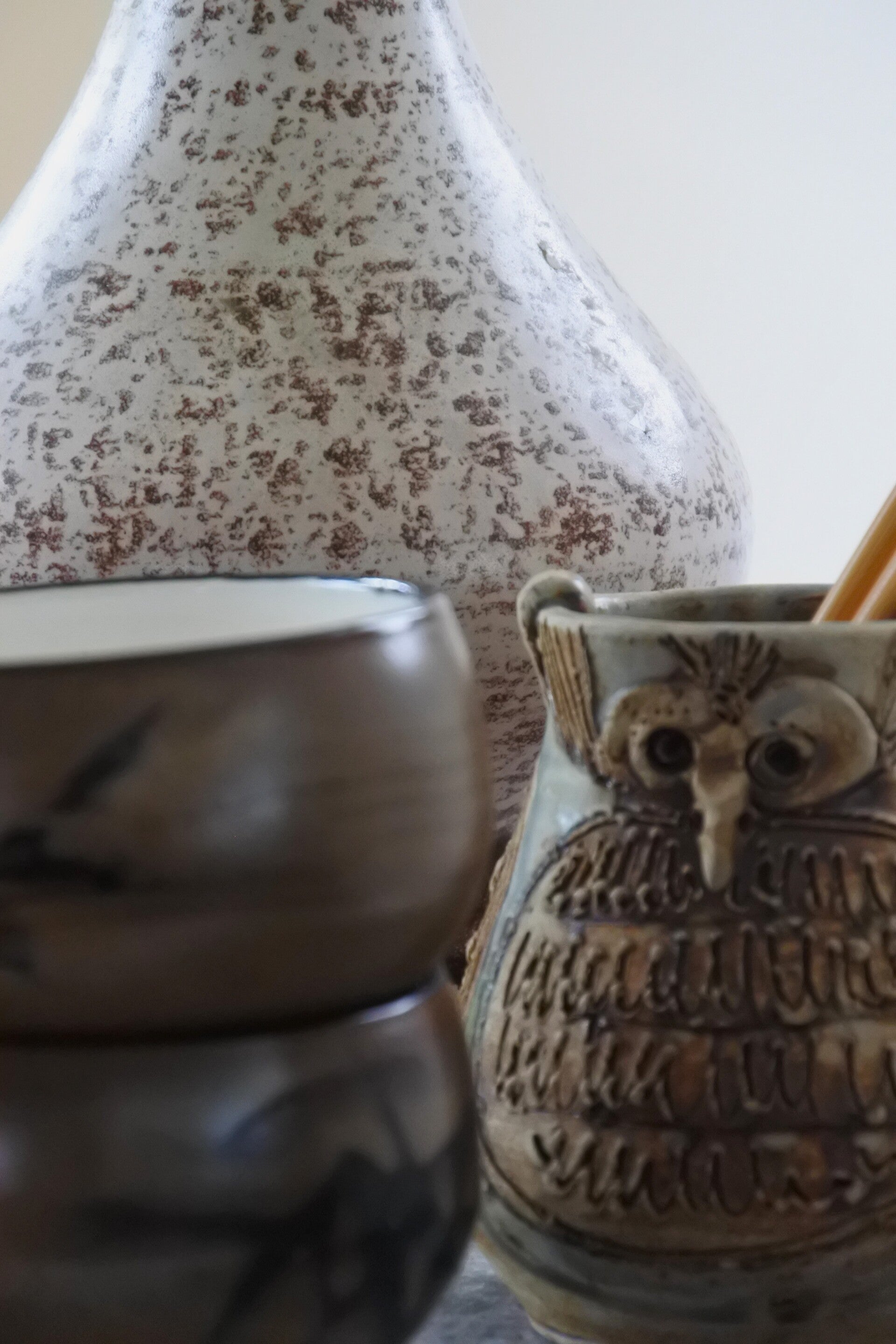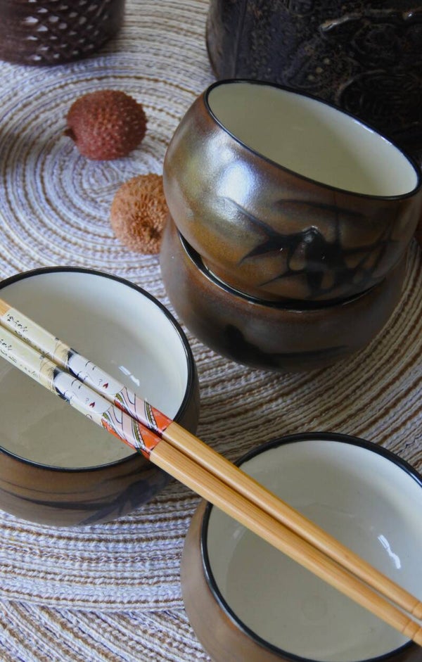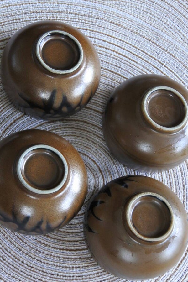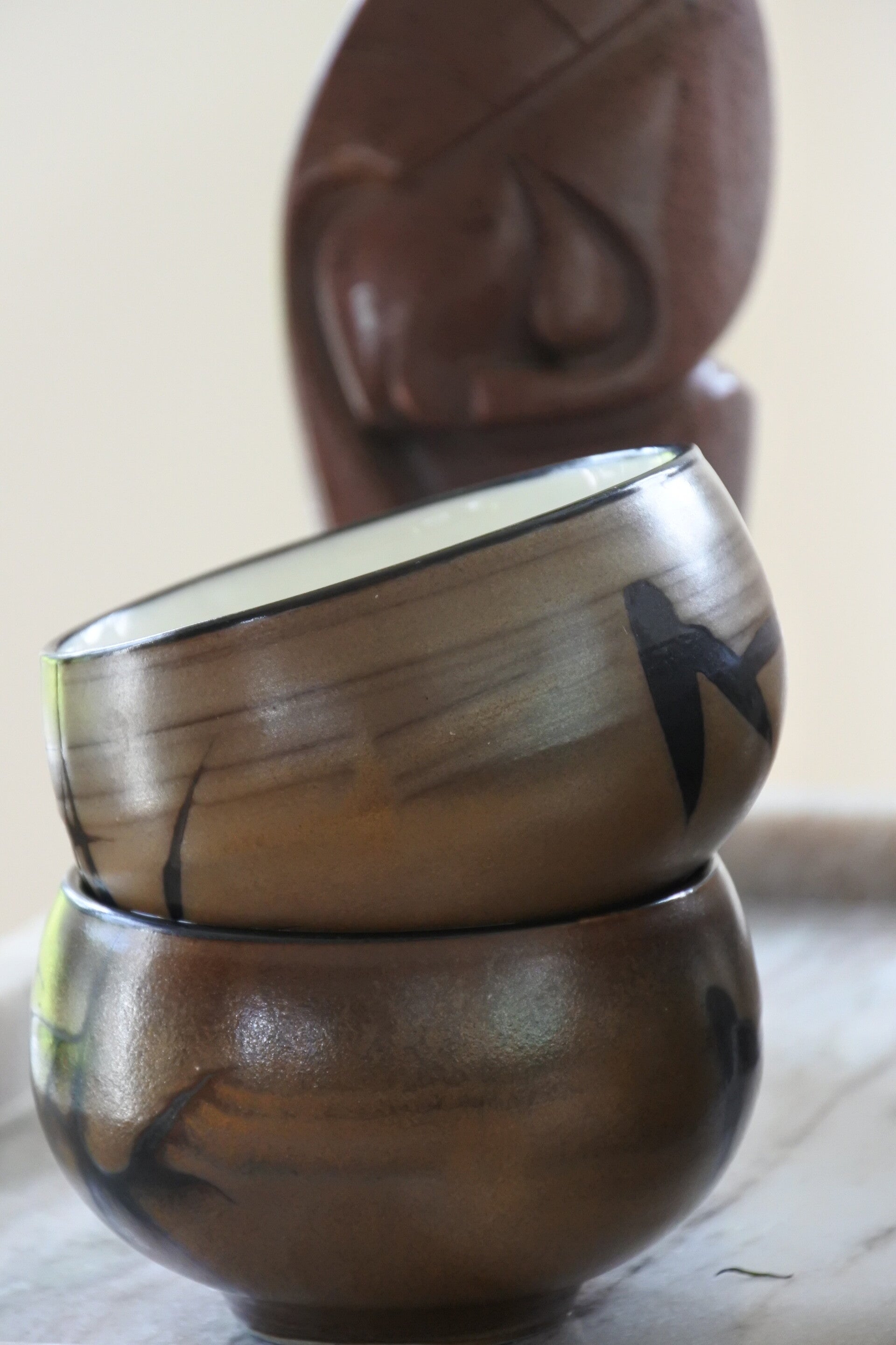 Vintage Aziatische theekopjes - schaaltjes set in Otagiri stijl van wit keramiek (binnenzijde) met prachtige bronskleur, zwartgekleurde tekening en subtiele gouden gloed kleur.