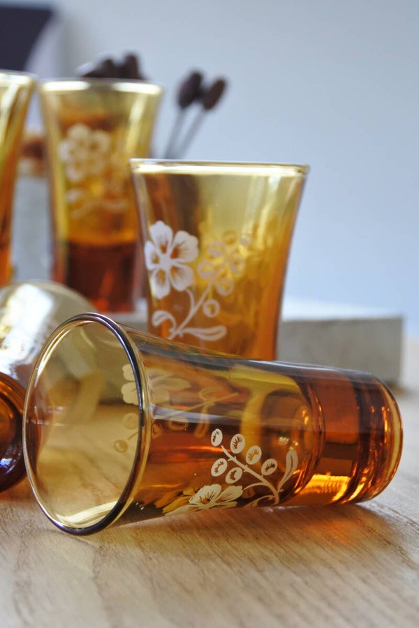 Vintage set van 6 borrelglaasjes in mooie amberkleur met witte 60's bloemetjes. Die smeken toch om een shotje amaretto? oftewel.. to cute to be empty.
