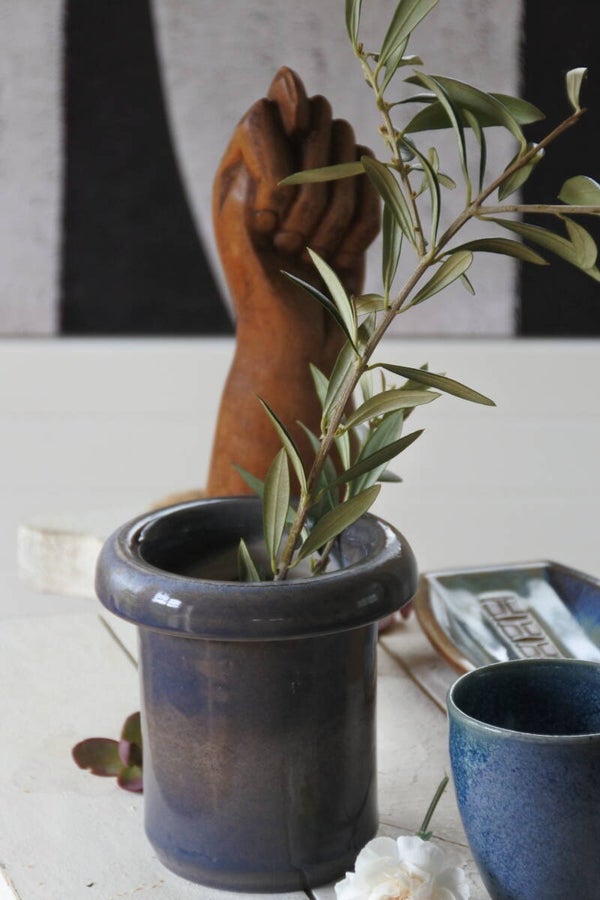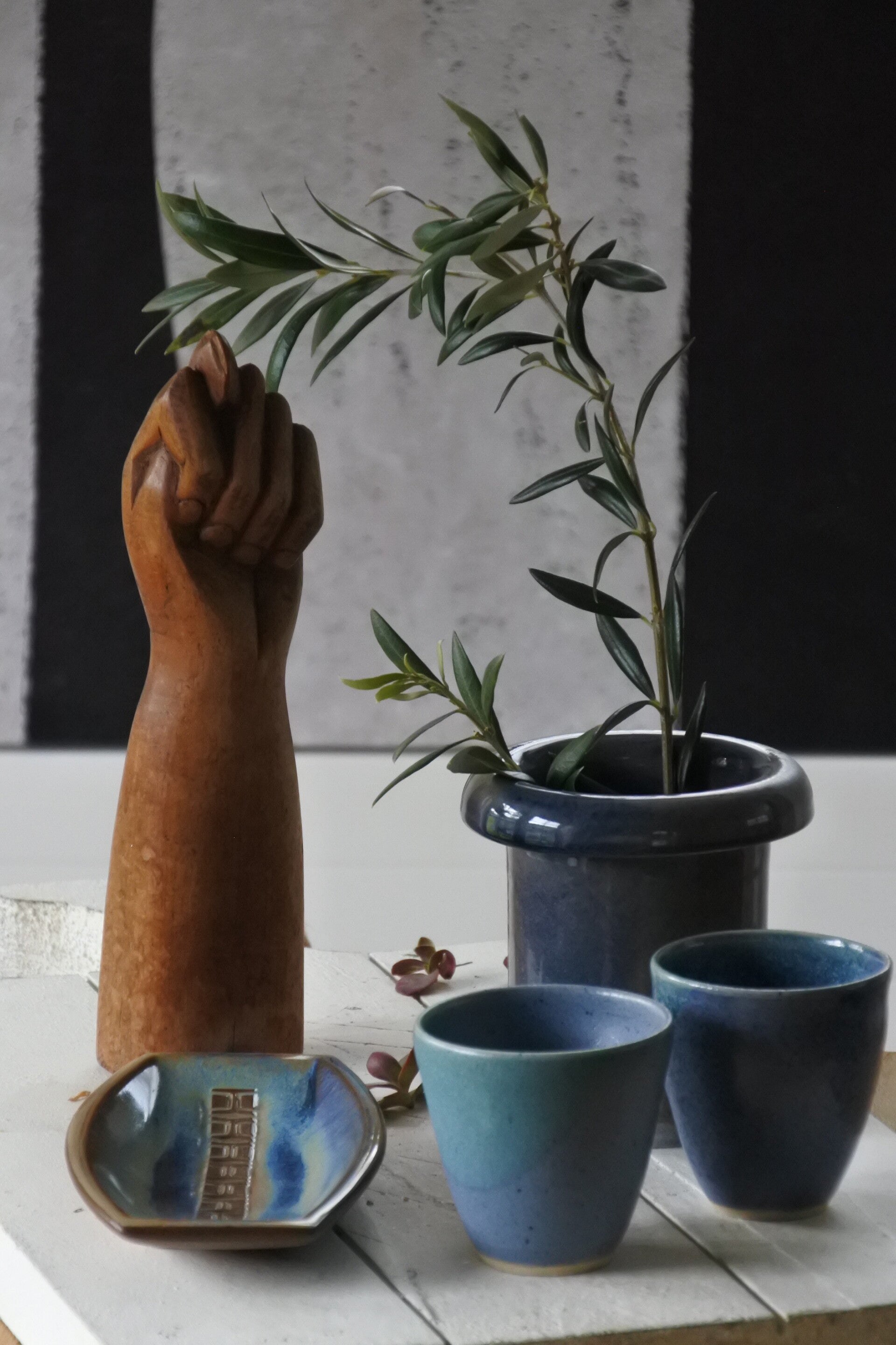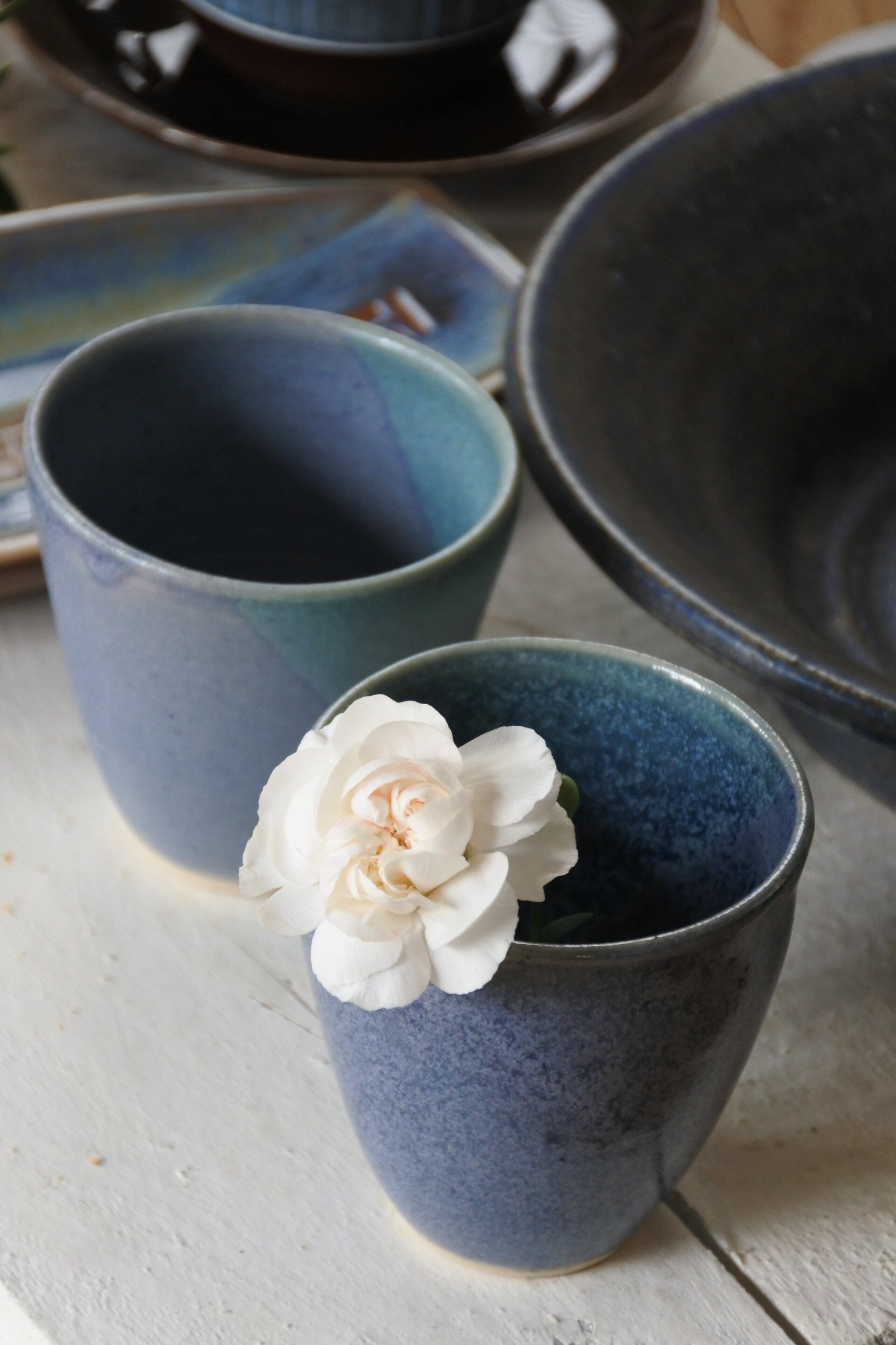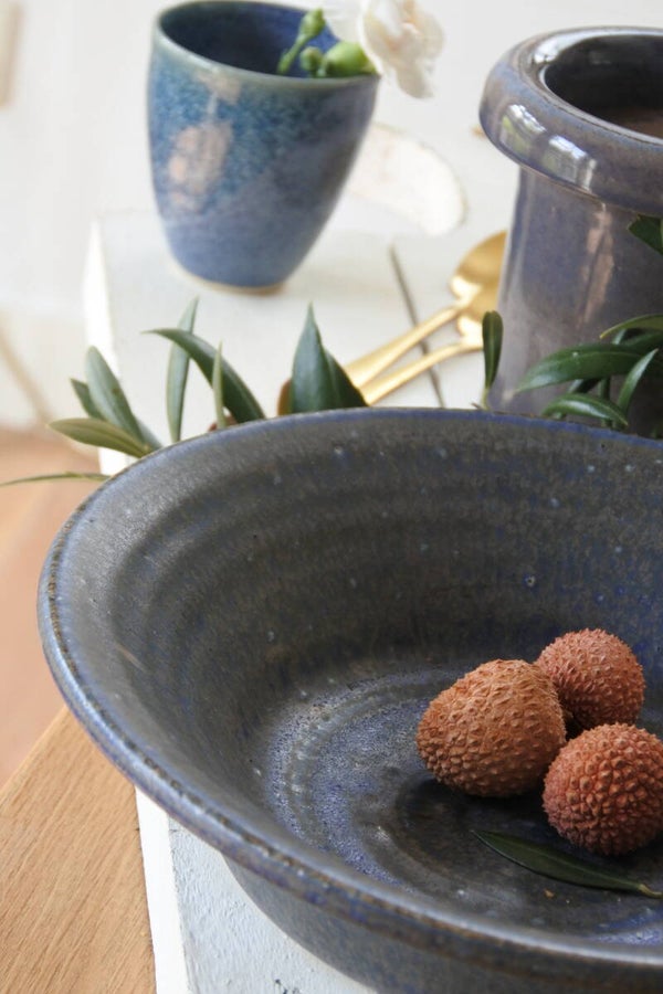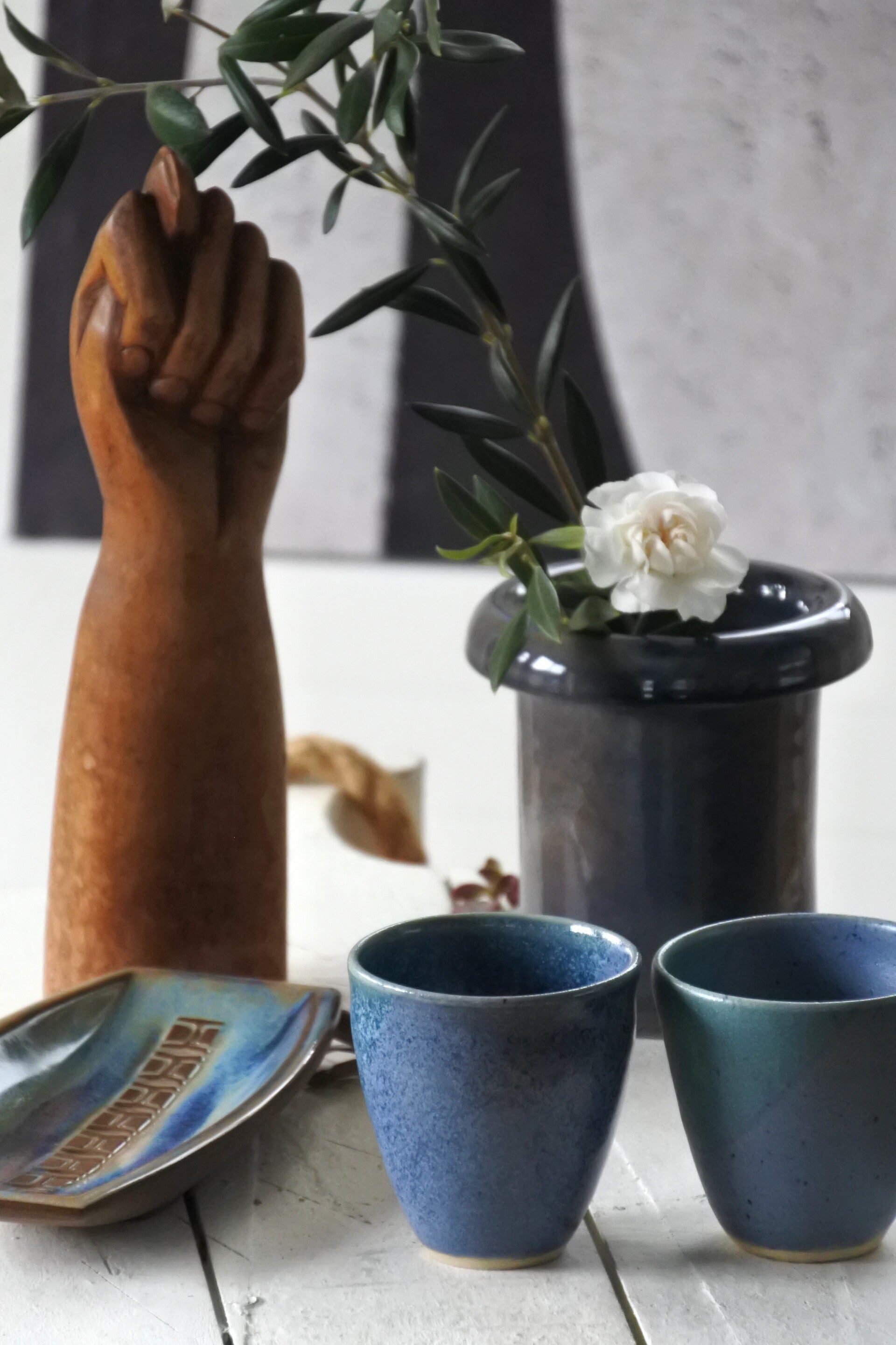 Vintage setje studio pottery mokjes-schaaltjes in prachtig blauw decor