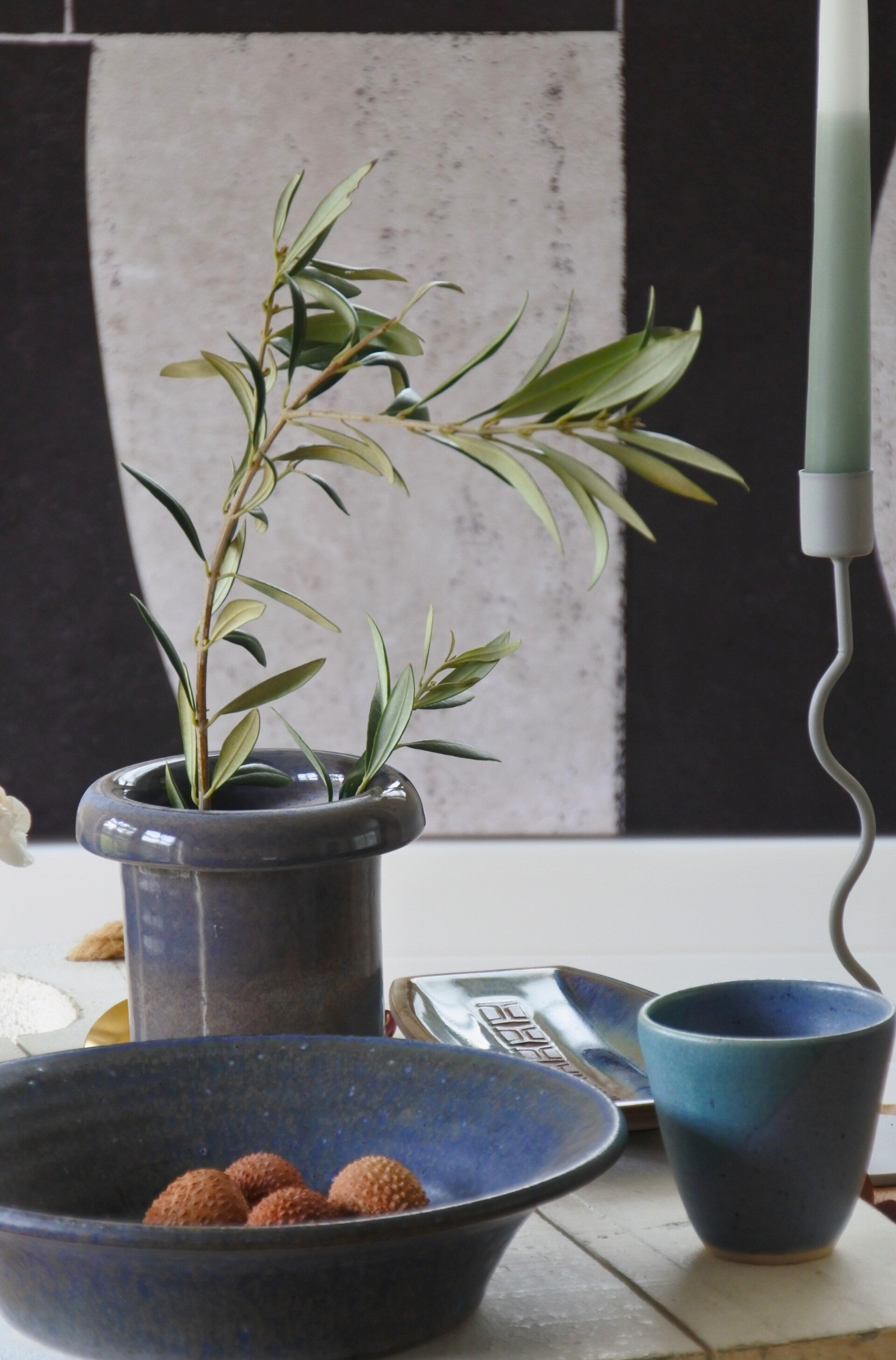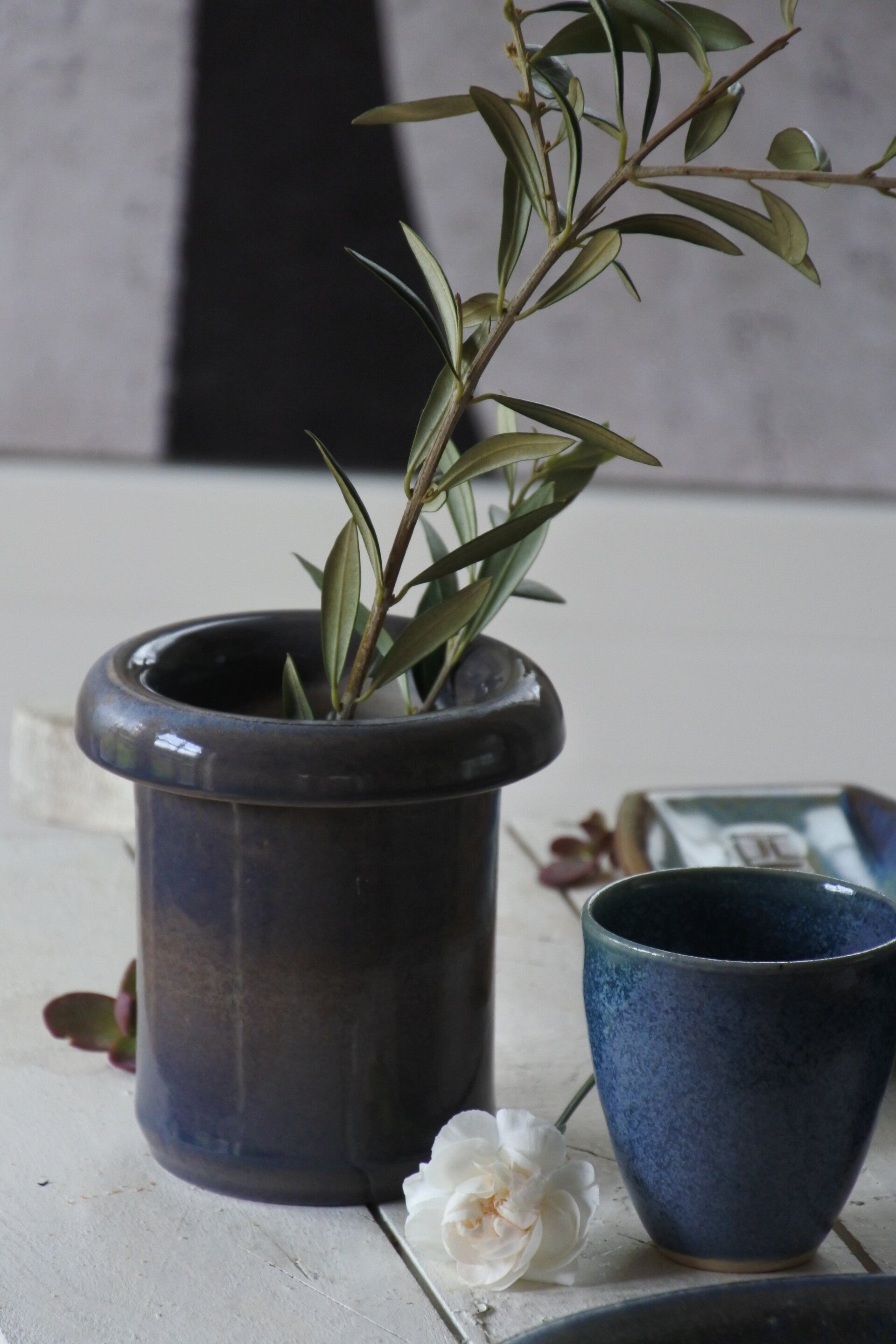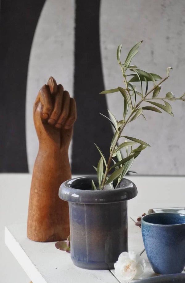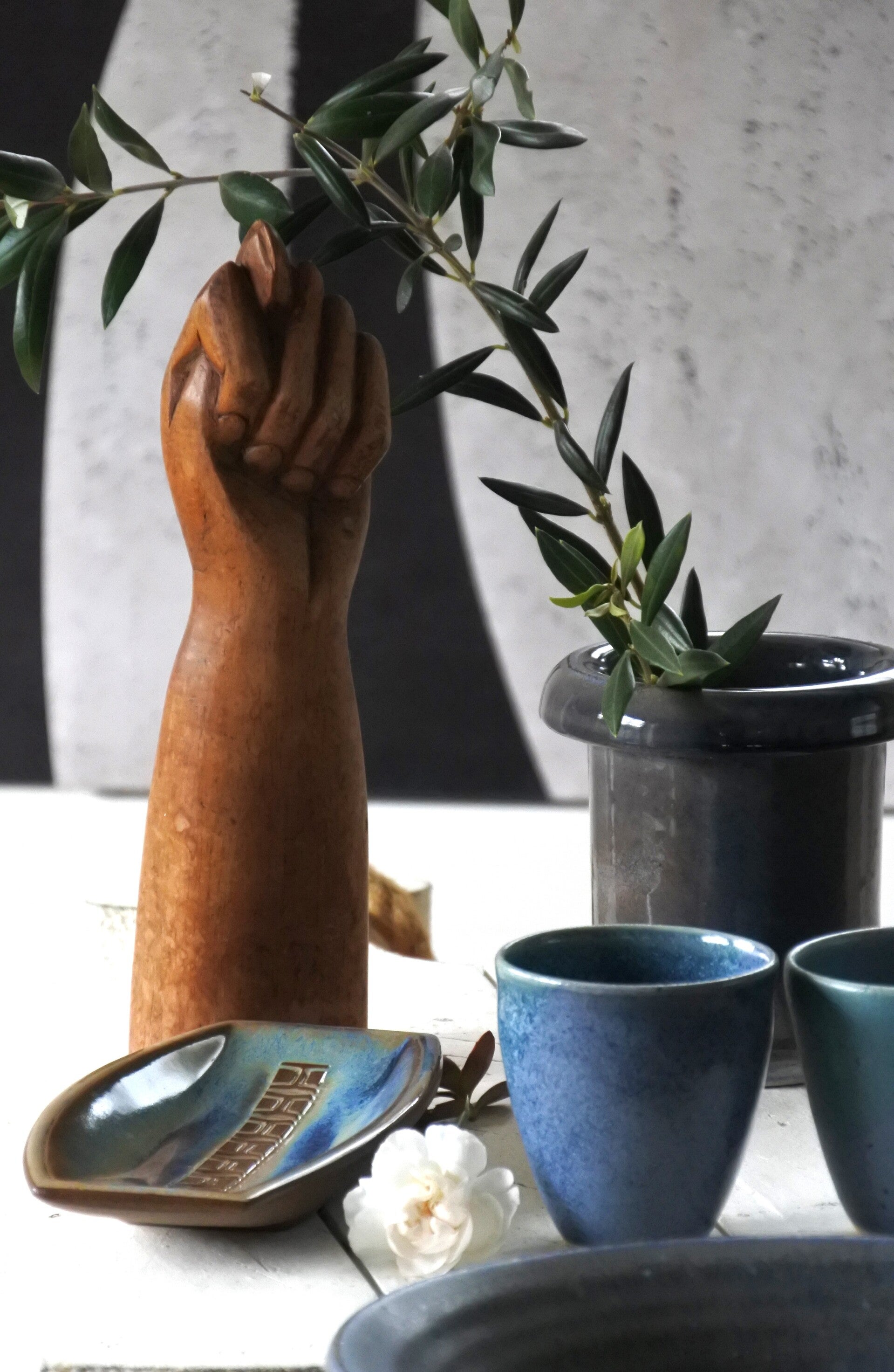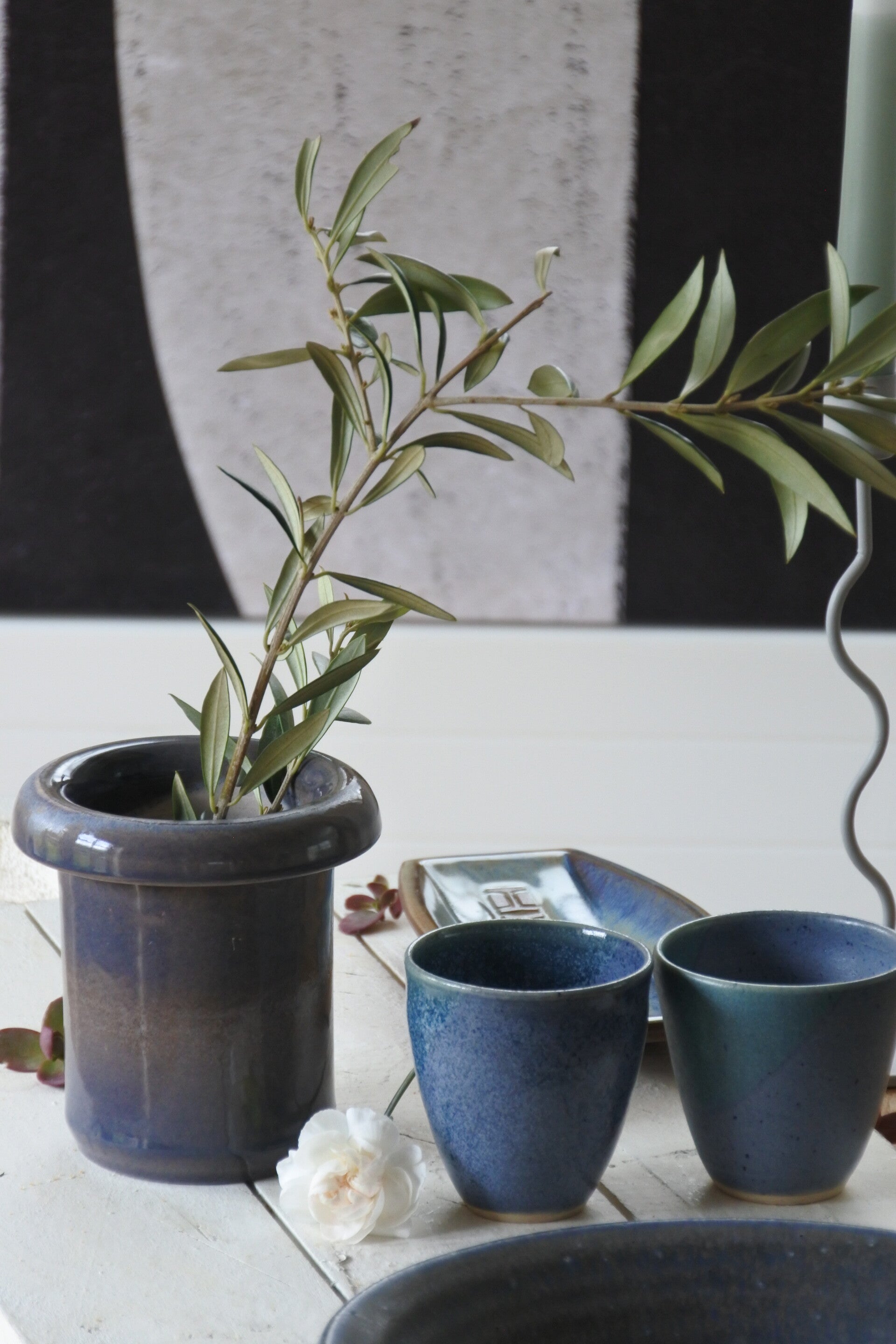 Vintage setje studio pottery mokjes-schaaltjes in prachtig blauw decor