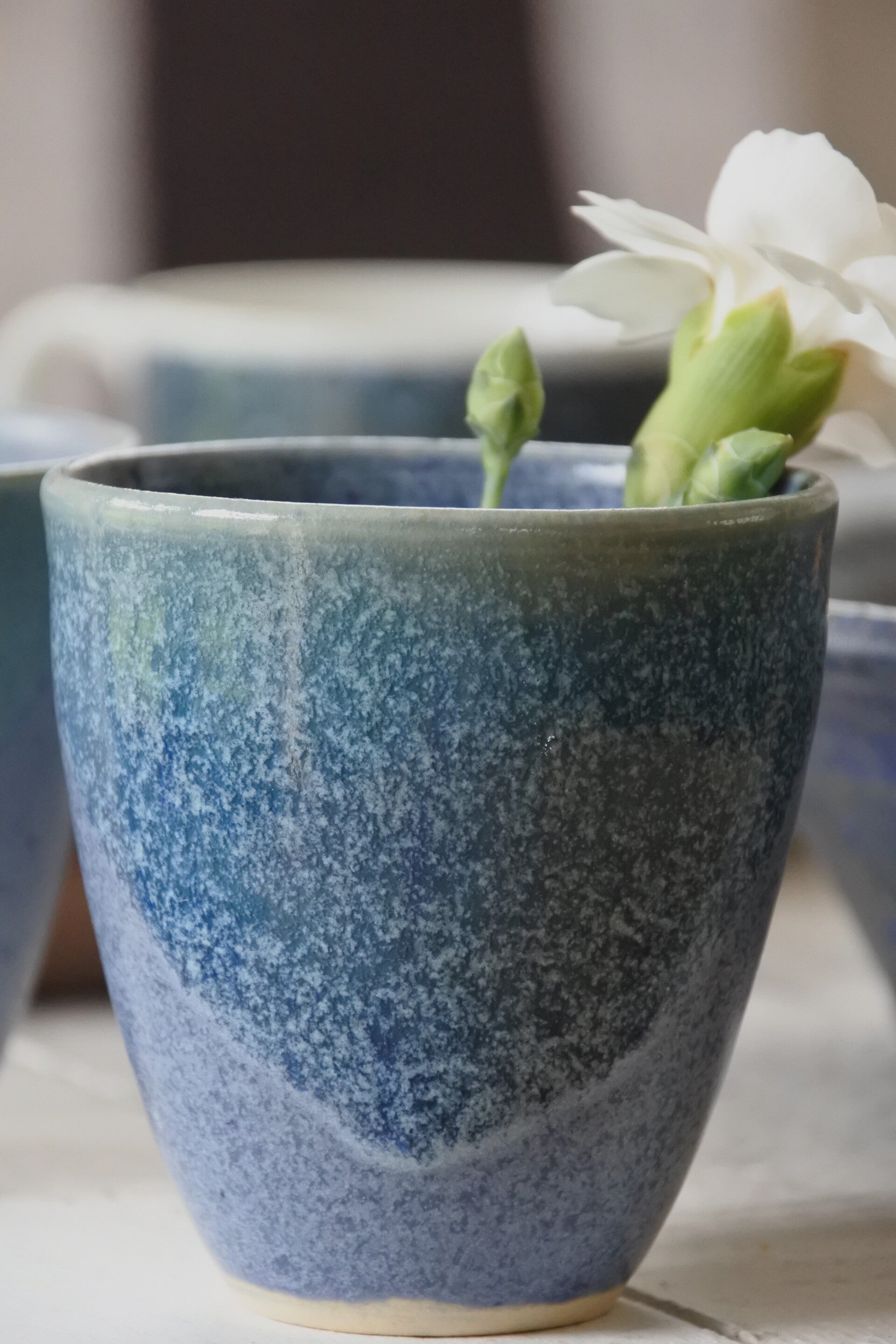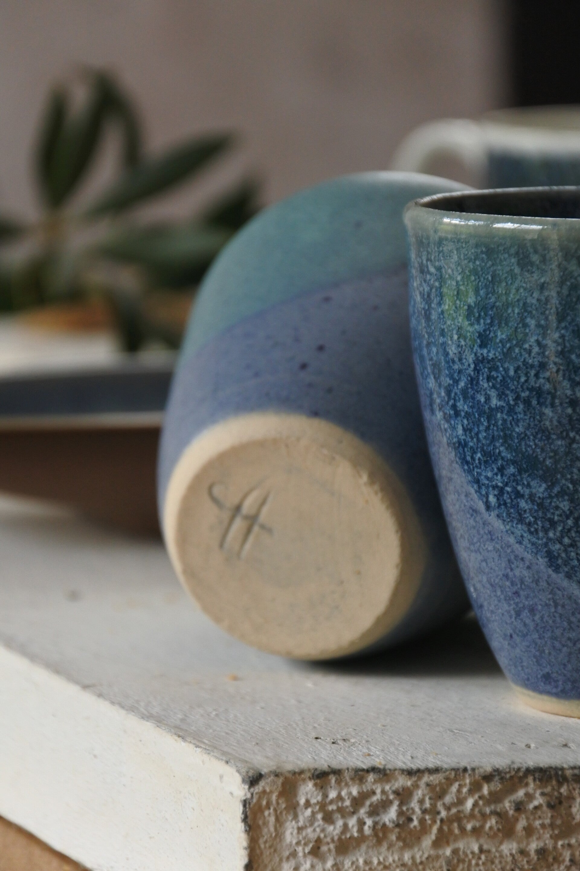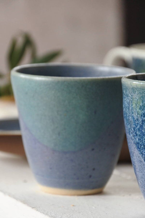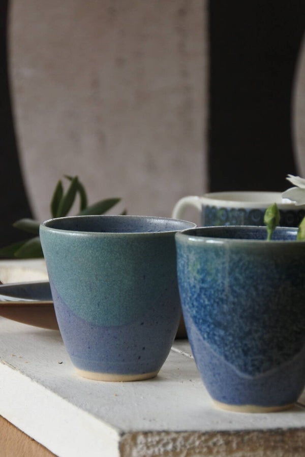 Set van 2 mooie vintage handgebakken mokjes van keramiek in een zachtblauwe kleur met mat en glanzend glazuur welke vakkundig is opgelegd lijkt het wel! ze zijn elk net even anders maar zijn overduidelijk wel een set.