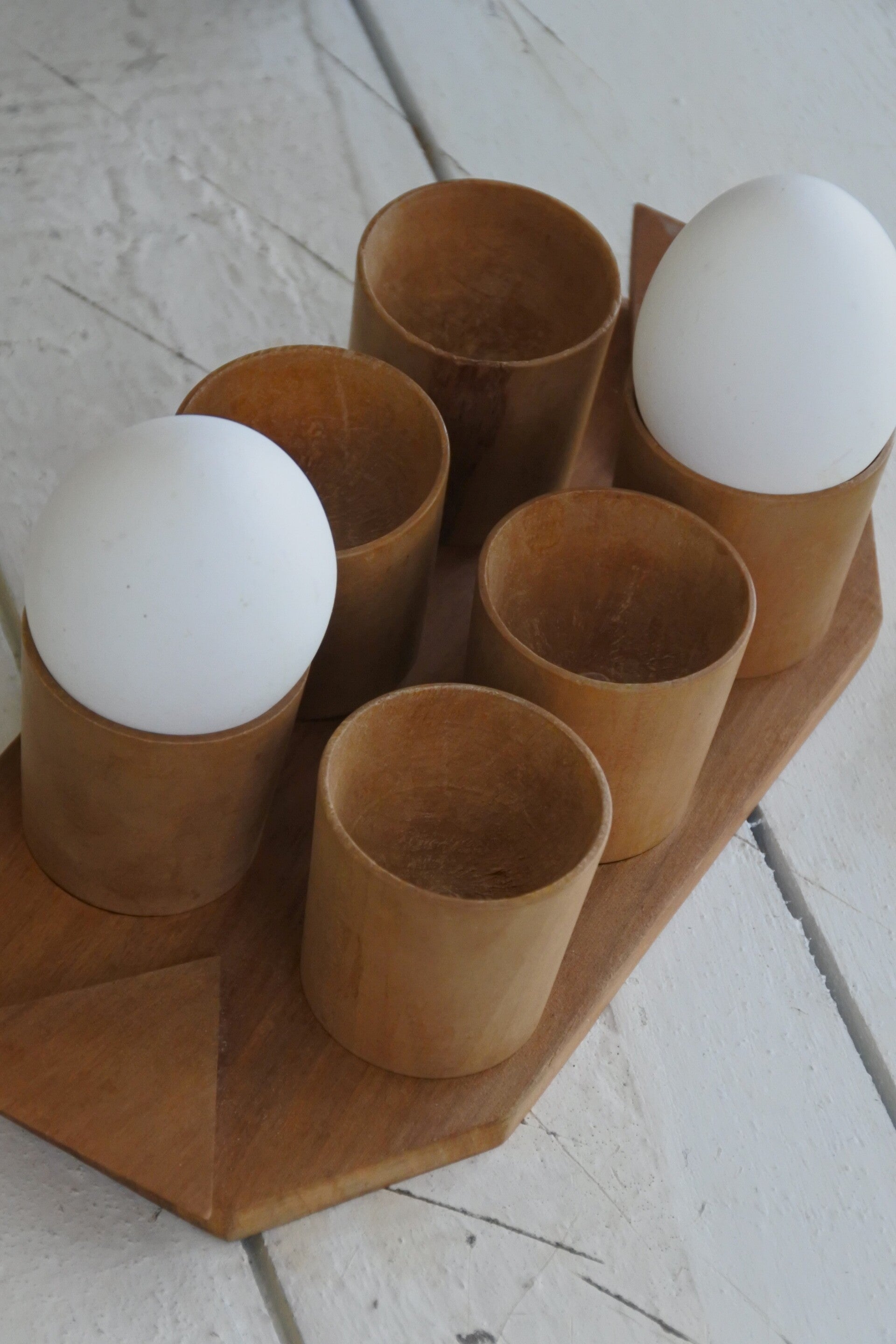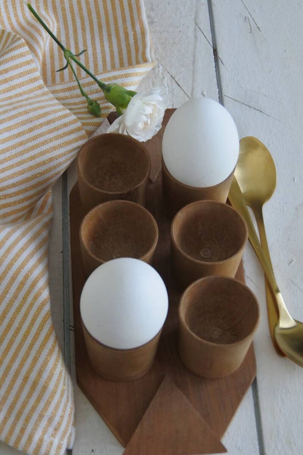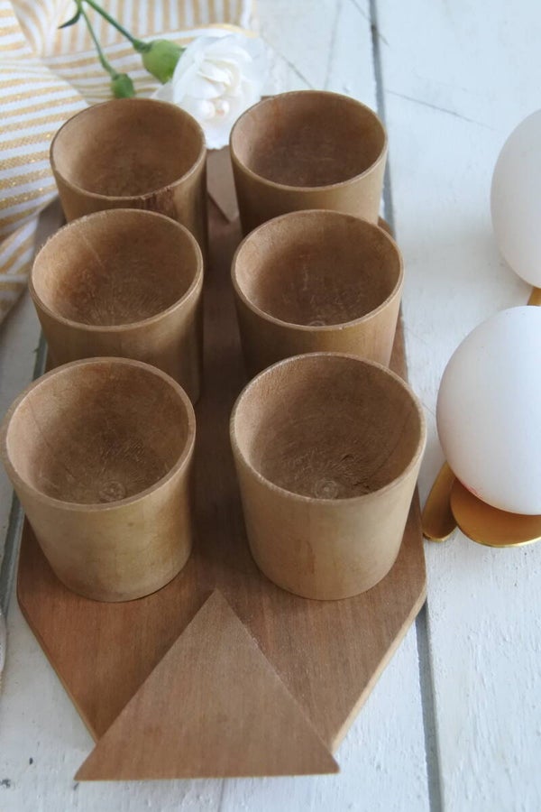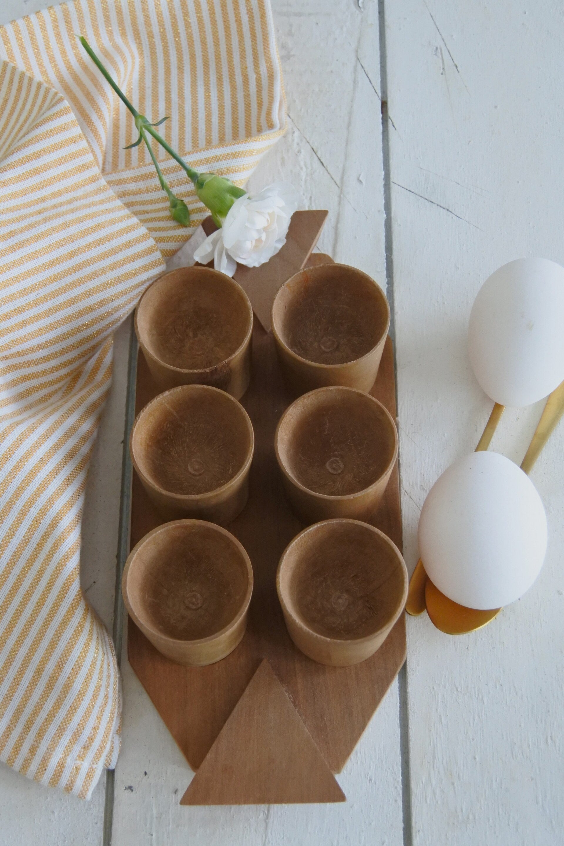 Leuke tijdloze set van 6 houten eierdoppen met bijbehorende tevens houten serveerschaal.