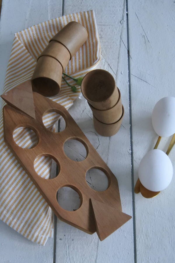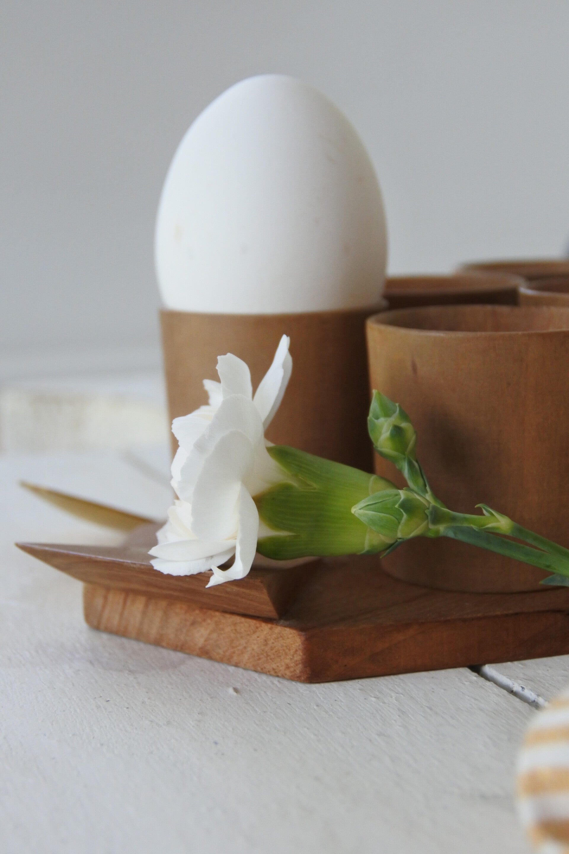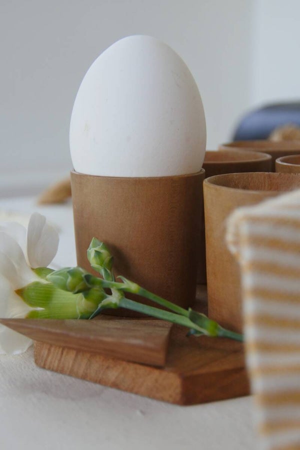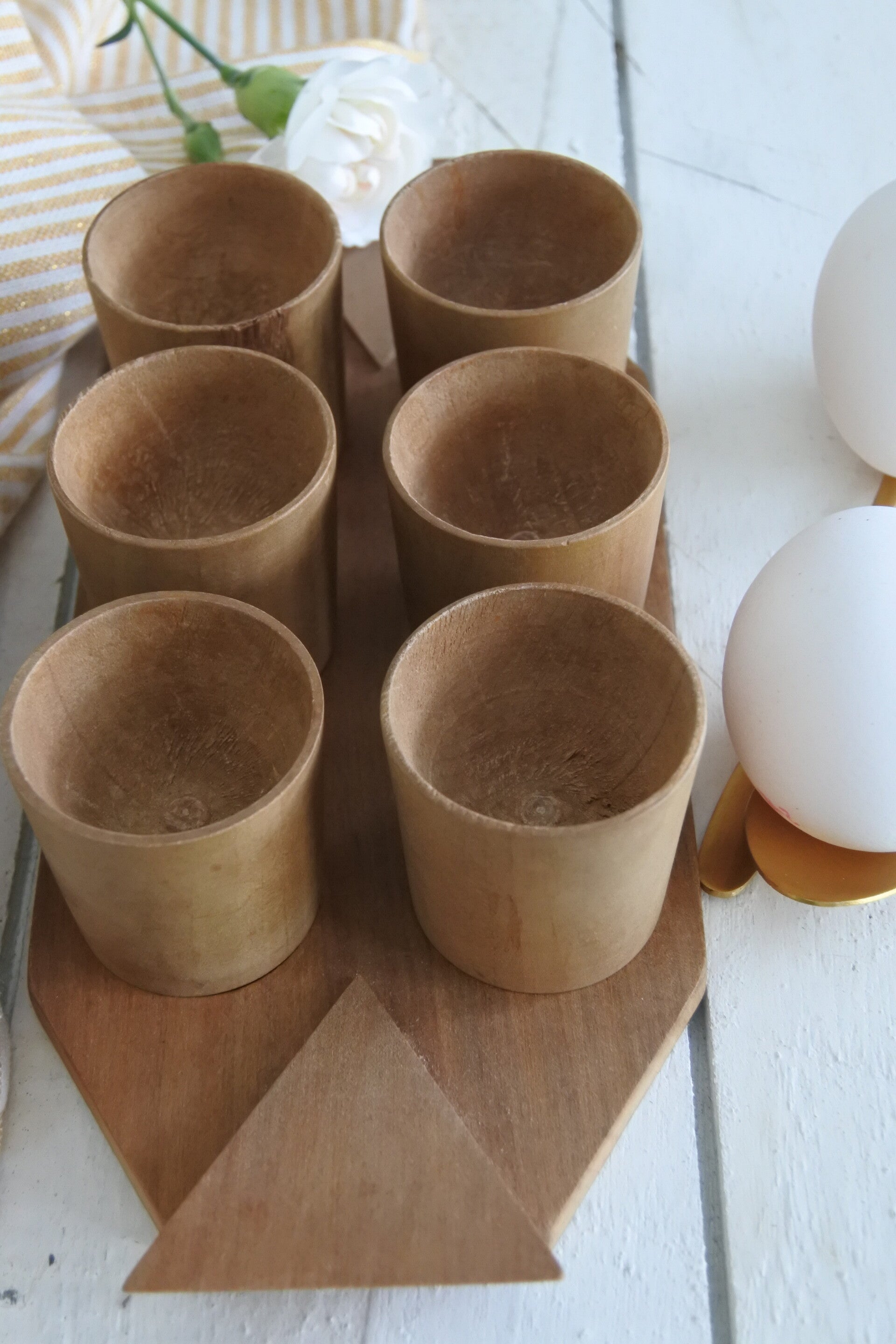 Leuke tijdloze set van 6 houten eierdoppen met bijbehorende tevens houten serveerschaal.