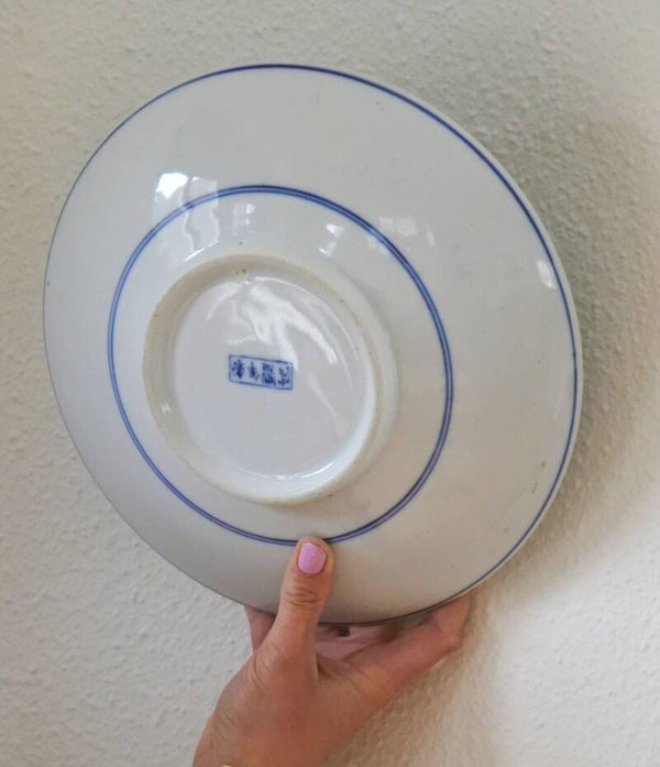 Prachtig (we vermoeden Chinees) wandbord- schaal van wit porselein met blauwe bloemen en gaatje aan de achterzijde om hier een bevestigingstouwtje naar wens doorheen te halen maar met een bordenhanger hangt deze mooierd misschien nog wel beter. Je kunt de schaal uiteraard ook gewoon gebruiken als mooie serveerschaal natuurlijk!