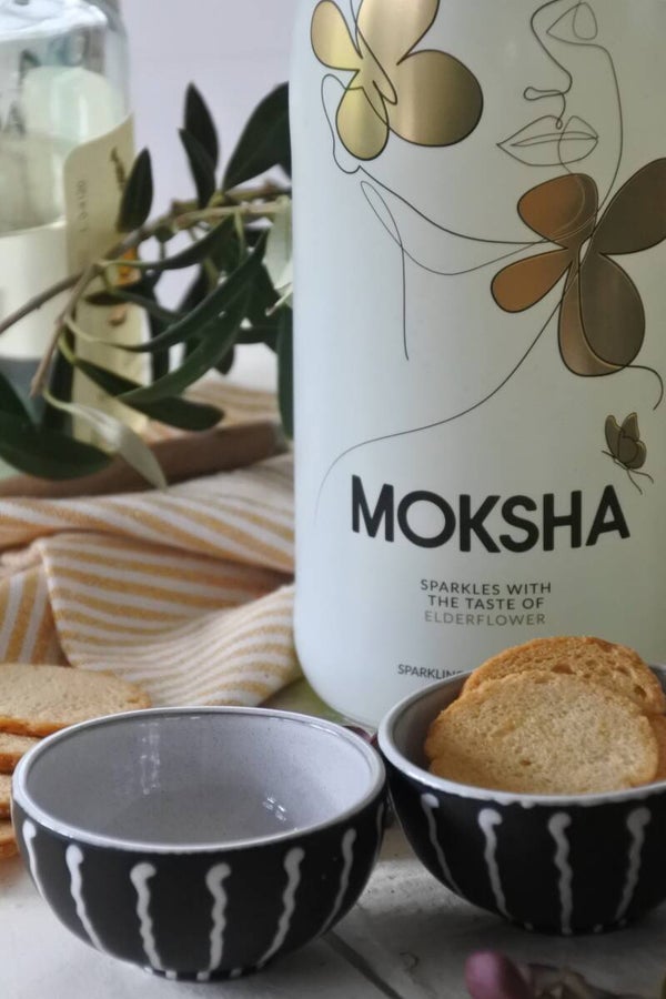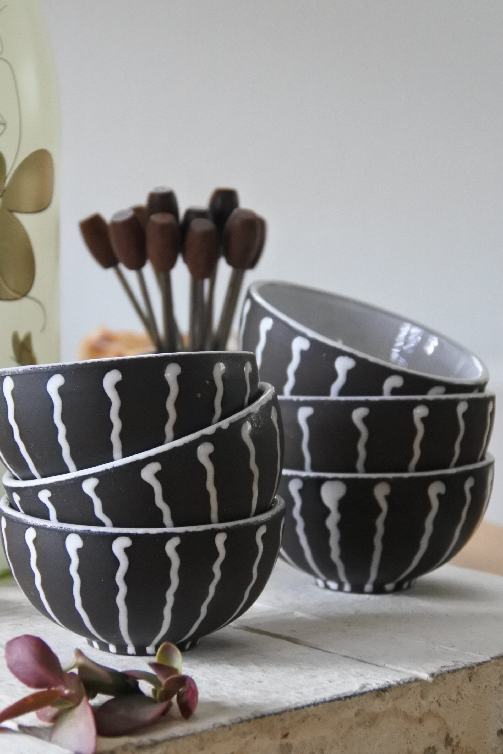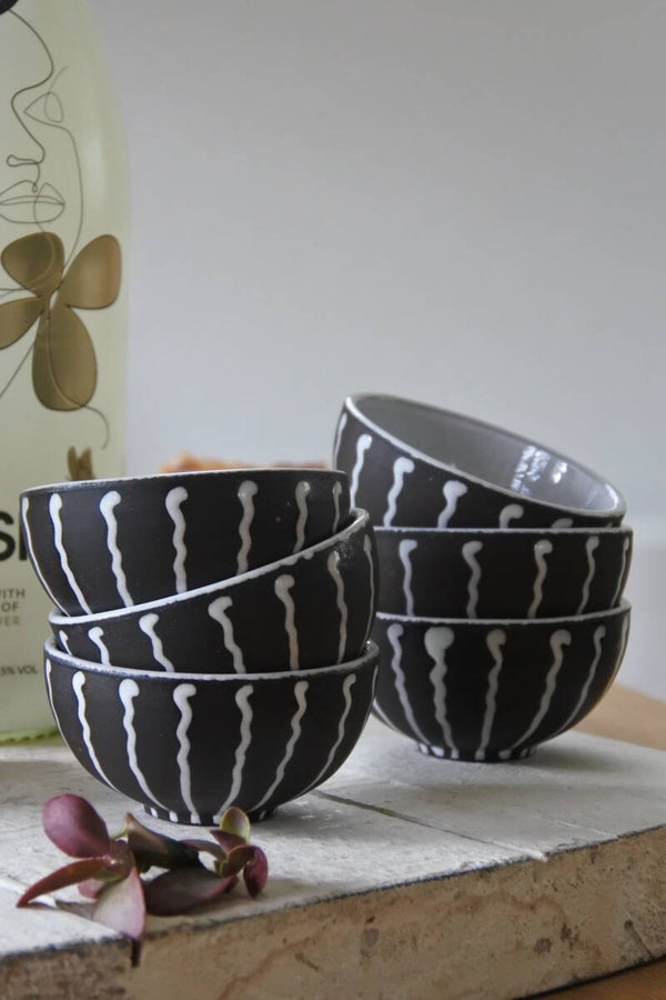 Super leuke vintage set van 6 kleine schaaltjes van bruin aardewerk met witte streepjes rondom en een wit geglazuurde binnenzijde. Deze schaaltjes zijn perfect voor op je borrelplank of voor je tapasavond!