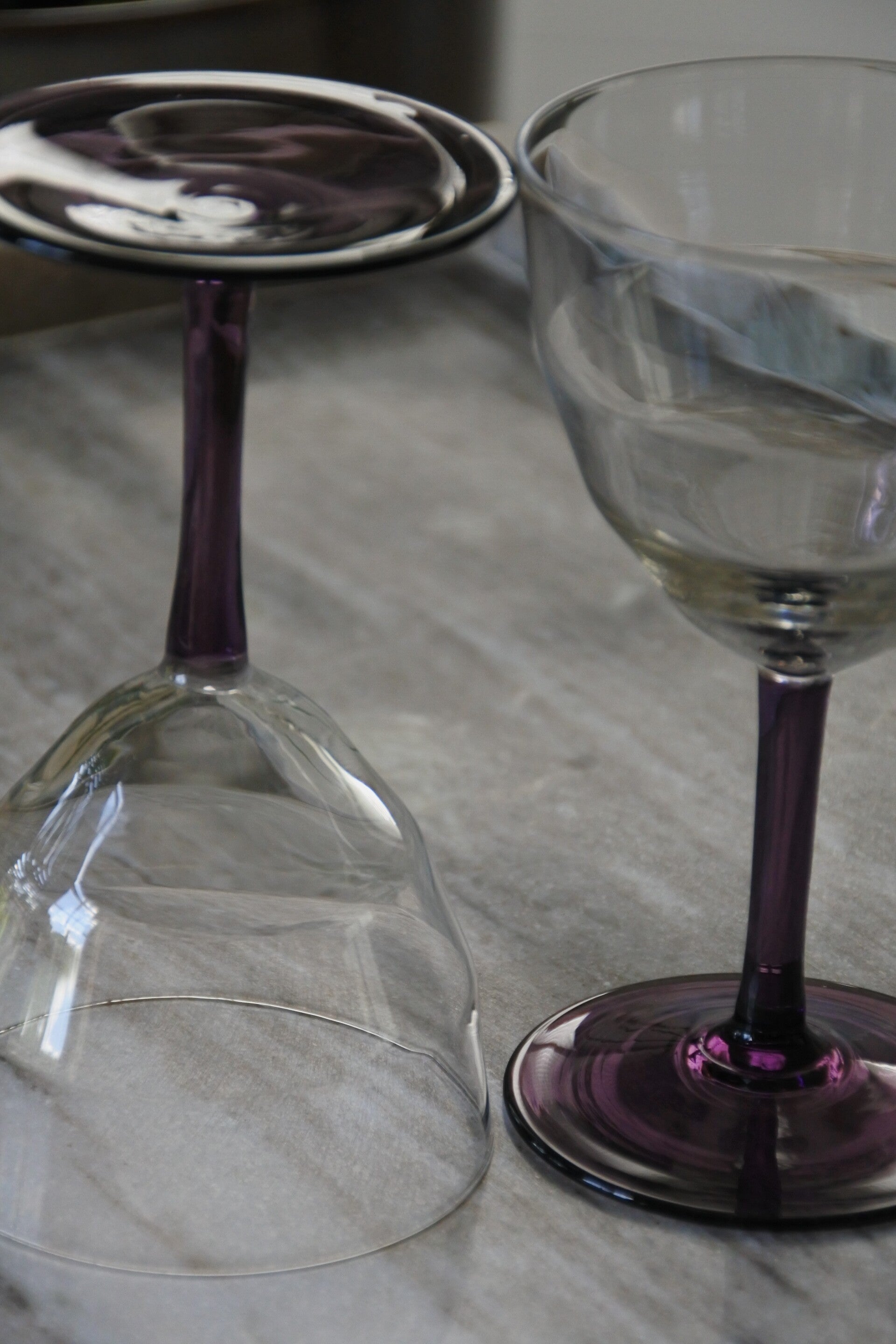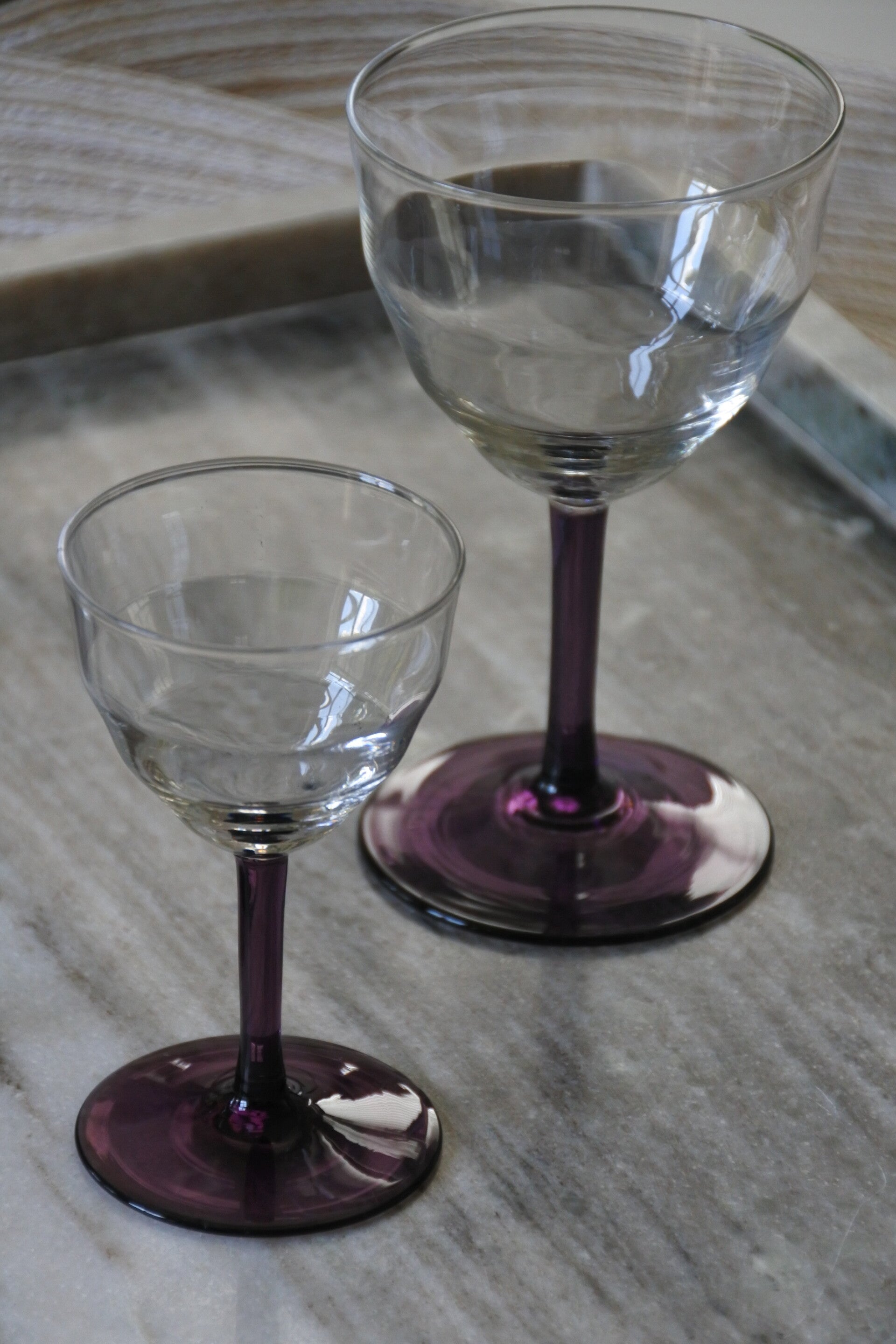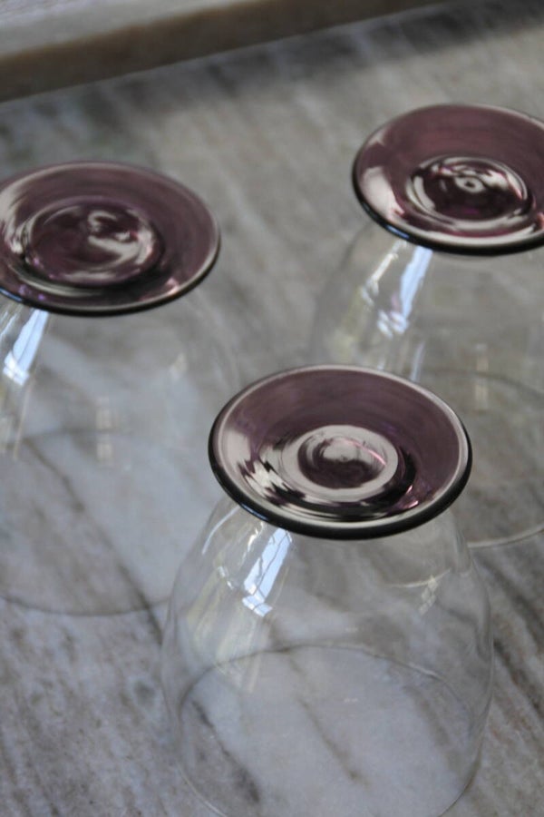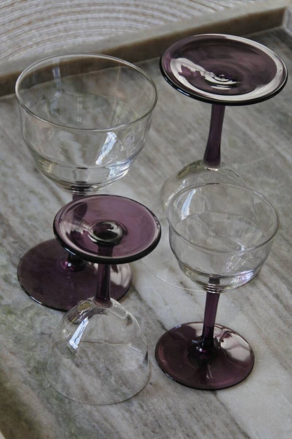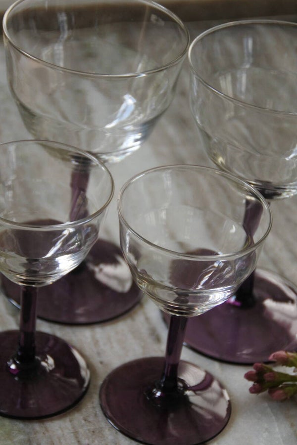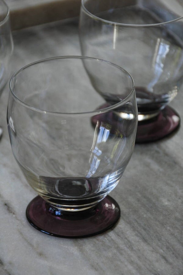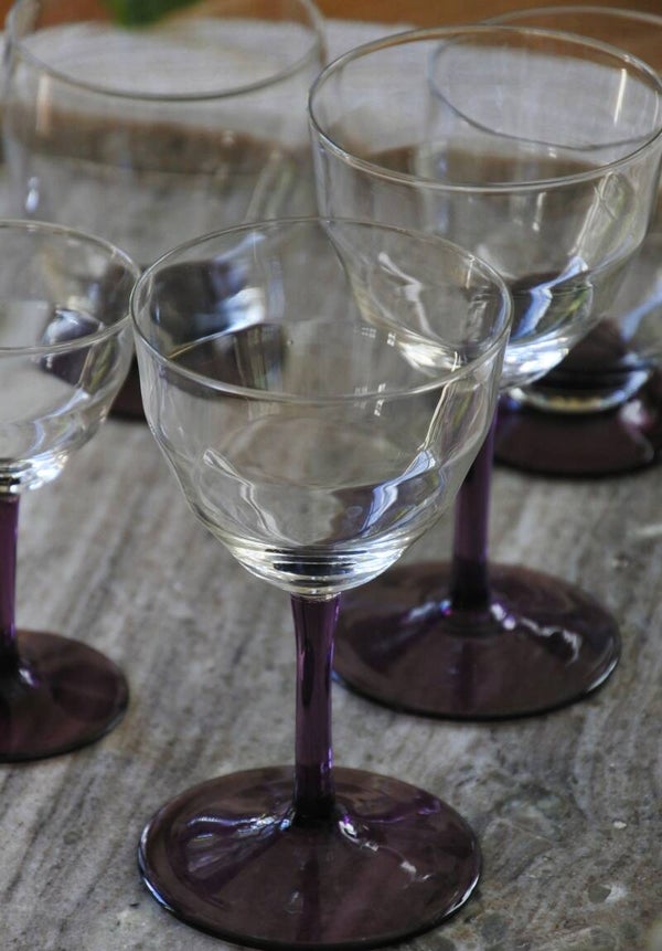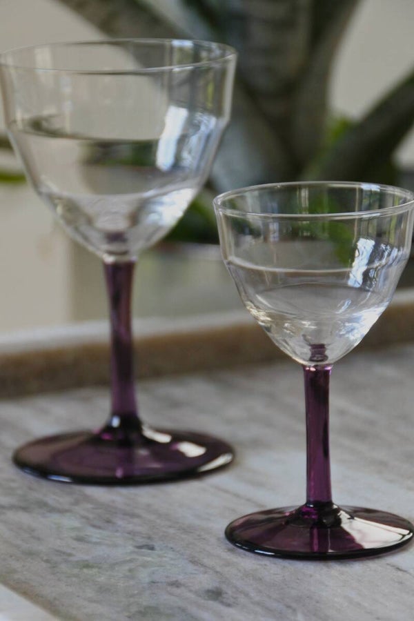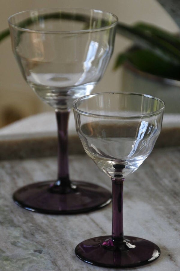 Prachtige en zeldzame antieke set art deco likeur- of wijnglaasjes ontworpen door WJ (Willem Jacob) Rozendaal voor deKristalunie, Maastricht Nederland. Dit ontwerp komt al(!!) uit 1929 uit de Art Deco periode en draagt de naam Logo's. Als je het ons vraagt is dit toch ech een tijdloos mooi ontwerp door de vorm van de glaasjes en het mooie paars gekleurde voetje. We hebben de glaasjes in 3 modellen verkrijgbaar; het bolmodel voor een cognac-je, het borrel model laag voor bijvoorbeeld een likeurtje en het borrelmodel hoog voor bijvoorbeeld een portje. Maar al schenk je er een appelsapje in.. het wordt allemaal een feestje in deze glazen! ;)